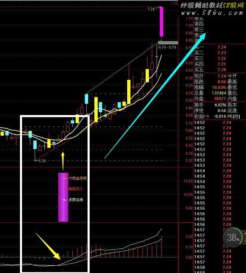 VAR1:=REF(LOW,1);VAR2:=(SMA(ABS(LOW-VAR1),13,1))/(SMA(MAX(LOW-VAR1,0),13,1))*4;VAR3:=EMA(VAR2,13);VAR4:=LLV(LOW,34);VAR5:=EMA(IF(LOW<=VAR4,VAR3,0),3);VAR6:=100-3*SMA((CLOSE-LLV(LOW,75))/(HHV(HIGH,75)-LLV(LOW,75))*100,20,1)+2*SMA(SMA((CLOSE-LLV(LOW,75))/(HHV(HIGH,75)-LLV(LOW,75))*100,20,1),15,1);VAR7:=100-3*SMA((OPEN-LLV(LOW,75))/(HHV(HIGH,75)-LLV(LOW,75))*100,20,1)+2*SMA(SMA((OPEN-LLV(LOW,75))/(HHV(HIGH,75)-LLV(LOW,75))*100,20,1),15,1);VAR8:=VAR6<REF(VAR7,1) AND VOL>REF(VOL,1) AND CLOSE>REF(CLOSE,1);STICKLINE(VAR8 AND COUNT(VAR8,18)=1,0,18,8,0),COLORAA00BB;{粉色住}STICKLINE(VAR8 AND COUNT(VAR8,18)=1,0,18,8,0),COLORBB11BB;STICKLINE(VAR8 AND COUNT(VAR8,18)=1,0,18,5,0),COLORCC22BB;STICKLINE(VAR8 AND COUNT(VAR8,18)=1,0,18,3,0),COLORDD33BB;STICKLINE(VAR8 AND COUNT(VAR8,18)=1,0,18,1,0),COLOREE44BB;DRAWTEXT(VAR8 AND COUNT(VAR8,18)=1,16,'●↙大资金进场'),COLOR0099FF;DRAWTEXT(VAR8 AND COUNT(VAR8,18)=1,12,'●↙择机买入'),COLOR0033FF;DRAWTEXT(VAR8 AND COUNT(VAR8,18)=1,8,'●↙多数会涨'),COLORFFFFAA; |