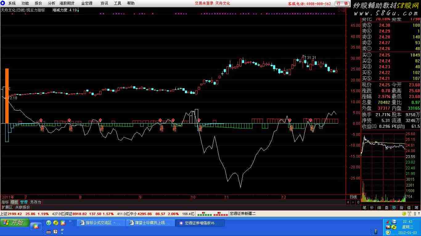var2:=REF(LOW,1); Var3:=SMA(ABS(LOW-Var2),13,1)/SMA(MAX(LOW-Var2,0),13,1)*100; Var4:=EMA(IF(CLOSE*1.2,Var3*13,Var3/13),13); Var5:=LLV(LOW,34); Var6:=HHV(Var4,34); Var7:=IF(LLV(LOW,56),1,0); Var8:=EMA(IF(LOW<=Var5,(Var4+Var6*2)/2,0),3)/618*Var7; Var9:=EMA(CLOSE,5); Var10:=(CLOSE-MA(CLOSE,34))/MA(CLOSE,34)*(-10); Var11:=EMA(IF(LOW<=Var5,(Var4+Var6*2)/2,0),3)/618*Var7*(-1); Var12:=EMA(CLOSE,5)*(-1); STICKLINE(Var12<REF(Var12,1),0,Var12*0.08,4,1),color10E410; STICKLINE(Var9<REF(Var9,1),0,Var9*0.08,4,1),color1010FF; STICKLINE(Var8>REF(Var8,1),0,Var8,4,1),color10FFFF,linethick0; STICKLINE(Var11>REF(Var11,1),0,Var11,4,1),colorFFF810; 增减力度:Var10*5,colorWHITE; DRAWTEXT(cross(0,增减力度),-0.5,'涨'),Color006EFF; DRAWTEXT(cross(0,增减力度),-1.8,'啦'),Color006EFF; drawicon(cross(0,增减力度),1.5,1),COLORWHITE; XL1:=MA(LOW,2)*0.96; XL2:=MA(LOW,26)*0.85; XL3:=REF(XL1,1)<XL2 AND REF(XL1,1)<XL1 AND REF(XL1,1)<REF(XL1,2); STICKLINE(XL3,0,Var8*3,4,0),Color006EFF; DRAWTEXT(XL3,Var8*2,'买'),Color006EFF;
