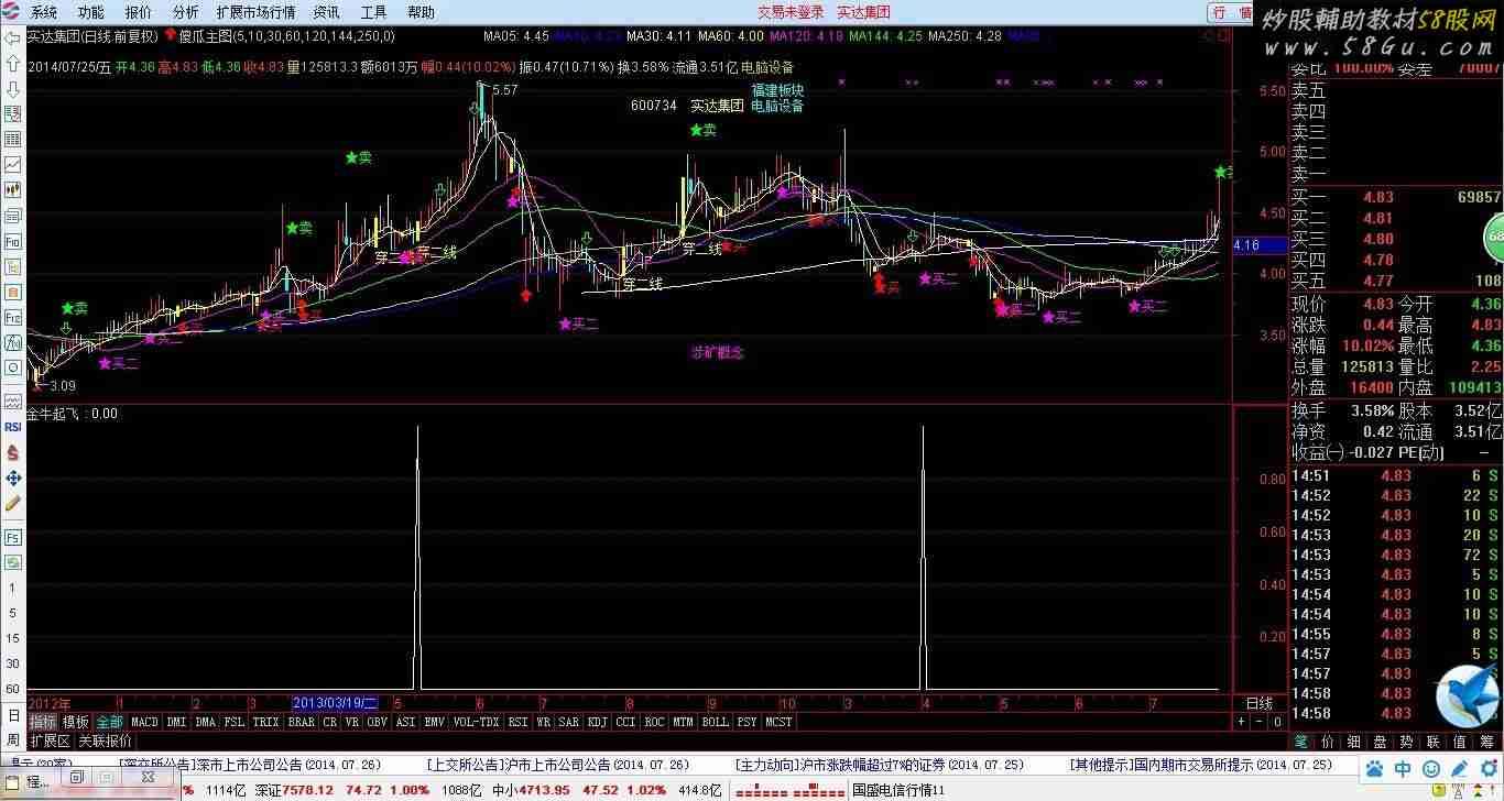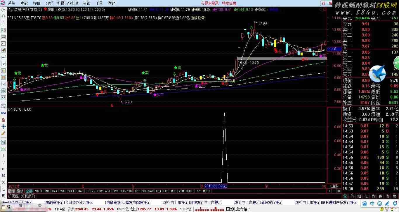 发1个金牛起飞的指标,一般在主升浪之前提示信号,无未来函数。整个信号不多,可以做成预警公式的 另外,大家如果下载麻烦推荐一下,呵呵,这样只需要1个共享币就可以啦。测试了成功率较高: 设置条件为:5个交易周期内,止盈止损5%的前提,测试了最近1年来数据,成功率达到了63%,总共出现了信号400多个。参考价值较高。下面2个图比较理想,当然也有不如意的图,看第3个图。 但是短线也是可以的。配合其他逃顶指标,还是不错的。X1:=ABS(MA(C,10)/MA(C,20)-1)<0.01;X2:=ABS(MA(C,5)/MA(C,10)-1)<0.01;X3:=ABS(MA(C,5)/MA(C,20)-1)<0.01;X4:=HHV(ABS(C-REF(C,1))/REF(C,1)*100,6)<3;X5:=H/C<1.015 AND COUNT(EVERY(OPEN>CLOSE,4),5)<=3;X6:=REF(C<MA(C,5),1) AND REF(C<MA(C,10),1);X7:=REF(C<MA(C,20),1) AND MA(C,5)>REF(MA(C,5),1);X8:=CROSS(C,MA(C,5)) AND C>MA(C,20) AND REF(MA(C,5),1)<REF(MA(C,5),2); X9:=C>MA(C,10) AND REF( X1 AND X2 AND X3,1) AND REF(X4,1) AND X5 AND C>MA(C,5)AND REF(O,1)<REF(O,2);X6 AND X7 AND X8 AND X9;
