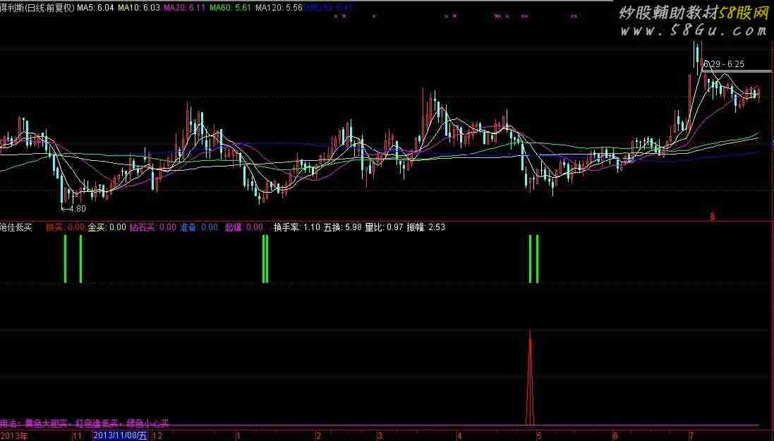 高手请飘过,这个不是追涨,不是追高,不是高手们喜欢的类型。题目中已经说了,是“低买”——个人认为,选择合适的股票,在合适的低位买入,这才是稳定盈利之根本。 所有的指标都不能保证100%的成功,我这个指标也是。 本人截图,不会只选那成功的那一段给大家看,我的截图尽量多让大家看到些K线,让你自己来判断指标的好坏。 所有的指标,都有个特点,就是:越是弱势股信号胜率越低,越是强势股信号胜率越高。就算是强势股,越是弱势阶段,信号胜率越低;越是强势阶段,信号胜率越高。因此,该选什么股来做,大家该清楚了吧。 CY:=REF(SSRP.SSRP,2)<=REF(SSRP.SSRP,1)<=SSRP.SSRP;ZN:=CY AND C>SSRP.SSRP;NGQD:=EVERY(ZN,25); AAA:=100*(WINNER(1.1*C)-WINNER(0.9*C));SDCM:=100-AAA;BBB:=MA(C,13)<REF(MA(C,13),1);CSDQ:=SDCM>65 AND BBB;MA30:=MA(C,30);MA60:=MA(C,60);AA0:=MA30>MA60 AND REF(MA60,5)<MA60; TD:=(1-7/100)*DMA(CLOSE,ABS((2*CLOSE+HIGH+LOW)/4-MA(CLOSE,20))/MA(CLOSE,20));AA:=LOW<=(TD+0.05);YY:=AA AND C>O;STICKLINE(YY, 1.5,2,1,0),COLORGREEN;STICKLINE(YY AND NGQD, 1.5,2,1,0),COLORRED;STICKLINE(YY AND CSDQ, 1.5,2,1,0),COLORYELLOW;ZCC:=EXPMA(EXPMA(CLOSE,9)*0.86,5);AA1:=LOW<=ZCC+0.01;HT:=(REF(O,1)>REF(C,1) AND REF(O,1)<REF(C,2) AND REF(O,2)>REF(C,2) AND C>O{ AND C>REF(C,1)});铁买:REF(AA,1) AND C>O AND AA0 AND HT,COLORRED,LINESTICK ;金买:铁买 AND NGQD;钻石买:AA AND AA0 OR AA AND AA1,COLORFF00FF,LINESTICK ;C1:=MA(C,13)<REF(MA(C,13),1);准备:CROSS(SDCM,90)AND C1,COLORFF7700,LINESTICK;牛准备:STICKLINE(准备,0,1,2,0),COLORFF7700;起爆:REF(CROSS(SDCM,90)AND C1,1) AND C>O,COLORFF00FF;牛起爆:STICKLINE(起爆,0,1.5,2,0),COLORFF00FF;DRAWTEXT_FIX(ISLASTBAR,0,5,0,'用法:黄色大胆买,红色逢低买,绿色小心买'),COLORFF00FF;换手率:VOL/CAPITAL*100,NODRAW,COLORWHITE;五换:SUM(换手率,5),NODRAW,COLORWHITE;量比: V/MA(REF(V,1),5),NODRAW,COLORWHITE;振幅:(H-L)/L*100,NODRAW,COLORWHITE;  . |