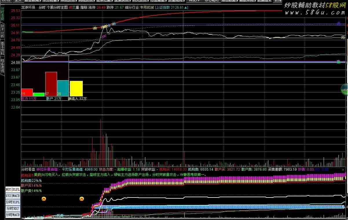 DRAWTEXT_FIX(1,0.00,0,0,' 黄箭头闪电买入。红箭头突破攻击,篮球主力流入,绿钻主力进场散户出场,分时突破量攻击,冷静思考放第一。')COLOR00FF00;{以上注解只适应二日分时用,请注意}NN:=2400;HD:=HHV(V,NN);LD:=LLV(V,NN);最高:=CONST(HD),NODRAW;最低:=CONST(LD),NODRAW;HLMAX:=最高;HLMIN:=最低;HLMN1:=(HLMAX+HLMIN)/2;HLMN2:=HLMAX-HLMIN;HLMN3:=(100-0)/2*1.3;HLMN4:=(100-0)/1*1.3;中间价轴:=(50-HLMN3)*HLMN2/HLMN4+HLMN1;轴差:=最高-最低;拉升量:=IF(C>REF(C,1),VOL,0);打压量:=IF(C<REF(C,1),VOL,0);昨拉升最高值:CONST(FINDHIGH(拉升量,FROMOPEN,240,1)),LINETHICK1,COLORMAGENTA;昨打压最高值:=CONST(FINDHIGH(打压量,FROMOPEN,240,1)),LINETHICK1,COLORCYAN,NODRAW;今拉升最高值:=CONST(REF(HHV(拉升量,FROMOPEN),0)),COLORRED;今打压最高值:CONST(REF(HHV(打压量,FROMOPEN),0)),COLORCYAN,NODRAW;攻击力度:今拉升最高值/昨拉升最高值,NODRAW;量能均线:=SUM(V,FROMOPEN)/FROMOPEN;量:=VOL,VOLSTICK;五日量:=MA(量,5),COLORWHITE;TT:=BARSCOUNT(C);{取得有效收盘价}均价黄:=SUM(C*V,TT)/SUM(V,TT);{分时均线的取值}量两步:=MA(V,5)>REF(MA(V,5),1) AND REF(MA(V,5),1)>REF(MA(V,5),2);价两步:= C>=REF(C,1) AND REF(C,1)>REF(C,2);价上岗量破5:=C>均价黄 AND V>MA(V,5);量起爆:=V>=REF(V,1)*1;价创新高:=C>=HHV(C,0);量创新高:=V>=HHV(V,0);对昨日涨幅:=(C/DYNAINFO(3)-1)*100<=2.50;{涨幅控制2个点以内}每日一点:=量两步 AND 价两步 AND 价上岗量破5 AND 量起爆 AND 价创新高 AND 量创新高 AND 对昨日涨幅;{计算收益、已爆分钟}VV:=BARSSINCE(每日一点)+1;首次起爆价:=REF(C,VV-1),NODRAW;起爆收益:(DYNAINFO(7)-首次起爆价)/首次起爆价*100,NODRAW;{DRAWNUMBER(VV>=1,V*0.8,今天收益);}流通盘:=CAPITAL*100/100000000,NODRAW;起爆时间:=REF(TIME/10000,VV),NODRAW;已爆分钟:=VV-1,NODRAW;{画出底线和红球}首次起爆量:=REF(VOL,VV-1),COLORWHITE;DRAWICON(已爆分钟>=2,首次起爆量,14);{出现红球,至少已经确认2分钟了};STICKLINE(C>0,0,V,0,0),COLOR00FFFF;STICKLINE(C<REF(C,1) AND V>=昨拉升最高值,0,V,0,0),COLOR00FF00;STICKLINE(C=REF(C,1),0,V,0,0),COLORFFFFFF;STICKLINE(C>REF(C,1) AND V>=今打压最高值,0,V,0,0),COLORRED;STICKLINE(C<REF(C,1) AND V>=今拉升最高值,0,V,0,0),COLORGREEN;STICKLINE(C>REF(C,1) AND (V>昨拉升最高值 OR V>昨打压最高值),0,V,0,0),COLOR0000FF;STICKLINE(C>REF(C,1) AND V>=2*昨拉升最高值 AND V<5*昨拉升最高值,昨拉升最高值,V,0,0),COLORFF00FF;STICKLINE(C>REF(C,1) AND V>=5*昨拉升最高值,0,V,0,0),COLORMAGENTA;STICKLINE(每日一点,最低+轴差*0.8,0,1,0),COLORMAGENTA;DRAWICON(每日一点,V,1),COLORRED;DRAWTEXT(每日一点,最低+轴差*0.8,'∠起爆'),COLORMAGENTA;TA:=BARSLAST(TIME=100000);TC:=REF(HHV(C,0),TA+1);TV:=REF(HHV(V,0),TA+1);ZF:=TC/DYNAINFO(3)<1.05;XG1:=CROSS(C,TC) AND V>TV AND ZF,COLORWHITE;TA1:=BARSLAST(TIME=110000);CC1:=REF(HHV(C,0),TA1+1);VV1:=REF(HHV(V,0),TA1+1);ZF1:=CC1/DYNAINFO(3)<1.05;XG2:=CROSS(C,CC1) AND V>VV1 AND ZF1,COLORYELLOW;突破:=XG1 OR XG2,COLORRED;VT:=BARSSINCE(突破)+1;首次突破价:=REF(C,VT-1),NODRAW;突破收益:(DYNAINFO(7)-首次突破价)/首次突破价*100,NODRAW;STICKLINE(突破,V,0,1,0),COLORRED;DRAWICON(突破=1,V,17);DRAWTEXT(突破=1,最低+轴差*0.65,'☆突破'),COLORRED;DRAWICON(FILTER(CROSS(拉升量,昨拉升最高值),30),V,1);DRAWTEXT(FILTER(CROSS(拉升量,昨拉升最高值),30),最低+轴差*0.50,'★攻击'),COLORYELLOW;DRAWICON(FILTER(CROSS(拉升量,今打压最高值),30),V,1);DRAWTEXT(FILTER(CROSS(拉升量,今打压最高值),30),最低+轴差*0.35,'★攻击'),COLORMAGENTA;成交额:=V*C/100,NODRAW;{万元}A2:=SUM((IF(((成交额/8>20) AND (CLOSE>(REF(CLOSE,1)))),成交额,0)),0);A3:=SUM((IF(((成交额/8>20) AND (CLOSE<(REF(CLOSE,1)))),成交额,0)),0);A4:=SUM((IF(((成交额/8<20) AND (CLOSE>(REF(CLOSE,1)))),成交额,0)),0);A5:=SUM((IF(((成交额/8<20) AND (CLOSE<(REF(CLOSE,1)))),成交额,0)),0);A6:=((A2+A3)+A4)+A5;A7:=IF((ISLASTBAR),((100*A2)/A6),0);A8:=IF((ISLASTBAR),((100*A3)/A6),0);A9:=IF((ISLASTBAR),((100*A4)/A6),0);A10:=IF((ISLASTBAR),((100*A5)/A6),0);机构买:(A2),LINETHICK6,COLORRED;机构卖:(A3),LINETHICK6,COLORFFFF55;机构进出:=机构买-机构卖,NODRAW;散户买:(A4),COLOR5555FF;{细红线}散户卖:(A5),COLOR55FF55;{细绿线}强势:=((100*A2)/A6>50);STICKLINE(强势,机构买*1.02,机构买*1.1,1,0),COLORYELLOW;拉升:=((100*A2)/A6-(100*A3)/A6)>18 AND (100*A2)/A6-(100*A5)/A6>18;STICKLINE(拉升,机构买*1.1,机构买*1.2,1,0),COLORFF00FF;DRAWTEXT(ISLASTBAR=1,机构买*0.95,'●机构买'),LINETHICK2,COLORRED;DRAWTEXT(ISLASTBAR=1,机构卖*0.95,'○机构卖'),LINETHICK2,COLORFFFF55;DRAWTEXT(机构进出>0 AND REF(机构进出,1)<=0,机构买*1.02,'●机买'),COLORRED;DRAWTEXT(机构进出<0 AND REF(机构进出,1)>=0,机构买*0.98,'○机卖'),COLORFFFF55;DD1:=1;AAA1:=STRCAT(STRCAT('机构买',CON2STR((100*A2)/A6,0)),'%%');AAA2:=STRCAT(STRCAT('机构卖',CON2STR((100*A3)/A6,0)),'%%');AAA3:=STRCAT(STRCAT('散户买',CON2STR((100*A4)/A6,0)),'%%');AAA4:=STRCAT(STRCAT('散户卖',CON2STR((100*A5)/A6,0)),'%%');DRAWTEXT_FIX(DD1=1,0,0.02,0,AAA1),COLORRED;DRAWTEXT_FIX(DD1=1,0,0.13,0,AAA2),COLORFFFF55;DRAWTEXT_FIX(DD1=1,0,0.24,0,AAA3),COLOR5555FF;DRAWTEXT_FIX(DD1=1,0,0.35,0,AAA4),COLOR55FF55;买卖差额:(机构买-机构卖),LINETHICK2,COLORWHITE;抄底:IF(CROSS(A2,A3),10,0),LINETHICK3,COLORMAGENTA;DRAWICON(CROSS(买卖差额,抄底),7000,34);XG:(机构买/机构卖>1.2 AND 散户买/散户卖<0.6)*6000,LINETHICK2;DRAWICON(XG=6000,6000,27);