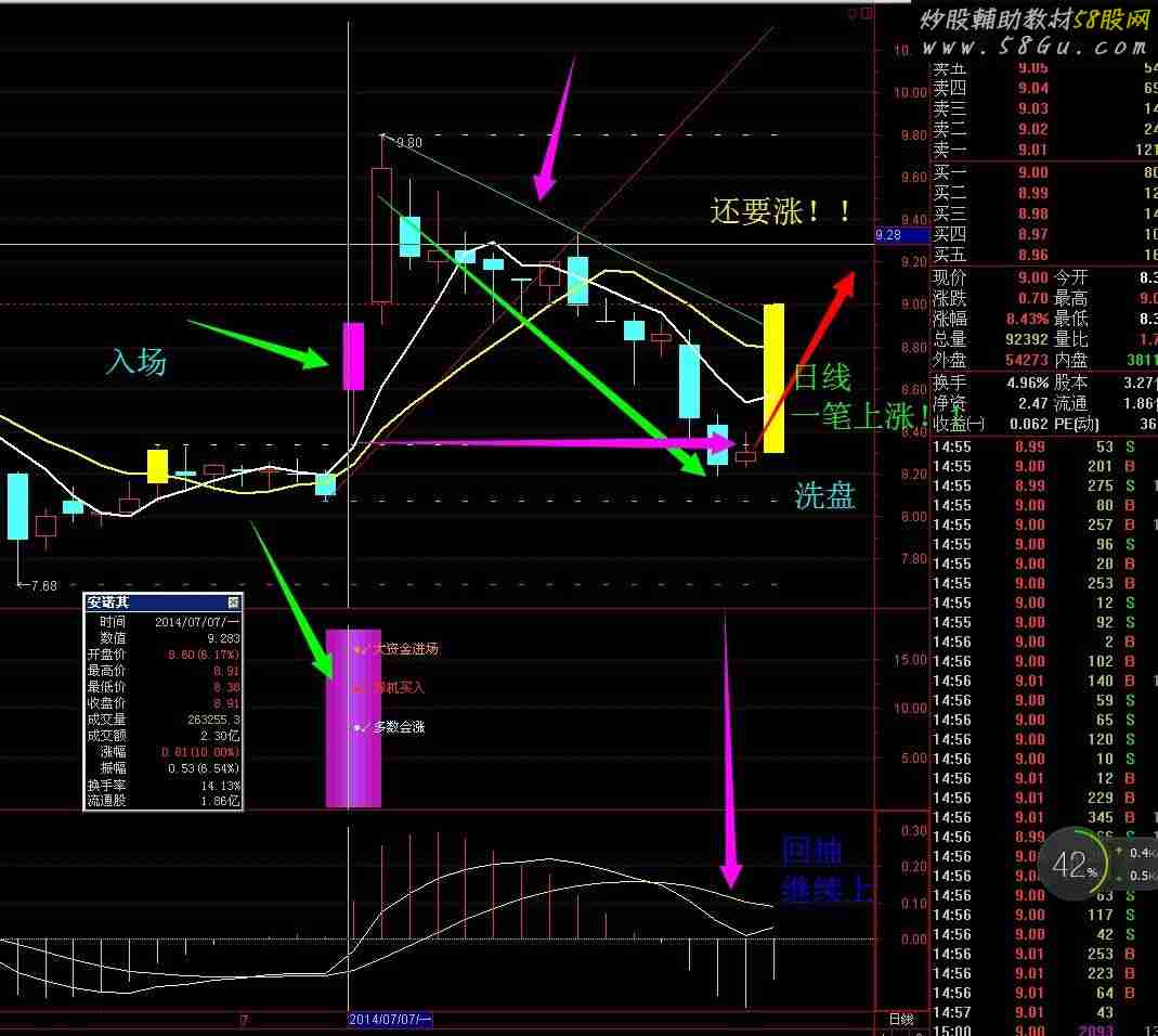 DRAWBAND(MA(CLOSE,60),RGB(80,0,0),MA(CLOSE,120),RGB(0,91,0));DRAWBAND(MA(CLOSE,5),RGB(155,50,50),MA(CLOSE,10),RGB(83,123,68));DRAWKLINE(H,O,L,C);MA5:=MA(CLOSE,5),COLORWHITE;MA10:=MA(CLOSE,10),COLORYELLOW;MA30:=MA(CLOSE,30),COLORMAGENTA;MA60:=MA(CLOSE,60),COLORGREEN;MA120:=MA(CLOSE,120),COLORLIMAGENTA;MA240:=MA(CLOSE,240),COLORBLUE,NODRAW; VOL5:=MA(VOL,5),COLORWHITE;VOL10:=MA(VOL,10),COLORYELLOW;VOL40:=MA(VOL,40),COLORFF00FF ;量托:=VOL5>=VOL40 AND CROSS(VOL10,VOL40) AND REF(VOL10,1)<REF(VOL40,1);DRAWTEXT(量托,L-0.012,'量托'),COLORWHITE;AA1:=BARSLAST(MA60>MA30 AND (MA30=MA10 OR MA30>MA10));BB1:=REF(COUNT(C<MA60,AA1)=AA1,1);CC1:=CROSS(C,MA60) AND VOL>MA(VOL,5) AND (C-REF(C,1))/REF(C,1)*100>3;芙蓉出水:=BB1 AND CC1,COLOR00FF00;DRAWTEXT(芙蓉出水,H+0.3,'芙蓉出水'),COLORFF00FF;STICKLINE(芙蓉出水,H,L,1,1),COLORFF00FF;STICKLINE(芙蓉出水,O,C,3,1),LINETHICK2,COLORFF00FF;MA1:=MA(CLOSE,5);MA2:=MA(CLOSE,10);MA3:=MA(CLOSE,20);ZJ:=AMOUNT/10000;{资金}TM:=V-MA(V,10);{量填满}一穿三:=MA1>O AND MA2>O AND MA3>O AND MA1<C AND MA2<C AND MA3<C AND CLOSE>OPEN ;DRAWTEXT(一穿三,L-0.012,'一穿三'),COLORFF00FF;STICKLINE(一穿三,OPEN,CLOSE,1,0),COLORFF00FF;TY:=C;A1:=REF(TY,10)=HHV(TY,2*10+1); B1:=FILTER(A1,10); C1:=BACKSET(B1,10+1); HD:=FILTER(C1,10);A2:=REF(TY,10)=LLV(TY,2*10+1); B2:=FILTER(A2,10); C2:=BACKSET(B2,10+1); LD:=FILTER(C2,10);前期高位:REF(C,BARSLAST(HD)),COLORBLUE,POINTDOT;STICKLINE(C,前期高位,前期高位,8,0),COLORBLUE; {高点:=(C/REF(C,BARSLAST(HD))-1)*100,NODRAW;STICKLINE((HIGH-MAX(CLOSE,OPEN))/(HIGH-LOW)>0.667,H,C,0.8,0),COLORBLUE;}三日不破:=MIN(MIN(L,REF(L,1)),REF(L,2))>=REF(L,3);三日量缩:=(MAX(MAX(V,REF(V,1)),REF(V,2))<REF(V,3));三日价涨A:=C>=REF(C,1);三日价涨B:=C<REF(C,1);三日价涨C:=MIN(MIN(C,REF(C,1)),REF(C,2))>=REF(L,3);TIM:=IF(DATE<1140214,1,0);缩倍柱:=(VOL*1.95<=REF(VOL,1))*TIM;百日低量:=(VOL=LLV(VOL,100))*TIM;倍量柱:=C>REF(C,1)*1.04 AND (VOL>=1.9*REF(VOL,1))*TIM;四日前倍量柱:=(REF(VOL,3)>1.9*REF(VOL,4))*TIM;四日前高量柱:=(REF(VOL,3)>=REF(VOL,4) AND REF(VOL,3)<1.9*REF(VOL,4) AND 三日量缩)*TIM;前三引用不成立:=COUNT(REF(四日前倍量柱,1) AND (REF(三日不破,1) OR REF(三日价涨C,1)),3)=0 AND COUNT(REF(四日前高量柱,1) AND (REF(三日不破,1) OR REF(三日价涨C,1)),3)=0;倍量黄金柱:=四日前倍量柱 AND 三日量缩 AND 三日不破 AND 三日价涨A AND 前三引用不成立;高量黄金柱:=四日前高量柱 AND 三日量缩 AND 三日不破 AND 三日价涨A AND 前三引用不成立;黄金柱:=倍量黄金柱 OR 高量黄金柱;次倍量黄金柱:=NOT(黄金柱) AND 四日前倍量柱 AND 三日量缩 AND 三日不破 AND 三日价涨B AND 前三引用不成立;次高量黄金柱:=NOT(黄金柱) AND 四日前高量柱 AND 三日量缩 AND 三日不破 AND 三日价涨B AND 前三引用不成立;次黄金柱:=次倍量黄金柱 OR 次高量黄金柱;准倍量黄金柱:=NOT(黄金柱 OR 次黄金柱) AND 四日前倍量柱 AND ((三日量缩 AND 三日价涨C) OR (COUNT(倍量柱,3)>=1 AND 三日不破)) AND 前三引用不成立;准高量黄金柱:=NOT(黄金柱 OR 次黄金柱) AND 四日前高量柱 AND (三日量缩 AND 三日价涨C) AND 前三引用不成立;准黄金柱:=准倍量黄金柱 OR 准高量黄金柱;倍量将军柱:=NOT(黄金柱 OR 次黄金柱 OR 准黄金柱) AND 四日前倍量柱 AND 三日不破 AND 三日价涨A AND 前三引用不成立;高量将军柱:=NOT(黄金柱 OR 次黄金柱 OR 准黄金柱) AND 四日前高量柱 AND 三日不破 AND 三日价涨A AND 前三引用不成立;将军柱:=倍量将军柱 OR 高量将军柱;次倍量将军柱:=NOT(黄金柱 OR 次黄金柱 OR 准黄金柱 OR 将军柱) AND 四日前倍量柱 AND 三日不破 AND 三日价涨B AND 前三引用不成立;次高量将军柱:=NOT(黄金柱 OR 次黄金柱 OR 准黄金柱 OR 将军柱) AND 四日前高量柱 AND 三日不破 AND 三日价涨B AND 前三引用不成立;次将军柱:=次倍量将军柱 OR 次高量将军柱;准倍量将军柱:=NOT(黄金柱 OR 次黄金柱 OR 准黄金柱 OR 将军柱 OR 次将军柱) AND 四日前倍量柱 AND 三日价涨C AND 前三引用不成立;准高量将军柱:=NOT(黄金柱 OR 次黄金柱 OR 准黄金柱 OR 将军柱 OR 次将军柱) AND 四日前高量柱 AND 三日价涨C AND 前三引用不成立;准将军柱:=准倍量将军柱 OR 准高量将军柱;BACKSET100:=BACKSET(黄金柱 OR 次黄金柱 OR 准黄金柱 OR 将军柱 OR 次将军柱 OR 准将军柱,4);FILTER100:=FILTER(BACKSET100,3),NODRAW;BACKSET101:=BACKSET(黄金柱,4);FILTER101:=FILTER(BACKSET101,3);BACKSET102:=BACKSET(次黄金柱,4);FILTER102:=FILTER(BACKSET102,3);BACKSET103:=BACKSET(准黄金柱,4);FILTER103:=FILTER(BACKSET103,3);BACKSET104:=BACKSET(将军柱,4);FILTER104:=FILTER(BACKSET104,3);BACKSET105:=BACKSET(次将军柱,4);FILTER105:=FILTER(BACKSET105,3);BACKSET106:=BACKSET(准将军柱,4);FILTER106:=FILTER(BACKSET106,3);黄金线下影线:=REF(FILTER100,3)=1 AND MIN(MIN(L,REF(L,1)),REF(L,2))<=REF(L,3);黄金线实体下端:=REF(FILTER100,3)=1 AND MIN(MIN(L,REF(L,1)),REF(L,2))<=MIN(REF(C,3),REF(O,3)) AND MIN(MIN(L,REF(L,1)),REF(L,2))>REF(L,3),LINETHICK0;黄金线上影线:=REF(FILTER100,3)=1 AND MIN(MIN(L,REF(L,1)),REF(L,2))>=REF(H,3);黄金线实体上端:=REF(FILTER100,3)=1 AND MIN(MIN(L,REF(L,1)),REF(L,2))>=MAX(REF(C,3),REF(O,3)) AND REF(FILTER100,3)=1 AND MIN(MIN(L,REF(L,1)),REF(L,2))<REF(H,3);黄金线实体中间:=REF(FILTER100,3)=1 AND MIN(MIN(L,REF(L,1)),REF(L,2))<MAX(REF(C,3),REF(O,3)) AND REF(FILTER100,3)=1 AND MIN(MIN(L,REF(L,1)),REF(L,2))>MIN(REF(C,3),REF(O,3));黄金线实体中间1:=REF(FILTER100,3)=1 AND MIN(MIN(L,REF(L,1)),REF(L,2))<MAX(REF(C,3),REF(O,3)) AND REF(FILTER100,3)=1 AND MIN(MIN(L,REF(L,1)),REF(L,2))>MIN(REF(C,3),REF(O,3)) AND REF(L,2)=MIN(MIN(L,REF(L,1)),REF(L,2));黄金线实体中间2:=REF(FILTER100,3)=1 AND MIN(MIN(L,REF(L,1)),REF(L,2))<MAX(REF(C,3),REF(O,3)) AND REF(FILTER100,3)=1 AND MIN(MIN(L,REF(L,1)),REF(L,2))>MIN(