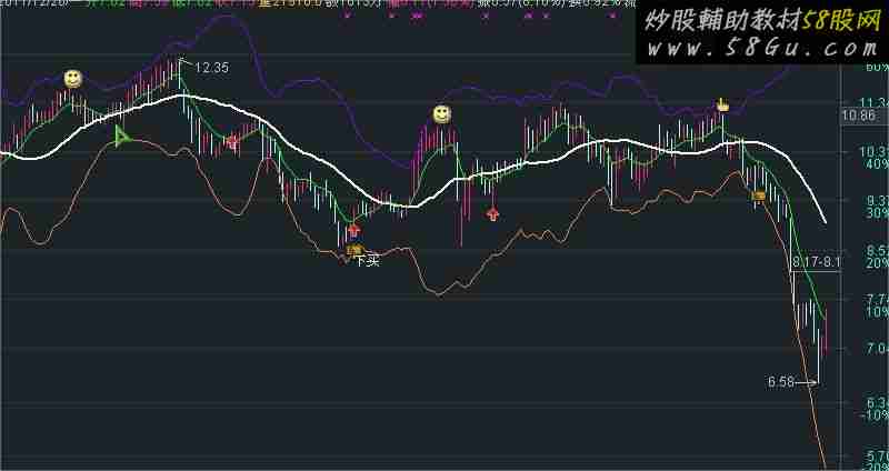强弱分界: MA(CLOSE,27),LINETHICK2,COLORWHITE; 上极限: 强弱分界+3*STD(CLOSE,21),COLORFF0080; 下极限:强弱分界-2.9*STD(CLOSE,21),COLOR4080FF; 风标:EMA((EMA(CLOSE,3)+EMA(CLOSE,5)+EMA(CLOSE,8)+EMA(CLOSE,13))/4,2),COLOR00FF00; VAR1:=(2*CLOSE+HIGH+LOW)/4; VAR2:=LLV(LOW,34); VAR3:=HHV(HIGH,34); VAR4:=EMA((VAR1-VAR2)/(VAR3-VAR2)*100,13); VAR5:=REF(CLOSE,1); VAR6:=SMA(MAX(CLOSE-VAR5,0),7,1)/SMA(ABS(CLOSE-VAR5),7,1)*100; VAR7:=EMA((CLOSE-LLV(CLOSE,55))/(HHV(CLOSE,55)-LLV(LOW,55))*100,7); VAR8:=EMA((CLOSE-VAR2)/(VAR3-VAR2)*100,5); VAR9:=EMA((CLOSE-VAR2)/(VAR3-VAR2)*100,20); VAR10:=FILTER(CROSS(VAR8,VAR9) AND VAR9<30 ,5)AND VAR7>REF(VAR7,1)AND C<强弱分界 AND C>O AND VAR4>REF(VAR4,1); DRAWICON(REF(L,1)<下极限 AND L>下极限 AND C>O OR VAR10,下极限 ,10); DRAWTEXT(VAR10,下极限,'下买'); DRAWICON(FILTER(REF(H,1)<风标 AND CROSS(C,风标) AND 风标>REF(风标,1) AND 风标<强弱分界,3)AND C>O,L,1); DRAWICON(REF(H,1)>上极限 AND H<上极限 AND L<风标 AND C<O,上极限 ,11); DRAWICON( CROSS(80,VAR6)AND L<风标,H*1.03,5); DRAWTEXT(CROSS(H,上极限)AND L>风标 AND C/REF(C,10)>1.2 AND VAR8>80,H+0.12,'上卖'),COLOR00FFFF;