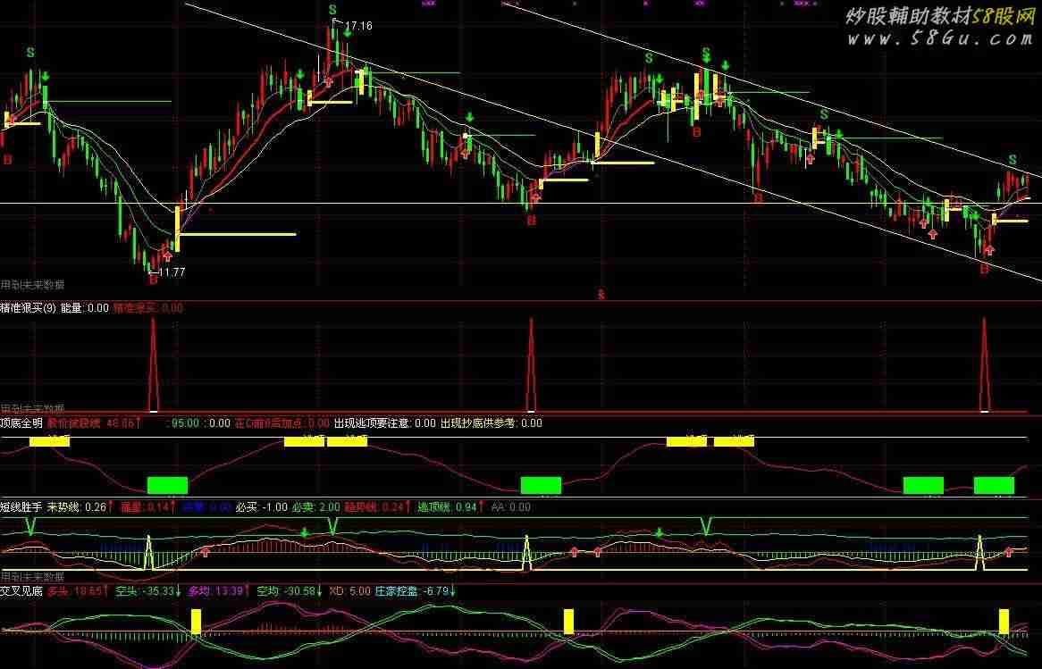 {短线胜手} 来势线: EMA(CLOSE,7)-EMA(CLOSE,21),COLORYELLOW; 福星: EMA(来势线,7), COLORSTICK,COLORRED; VAR1:=CLOSE/REF(LLV(LOW,35),5)< 1; 决策: IF(VAR1,0.5,0), STICK,COLORBLUE; 必买: IF(TROUGHBARS(3,15,1)=0 AND HIGH>LOW+0.01,1,-1),COLORYELLOW ,LINETHICK2 ; 必卖: IF(PEAKBARS(3,15,1)=1,1,2),COLORGREEN,LINETHICK2; 趋势线: (EMA(WINNER(CLOSE),7)-EMA(WINNER(CLOSE),35))*5,COLORRED; 逃顶线: EMA(CLOSE/REF(HHV(CLOSE,7),50),1),COLOR00FF00 ,LINETHICK1 ; AA:0,COLORBROWN; DRAWICON(CROSS(趋势线,AA),AA,1); DRAWICON(CROSS(逃顶线,趋势线),逃顶线,2);