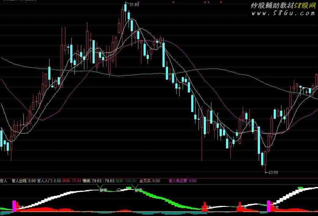 DIFF:=EMA(C,5)-EMA(C,20);DEA:=EMA(DIFF,10); MACD:=500*(DIFF-DEA)/EMA(C,30), COLORRED ,POINTDOT; STICKLINE(MACD>=0,0,MACD,5,0) ,COLORRED; STICKLINE(MACD<=0,0,MACD,5,0) ,COLORLICYAN; VARE:=(REF(LOW,1))*(0.89999997); VARF:=(LOW)*(0.89999997); VAR10:=((VARF)*(VOL)+(VARE)*(CAPITAL-VOL))/(CAPITAL); VAR11:=EMA(VAR10,30); VAR12:=CLOSE-REF(CLOSE,1); VAR13:=MAX(VAR12,0); VAR14:=ABS(VAR12); VAR15:=((SMA(VAR13,7,1))/(SMA(VAR14,7,1)))*(100); VAR16:=((SMA(VAR13,13,1))/(SMA(VAR14,13,1)))*(100); VAR17:=BARSCOUNT(CLOSE); VAR18:=((SMA(MAX(VAR12,0),6,1))/(SMA(ABS(VAR12),6,1)))*(100); VAR19:=(((-200))*(HHV(HIGH,60)-CLOSE))/(HHV(HIGH,60)-LLV(LOW,60))+100; VAR1A:=((CLOSE-LLV(LOW,15))/(HHV(HIGH,15)-LLV(LOW,15)))*(100); VAR1B:=SMA((SMA(VAR1A,4,1)-50)*(2),3,1); VAR1C:=((INDEXC-LLV(INDEXL,14))/(HHV(INDEXH,14)-LLV(INDEXL,14)))*(100); VAR1D:=SMA(VAR1C,4,1); VAR1E:=SMA(VAR1D,3,1); VAR1F:=((HHV(HIGH,30)-CLOSE)/(CLOSE))*(100); VAR20:=(VAR18<=25) AND (VAR19<(-95)) AND (VAR1F>20) AND (VAR1B<(-30)) AND (VAR1E<30) AND (VAR11- CLOSE>=(-0.25)) AND (VAR15<22) AND (VAR16<28) AND (VAR17>50); A1:=CROSS(VAR20,0.5) AND (COUNT((VAR20=1),10)=1),COLOR00FFFF,LINETHICK2; 官人出现:IF(A1,50,0),COLOR00FFFF,LINETHICK2; 官人入门:IF(VAR20,40,0),COLORFFCC66,LINETHICK2; VAR26:=((CLOSE-LLV(LOW,27))/(HHV(HIGH,27)-LLV(LOW,27)))*(100); VAR27:=REVERSE(VAR26); VAR28:=SMA(VAR26,3,1); 快线:SMA(VAR28,3,1),COLOR0000FF; 慢线:SMA(快线,3,1),COLOR00FFFF; IF(CROSS(快线,慢线) AND (快线>30),快线+10,慢线), COLORYELLOW,LINETHICK1; 短卖:IF(CROSS(慢线,快线) AND (慢线>75),85,100),COLOR008000,LINETHICK2; DRAWTEXT(CROSS(慢线,快线) AND 快线>75,87,'解带 '),COLORWHITE; 金叉买:IF(CROSS(快线,慢线) AND (快线<40),35,0),COLOR0099FF,LINETHICK2; DRAWTEXT(CROSS(快线,慢线) AND 快线<30,25,'宽衣 '),COLORWHITE;STICKLINE(金叉买,0,20,8,0),COLORRED; STICKLINE(金叉买,18,35,2,0),COLORRED; STICKLINE(快线>慢线,快线,慢线,4,0),COLORWHITE; STICKLINE(快线<慢线,快线,慢线,4,0),COLOR00FF00; VARA:=IF(REF(L,1)<=LLV(L,120) AND HHV(C,120)/LLV(C,120)>1.25 AND C>O AND HIGH>LOW+0.04,4,0); 官人我还要:IF(VARA>0,40,0),COLORFF00FF,POINTDOT,{STICK,LINETHICK2}; STICKLINE(官人我还要,40,0,4,0),COLORFF00FF; V1:=AMOUNT/VOL/100; V2:=(3*HIGH+LOW+OPEN+2*CLOSE)/7; V3:=SUM(AMOUNT,7)/V1/100; V4:=DMA(V2,VOL/V3); V5:=(CLOSE-V4)/V4*100; V6:=MA(V5,20)+STD(V5,20); BIAS21:=(CLOSE-MA(CLOSE,21))/MA(CLOSE,21)*100; STICKLINE(REF(BIAS21,1)>=5 AND CROSS(V6,V5) AND REF("KDJ.J"(34,3,3),1)>80 AND REF("KDJ.J"(9,3,3),1)>80,90,85,6,0),COLOR00FF00;
