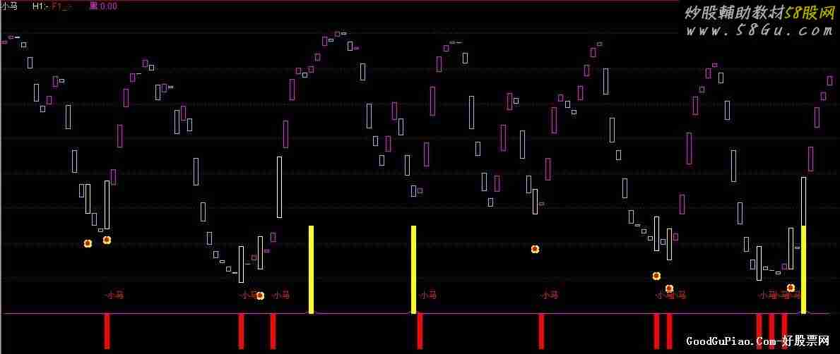 买:=IF("KDJ.J"<0,10,0); 条件:=CROSS(9.9,买); VAR1:=(2*CLOSE+HIGH+LOW)/4; VAR2:=LLV(LOW,5); VAR3:=HHV(HIGH,5); VAR4:=EMA((VAR1-VAR2)/(VAR3-VAR2)*100,5); MA1:=MA(VAR4,2); AA:STICKLINE(VAR4>MA1,VAR4,MA1,2,1),COLORFF00FF; BBB:STICKLINE(VAR4>MA1 AND REF(VAR4,1)<30,VAR4,MA1,2,1),COLORFF00FF; STICKLINE(VAR4<=MA1,VAR4,MA1,2,1),COLORFFCC66; H1:IF(CROSS(9.9,买),VAR4-12,DRAWNULL),CROSSDOT,LINETHICK7,COLORYELLOW; F1_:IF(CROSS(9.9,买),VAR4-12,DRAWNULL),CIRCLEDOT,LINETHICK2,COLORRED; STICKLINE(CROSS(9.9,买),VAR4+5,MA1-4,2,8),COLORYELLOW; XXX:=STICKLINE(BBB,VAR4+5,MA1-4,2,1),COLORYELLOW; STICKLINE(FILTER(XXX ,5) ,VAR4+5,MA1-4,2,1),COLORWHITE;R1:=1; R2:=((((2*CLOSE)+HIGH)+LOW) / 4); R4:=LLV(LOW,5); R5:=HHV(HIGH,4); C1:=(EMA((((R2-R4)/(R5-R4))*100),4)*R1),COLORFF00FF,LINETHICK2; C2:=(EMA(((0.667*REF(C1,1))+(0.333*C1)),2)*R1),COLORFFFFFF,LINETHICK2; 条:=CROSS(C1,C2) AND C1<40; STICKLINE(条,0,-10,2,0),COLORRED; DRAWTEXT(条,5,'小马'),COLORRED;DI0:=(EMA(DCLOSE,13)-EMA(DCLOSE,24))*100; DE0:=EMA(DI0,9); MA0:=2*(DI0-DE0); 黑:(MA0>REF(MA0,1)*2.5 AND MA0>15),COLORFF00FF; STICKLINE(黑,0,25,2.0,0),COLORYELLOW;