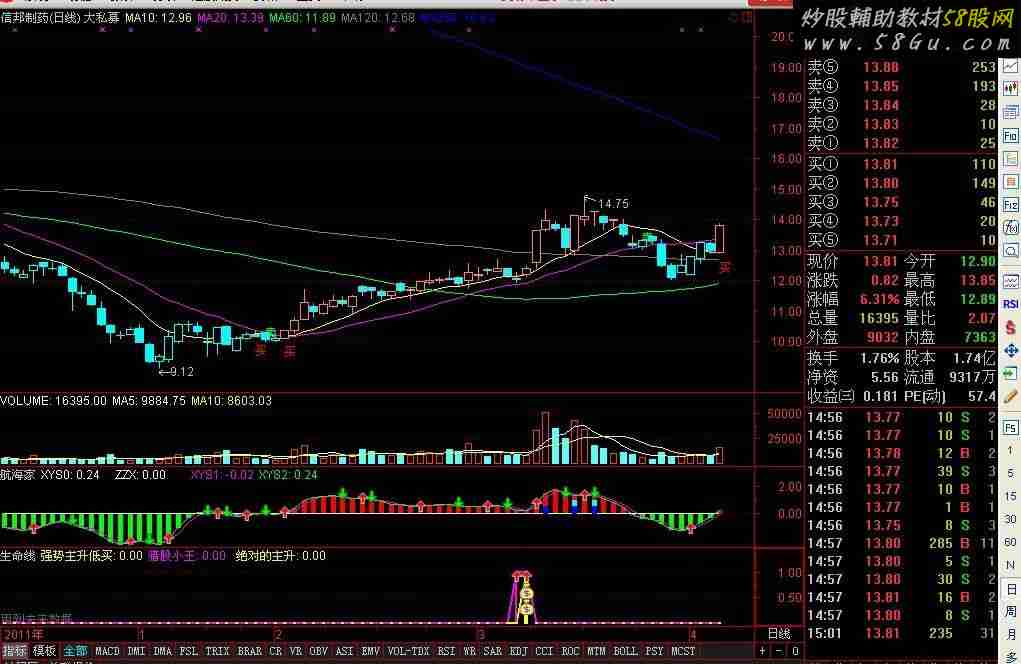 MA10:MA(CLOSE,10),LINETHICK1,COLORYELLOW; MA20:MA(CLOSE,20),LINETHICK1,COLORMAGENTA; MA60:MA(CLOSE,60),LINETHICK1,COLORGREEN; MA120:MA(CLOSE,120),LINETHICK1,COLORGRAY; MA250:MA(CLOSE,250),LINETHICK1,COLORBLUE; 买线:=EMA(C,4); 卖线:=EMA(SLOPE(C,20)*10+C,35); DRAWTEXT(CROSS(买线,卖线),LOW*0.98,'买'),COLORRED,LINETHICK2; DRAWTEXT(CROSS(卖线,买线),HIGH*1.02,'卖'),COLORGREEN; STICKLINE(买线>=卖线,LOW,HIGH,0,0),COLORLIRED; STICKLINE(买线>=卖线,CLOSE,OPEN,3,2),COLORLIRED; STICKLINE(买线<卖线,LOW,HIGH,0,0),COLORCYAN; STICKLINE(买线<卖线,CLOSE,OPEN,3,2),COLORCYAN; STICKLINE(OPEN>CLOSE,CLOSE,OPEN,2.5,0),COLORCYAN; |
