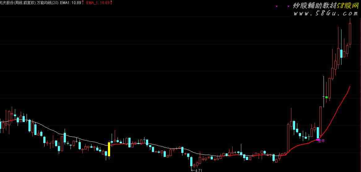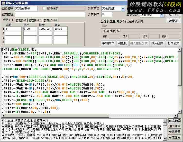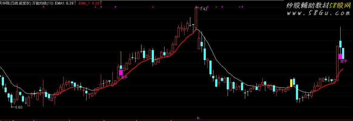 EMA_1:IF(EMA1>=REF(EMA1,1),EMA1,DRAWNULL),COLORRED,LINETHICK2;以10日均线为默认缺省值,在主图中右击点"当前主图指标"-----"调整指标参数"-----"方框内上下按钮选择2-250天的数值范围"----主图上K线多个低点连接可知主力心理底线价格,沿该线一路持有,破位则一半或全部卖出。至简至真,明明白白。长线方案可选择周线或月线同理调整即可。