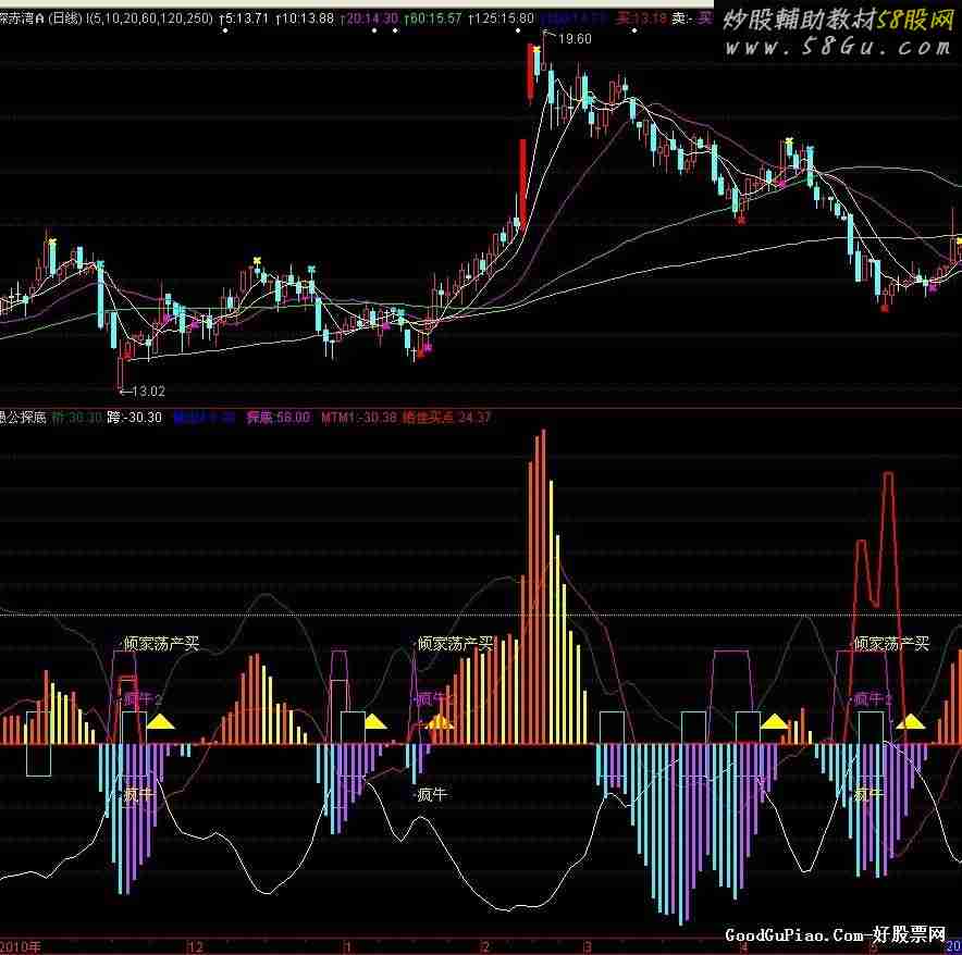 VAR2:=(HIGH+LOW+(CLOSE)*(2))/(4); BH:=((EMA((VAR2-LLV(VAR2,15))/(HHV(LOW,15)-LLV(VAR2,15)),2))*(38)),COLOR0000FF,LINESTICK; BL:=((((-1))*(EMA((VAR2-LLV(VAR2,15))/(HHV(LOW,15)-LLV(VAR2,15)),2))+0.01)*(38)),COLOR339999,LINESTICK; VAR22:=((CLOSE-LLV(LOW,10))/(HHV(HIGH,10)-LLV(LOW,10)))*(100); VAR33:=EMA(VAR22,10); VAR44:=EMA(VAR33,10); VAR55:=(3)*(VAR33)-(2)*(VAR44); VAR66:=EMA(VAR55,5); 桥:(EMA(VAR66,1)),COLOR007700,LINETHICK1; 跨:(REVERSE(桥)),COLORFFFFFF,LINETHICK1; {(0),COLORFFFF00,LINETHICK3;} 趋势:=(5)*(SMA(((CLOSE-LLV(LOW,27))/(HHV(HIGH,27)-LLV(LOW,27)))*(100),5,1))-(3)*(SMA(SMA(((CLOSE-LLV(LOW,27)) /(HHV(HIGH,27)-LLV(LOW,27)))*(100),5,1),3,1))-SMA(SMA(SMA(((CLOSE-LLV(LOW,27))/(HHV(HIGH,27)-LLV(LOW,27)))*(100),5,1),3,1),2,1); 底部:=5; {底:DRAWTEXT((CROSS(趋势,底部)),0,'◥◤'),COLOR00FFFF;} DRAWTEXT(CROSS((趋势),底部),15,'◢◣'),COLOR00FFFF; {DRAWTEXT(CROSS(趋势,底部),0,'★'),COLORRED; DRAWTEXT(CROSS(趋势,底部),20,'●'),COLORGREEN;} VARA1:=((CLOSE>=REF(CLOSE,1)) AND (REF(CLOSE,1)>=REF(CLOSE,2)) AND (REF(CLOSE,1)<=REF(CLOSE,3)) AND (REF(CLOSE,2)<=REF(CLOSE,3)) AND ((REF(CLOSE,4)>REF(CLOSE,2)) OR (REF(CLOSE,4)<=REF(CLOSE,2)) AND (REF(CLOSE,5)>=REF(CLOSE,3))) OR (CLOSE>=REF(CLOSE,1)) AND (REF(CLOSE,1)<=REF(CLOSE,2)) AND (CLOSE>=REF(CLOSE,2)) AND ((REF(CLOSE,3)>REF(CLOSE,1)) OR (REF(CLOSE,3)<=REF(CLOSE,1)) AND (REF(CLOSE,4)>=REF(CLOSE,2)))); VARA2:=LLV(LOW,5); VARA3:=HHV(HIGH,5); VARA4:=EMA(((CLOSE-VARA2)/(VARA3-VARA2))*(100),1); VARA5:=EMA((0.66699999)*(REF(VARA4,1))+(0.333)*(VARA4),2); VARA6:=(VARA5<24) AND (OPEN<MA(CLOSE,20)); VARA1 AND (VARA6),COLORFF0000; STICKLINE(VARA1 AND (VARA6),-40,40,10,1),COLOR2894FF; VARB2:=((CLOSE-LLV(LOW,10))/(HHV(HIGH,10)-LLV(LOW,10)))*(100); VARB3:=EMA(VARB2,7); VARB4:=EMA(VARB3,10); VARB5:=(3)*(VARB3)-(2)*(VARB4); VARB6:=EMA(VARB5,5); 趋势1:=(3)*(SMA(((CLOSE-LLV(LOW,27))/(HHV(HIGH,27)-LLV(LOW,27)))*(100),5,1))-(2) *(SMA(SMA(((CLOSE-LLV(LOW,27))/(HHV(HIGH,27)-LLV(LOW,27)))*(100),5,1),3,1)); 探底:IF((趋势<=5),58,0),COLORFF00FF; 桥1:=EMA(VARB6,1); 美化:=IF(REF((COUNT((桥1<=REF(桥1,1)),5)=5),1) AND (桥1>REF(桥1,1)),10,0); STICKLINE((美化),-20,20,15,1),COLORFFFF00; MTM1:MA((CLOSE-REF(CLOSE,13))*31,5),LINETHICK1,COLOR7711EE; VARF1:=MA(HHV(HIGH,485),17); VARF2:=MA(HHV(HIGH,222),17); VARF3:=MA(HHV(HIGH,96),17); VARF4:=MA(LLV(LOW,485),17); VARF5:=MA(LLV(LOW,222),17); VARF6:=MA(LLV(LOW,96),17); VARF7:=MA((VARF4*0.96+VARF5*0.96+VARF6*0.96+VARF1*0.558+VARF2*0.558+VARF3*0.558)/6,17); VARF8:=MA((VARF4*1.25+VARF5*1.23+VARF6*1.2+VARF1*0.55+VARF2*0.55+VARF3*0.65)/6,17); VARF9:=MA((VARF4*1.3+VARF5*1.3+VARF6*1.3+VARF1*0.68+VARF2*0.68+VARF3*0.68)/6,17); VARFA:=MA((VARF7*3+VARF8*2+VARF9)/6*1.738,17); VARFB:=IF(C=C,VARFA,VARFA*DAY); VARFC:=LOW; VARFD:=REF(LOW,1); VARFE:=SMA(ABS(VARFC-VARFD),3,1)/SMA(MAX(VARFC-VARFD,0),3,1)*100; VARFF:=MA(IF(CLOSE*1.35<=VARFB,VARFE*10,VARFE/10),3); VARF10:=LLV(LOW,30); VARF11:=HHV(VARFF,30); 绝佳买点:IF(C=C,MA(IF(LOW<=VARF10,(VARFF+VARF11*2)/2,0),3),100000000)/(200),COLORRED,LINETHICK2; I:=IF(CLOSE<REF(CLOSE,1),0,VOL/CAPITAL); 骤雨初晴:=ABS(EMA(I,13.3)-18)/WINNER(CLOSE)*IF((CLOSE-MA(CLOSE,6))/MA(CLOSE,6)<-0.04,1,0); W:=COST(10)*0; DIFF:=EMA(CLOSE,12) - EMA(CLOSE,26),COLORRED; DEA:=EMA(DIFF,9),COLORYELLOW; MACD:=2*(DIFF-DEA)*231,STICK,COLORRED,LINETHICK1; STICKLINE(MACD<REF(MACD,1)AND MACD>0,0,MACD,0.9,0),COLOR00FFFF; STICKLINE(MACD<=REF(MACD,1)AND MACD<0,0,MACD,0.8,0 ),COLORFFEE44; STICKLINE(MACD>=REF(MACD,1)AND MACD>0,0,MACD,1.1,0 ),COLOR0055FF; STICKLINE(MACD>REF(MACD,1)AND MACD<0,0,MACD,1.1,0 ),COLORFF55BB; DRAWTEXT(CROSS(绝佳买点,1.20000) ,-32,'疯牛'),COLORYELLOW,LINETHICK2 ; DRAWTEXT(CROSS(绝佳买点,4.50000) ,63,'倾家荡产买'),COLOR00FFFF,LINETHICK2; {DRAWTEXT(CROSS(绝佳买点,7.00000) ,88,'疯牛3'),COLORCYAN,LINETHICK4;} DRAWTEXT(CROSS(绝佳买点,3.60000) ,28,'疯牛2'),COLORFF00FF,LINETHICK4; {DRAWTEXT(CROSS(绝佳买点,2.40000) ,-55,'疯牛1'),COLORFFFFCC,LINETHICK3 ; };