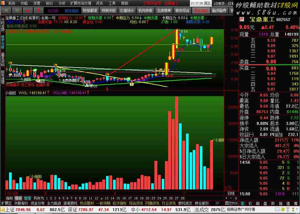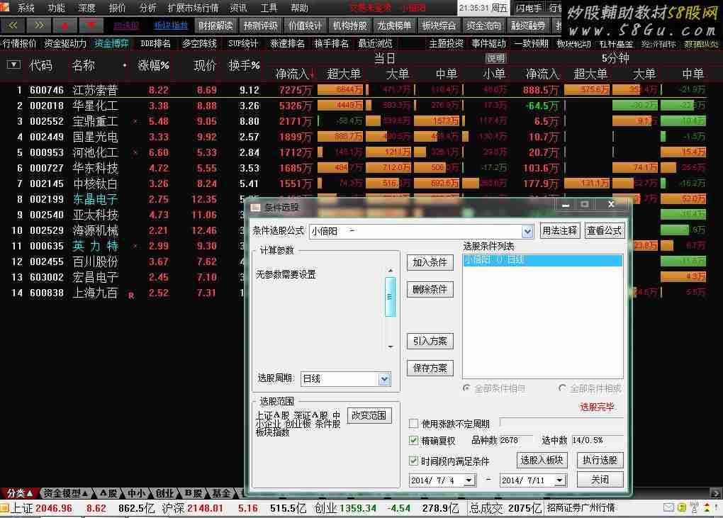 小倍阳还在测试!风险第一,盈利第二!看懂了才真正属于自己!内外盘:=(DYNAINFO(23)<>DYNAINFO(22)) AND (DYNAINFO(7)>DYNAINFO(3)); 盘:=CAPITAL/100; 换:=V/盘; 换手率1:=BETWEEN(换,1.70,40); 量比1 :=DYNAINFO(17)>1.20; 流通盘:=CAPITAL/1000000<=4.49; 股价:=C>=4.60 AND C<12.69; 去创业板:=IF(CODELIKE('300'),0,1); 去停牌:=DYNAINFO(17)>0; D22:=IF(NAMELIKE('S'),0,1); D33:=IF(NAMELIKE('*'),0,1); 去ST:=D22 AND D33 AND 流通盘 AND 股价 AND 内外盘 AND 去停牌 AND 量比1 AND 换手率1 ;M:=12;N1:=6; N2:=13; LC:=REF(CLOSE,1); RS1:=SMA(MAX(CLOSE-LC,0),M,1)/SMA(ABS(CLOSE-LC),M,1)*100; SM:=MA(RS1,20),COLORFF00FF; SU:=SM+2*STD(RS1,20); SD:=SM-2*STD(RS1,20); TR1:=MA(MAX(MAX((RS1-RS1),ABS(REF(RS1,1)-RS1)),ABS(REF(RS1,1)-RS1)),15); VM:=MA(RS1,N1); VU:=VM+2.3*TR; VD:=VM-2.1*TR; 中轴:=SM;MA1:=MA(RS1,N1); MA2:=MA(RS1,N2); RSI:=RS1; 金眼:=CROSS(RSI,VM) OR RSI>=VM; VOLUME:=VOL; AA1:=REF(CLOSE,2)<REF(OPEN,2); AA21:=REF(CLOSE,1)<REF(OPEN,1); AA22:=REF(CLOSE,1)>REF(OPEN,1); AA2:=AA21 OR AA22; AA3:=REF(VOL,1)<REF(VOL,2); AA4:=VOL>REF(VOL,2); AA:=AA1 AND AA2 AND AA3 AND AA4; BB1:=VOL/REF(VOL,1)>1.8; BB2:=VOL/REF(VOL,1)<2.5; BB:=BB1 AND BB2; CC:=(CLOSE-REF(CLOSE,1))/REF(CLOSE,1)>0.02; 小倍阳:AA AND BB AND CC AND 金眼 AND 去ST;