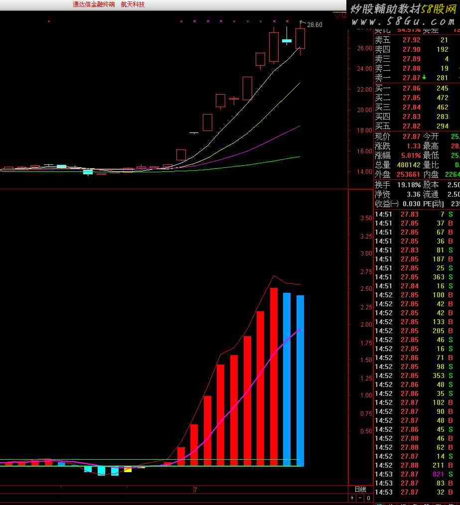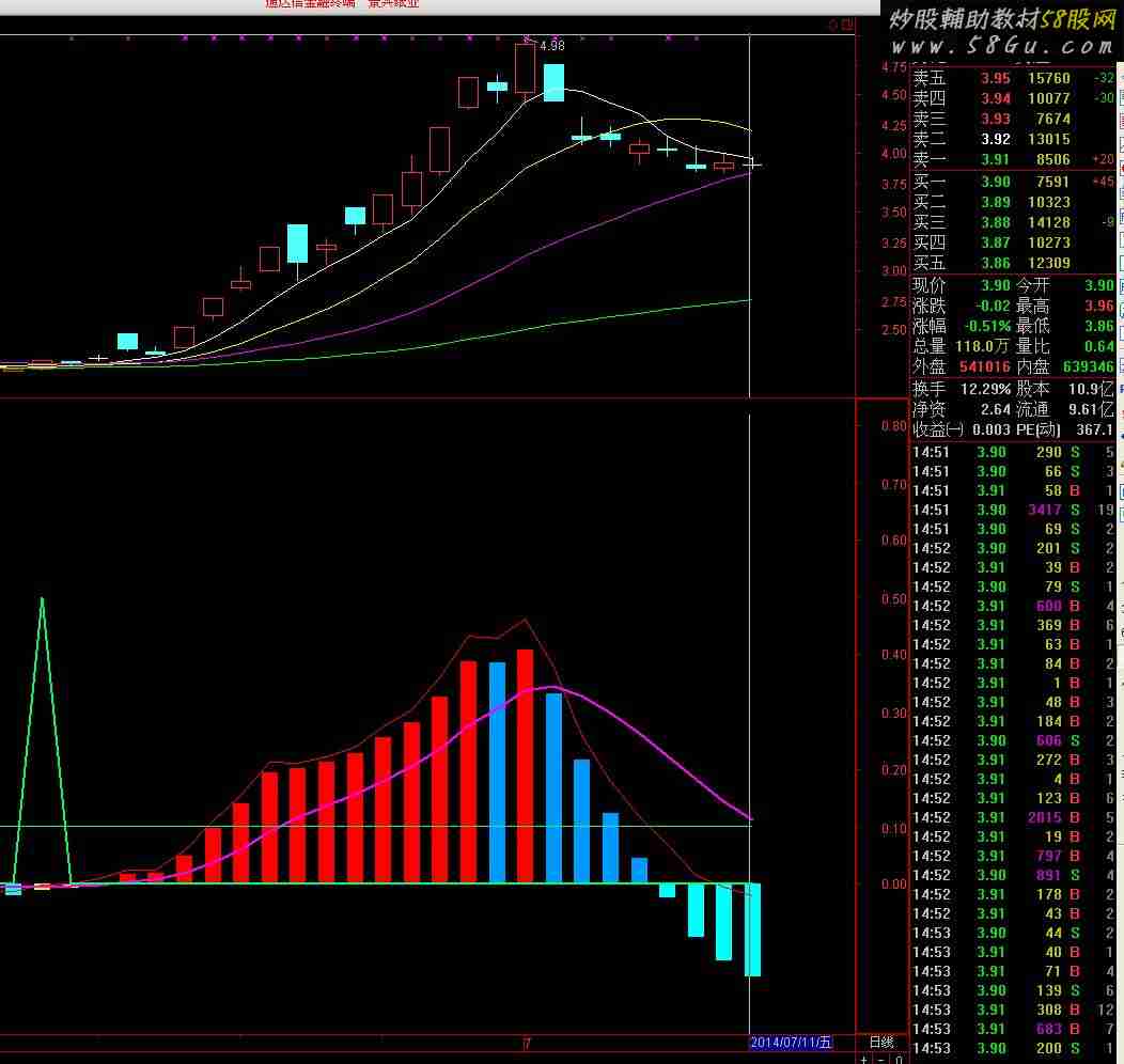 DIF:=EMA(CLOSE,12) - EMA(CLOSE,26);DEA:=EMA(DIF,9);MACD:2*(DIF-DEA),COLORSTICK;A4:=BARSLAST(REF(CROSS(DIF,DEA),1));B1:=REF(C,A4+1)>C AND REF(DIF,A4+1)<DIF AND CROSS(DIF,DEA);DRAWTEXT(FILTER(B1>0,5),DIF+0.2,'背离'),COLORYELLOW;操盘:STICKLINE(MACD>=0 AND MACD>=REF(MACD,1),0,MACD,2,0),COLORRED{COLOR6058FF};减仓:STICKLINE(MACD>=0 AND MACD< REF(MACD,1),0,MACD,2,0),COLORFF9900{COLOR6058FF};反弹:STICKLINE(MACD<0 AND MACD>=REF(MACD,1),0,MACD,2,0),COLORYELLOW{COLORFFFF00};寻底:STICKLINE(MACD<0 AND MACD< REF(MACD,1),0,MACD,2,0),COLORFFFF00;{空仓:0,COLORWHITE;IF(DIF<0,DIF,0),COLORYELLOW,LINETHICK1;IF(DIF<0,0,DIF),COLORRED,LINETHICK1;IF(DIF<DEA,DIF,DEA),COLORWHITE,LINETHICK1;IF(DIF>DEA,DEA,DEA),COLORGREEN,LINETHICK1;}RSV:=(CLOSE-LLV(LOW,9))/(HHV(HIGH,9)-LLV(LOW,9))*100;K:=SMA(RSV,3,1);D:=SMA(K,3,1);J:=3*K-2*D;周K:=MA("KDJ.K#WEEK"(9,3,3) ,5);周D:=MA("KDJ.D#WEEK"(9,3,3) ,5);周J:=MA("KDJ.J#WEEK"(9,3,3) ,5);DRAWICON(K<20 AND CROSS(K,D),MACD,1);周金:DRAWTEXT(CROSS("KDJ.K#WEEK"(9,3,3),"KDJ.D#WEEK"(9,3,3)) ,MACD,'▲'),COLORRED;周死:DRAWTEXT(CROSS("KDJ.D#WEEK"(9,3,3),"KDJ.K#WEEK"(9,3,3)) ,MACD*1.5,'▼'),COLORGREEN;月金:DRAWTEXT(CROSS("KDJ.K#MONTH"(9,3,3),"KDJ.D#MONTH"(9,3,3)) ,MACD,'▲'),COLORMAGENTA;月死:DRAWTEXT(CROSS("KDJ.D#MONTH"(9,3,3),"KDJ.K#MONTH"(9,3,3)) ,MACD*1.5,'▼'),COLORYELLOW;VAR1C:=(HIGH - MIN(OPEN,CLOSE));VAR2C:=(CLOSE - OPEN);VAR3C:=(MIN(OPEN,CLOSE) - LOW);VAR4C:=(HIGH - LOW);VAR5C:=((VOL * VAR1C) / VAR4C);VAR6C:=((VOL * VAR2C) / VAR4C);VAR7C:=((VOL * VAR3C) / VAR4C);VAR8C:=((VAR5C - VAR6C) - VAR7C);VAR4:=MA(CLOSE,5);VAR5:=MA(CLOSE,10);VAR6:=MA(CLOSE,30);VAR7:=MA(CLOSE,60);VAR8:=EMA(COST(85),7);VAR9:=EMA(COST(15),7);VARA:=(SUM(((CLOSE * VOL) * 10),4) / SUM((VOL * 200),4));VARB:=(INTPART((VARA * 10)) / 10);VARC:=(SUM(((CLOSE * VOL) * 10),7) / SUM((VOL * 200),7));VARD:=(INTPART((VARC * 10)) / 10);VARE:=(SUM(((CLOSE * VOL) * 10),28) / SUM((VOL * 200),28));VARF:=(INTPART((VARE * 10)) / 10);短线趋势:(EMA(CLOSE,5) - EMA(CLOSE,10)),COLORRED,LINETHICK1;中线趋势:EMA(短线趋势,9),COLORMAGENTA,LINETHICK2;VAR10:=((0 - ((10 * (HHV(CLOSE,5) - CLOSE)) / (HHV(CLOSE,5) - LLV(LOW,5)))) + 10);VAR11:=((0 - ((10 * (HHV(CLOSE,10) - CLOSE)) / (HHV(CLOSE,10) - LLV(LOW,10)))) + 10);VAR12:=((0 - ((10 * (HHV(CLOSE,20) - CLOSE)) / (HHV(CLOSE,20) - LLV(LOW,20)))) + 10);VAR13:=((0 - ((10 * (HHV(CLOSE,30) - CLOSE)) / (HHV(CLOSE,30) - LLV(LOW,30)))) + 10);VAR14:=REF(中线趋势,1);VAR15:=中线趋势;VAR16:=(VAR15 - VAR14);VAR17:=REF(短线趋势,1);VAR18:=短线趋势;VAR19:=(VAR18 - VAR17);VAR1A:=OPEN;VAR1B:=CLOSE;庄家吸筹:IF((((((((VAR1A <= VAR4) AND (VAR1A <= VAR5)) AND (VAR1A <= VAR6)) AND (VAR1B >= VAR4)) AND (VAR1B >= VARF)) AND (VAR16 > 0)) AND (VAR19 > 0)),0.5,0),LINETHICK2,COLOR66FF00;短线指标:IF(((((CROSS(短线趋势,中线趋势) AND (短线趋势 < 0)) AND (中线趋势 < (0 - 0.2))) AND (VAR11 > 45)) AND (VAR16 > 0)),0.3,0.1),COLOR66FF00;  |