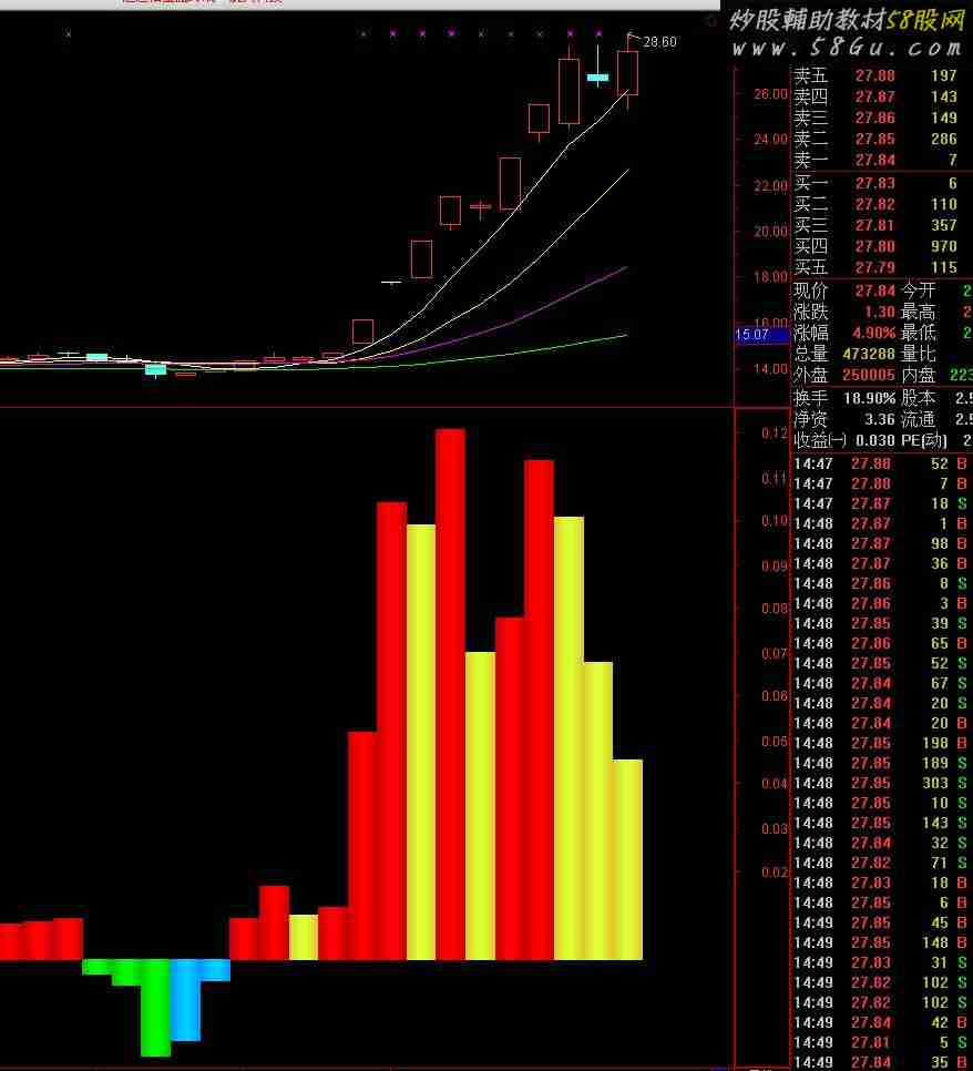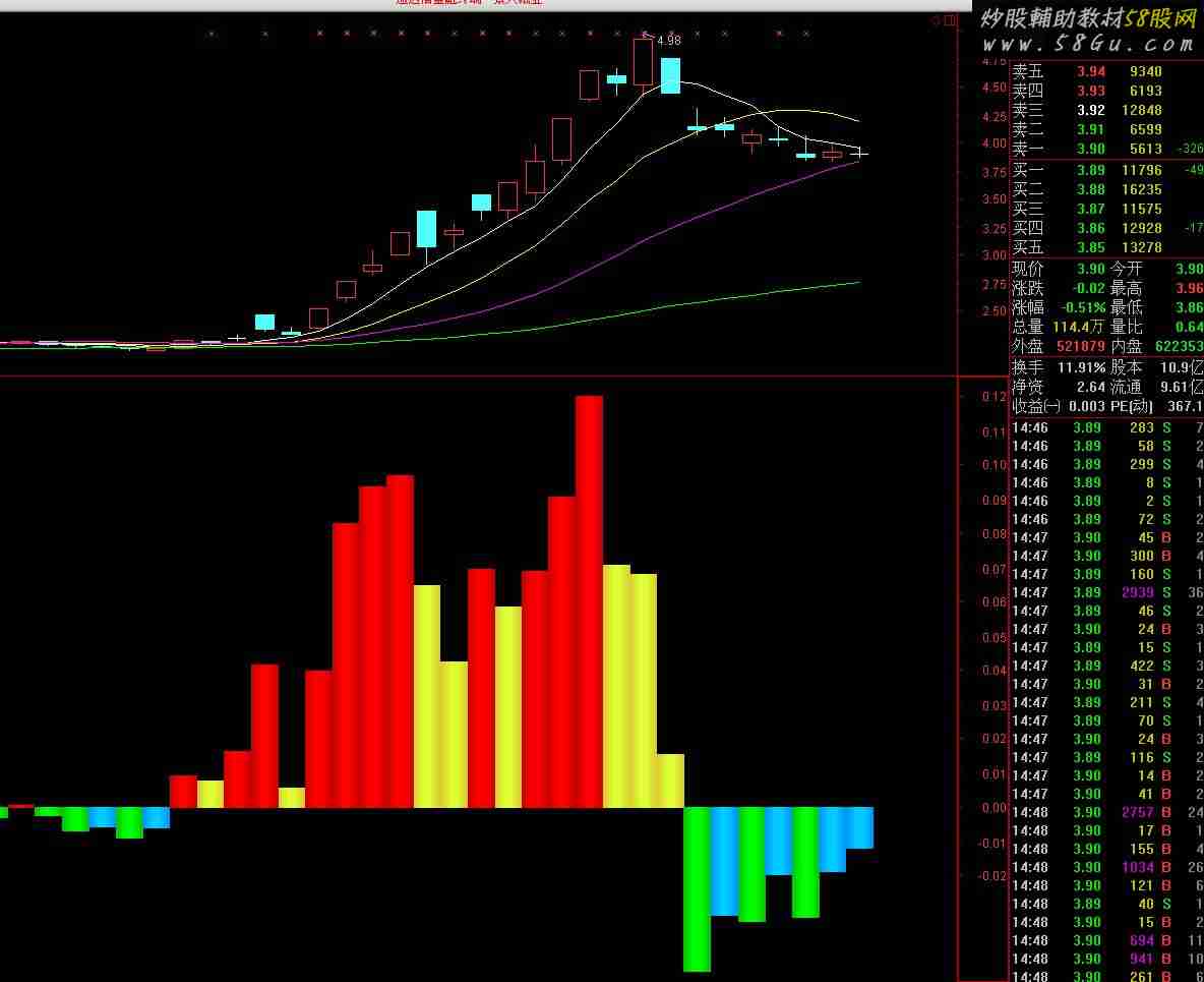 TT:=(2*CLOSE+OPEN+HIGH+LOW);主导动能:TT/EMA(TT,4)-1,COLORSTICK;FF:=主导动能;STICKLINE(FF<REF(FF,1)AND FF>0,0,FF,4,0),COLOR33CFDD;STICKLINE(FF<REF(FF,1)AND FF>0,0,FF,3,0),COLOR33DFDD;STICKLINE(FF<REF(FF,1)AND FF>0,0,FF,2,0),COLOR33EFDD;STICKLINE(FF<REF(FF,1)AND FF>0,0,FF,1,0),COLOR33FFDD;STICKLINE(FF<REF(FF,1)AND FF<0,0,FF,4,0),COLOR00CC00;STICKLINE(FF<REF(FF,1)AND FF<0,0,FF,3,0),COLOR00DD00;STICKLINE(FF<REF(FF,1)AND FF<0,0,FF,2,0),COLOR00EE00;STICKLINE(FF<REF(FF,1)AND FF<0,0,FF,1,0),COLOR00FF00;STICKLINE(FF>REF(FF,1)AND FF<0,0,FF,4,0),COLORFF9900;STICKLINE(FF>REF(FF,1)AND FF<0,0,FF,3,0),COLORFFAA00;STICKLINE(FF>REF(FF,1)AND FF<0,0,FF,2,0),COLORFFBB00;STICKLINE(FF>REF(FF,1)AND FF<0,0,FF,1,0),COLORFFCC00;STICKLINE(FF>REF(FF,1)AND FF>0,0,FF,4,0),COLOR0000CC;STICKLINE(FF>REF(FF,1)AND FF>0,0,FF,3,0),COLOR0000DD;STICKLINE(FF>REF(FF,1)AND FF>0,0,FF,2,0),COLOR0000EE;STICKLINE(FF>REF(FF,1)AND FF>0,0,FF,1,0),COLOR0000FF;  |