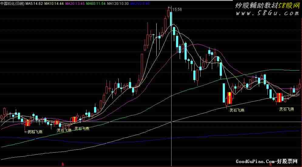 MA1:MA(CLOSE,5); MA2:MA(CLOSE,10); MA3:MA(CLOSE,20); MA4:MA(CLOSE,60); MA5:MA(CLOSE,120); MA6:MA(CLOSE,250); 圣:=EMA(C,250); 灵:=COUNT(C>圣,10)>=8 AND (CROSS(L,圣*1.02) OR CROSS(L,圣)); 石:=FILTER(COUNT(灵,3) AND C>圣,5); DRAWTEXT(石,L*0.97 , '灵石飞燕'),COLORYELLOW; STICKLINE(石,H,L,6,0),LINETHICK1,COLORRED; STICKLINE(石,H,L,0.2,0),COLORYELLOW; STICKLINE(石,O,C,2,0),LINETHICK1,COLORYELLOW; DRAWICON(石,(H+L)/2,7); {圣灵石之灵石飞燕指标用法:1灵石飞燕出,成就的是阳K线!2灵石飞燕出,失败的是长阴K线!}