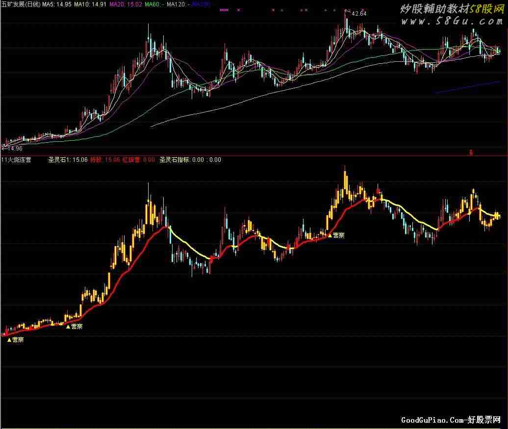圣灵石:=SMA(SMA((CLOSE-LLV(LOW,35))/(HHV(HIGH,35)-LLV(LOW,35))*100,13,1),13,1); STICKLINE(EMA(圣灵石,3)>REF(EMA(圣灵石,3),1),O,C,3,0),COLOR0000FF; STICKLINE(EMA(圣灵石,3)>REF(EMA(圣灵石,3),1),O,C,1.5,0),COLORF0F000; STICKLINE(EMA(圣灵石,3)>REF(EMA(圣灵石,3),1),O,C,1.3,0),COLOR008888; STICKLINE(EMA(圣灵石,3)>REF(EMA(圣灵石,3),1),O,C,1.0,0),COLOR00AAAA; STICKLINE(EMA(圣灵石,3)>REF(EMA(圣灵石,3),1),O,C,1.5,0),COLOR00CCCC; STICKLINE(EMA(圣灵石,3)>REF(EMA(圣灵石,3),1),O,C,1.3,0),COLOR00FFFF; 圣灵石1:EMA(C,18),LINETHICK3,COLORYELLOW; 持股:IF(圣灵石1>=REF(圣灵石1,1),圣灵石1,DRAWNULL),COLORRED,LINETHICK3; 红旗营:IF(((INDEXC-MA(INDEXC,6))/MA(INDEXC,6)*100 +(INDEXC-MA(INDEXC,12))/MA(INDEXC,12)*100 + (INDEXC-MA(INDEXC,24))/MA(INDEXC,24)*100)/3>REF(((INDEXC-MA(INDEXC,6))/MA(INDEXC,6)*100 +(INDEXC-MA(INDEXC,12))/MA(INDEXC,12)*100 + (INDEXC-MA(INDEXC,24))/MA(INDEXC,24)*100)/3,1) AND CROSS(((C-MA(C,6))/MA(C,6)*100 + (C-MA(C,12))/MA(C,12)*100 + (C-MA(C,24))/MA(C,24)*100)/3,((INDEXC-MA(INDEXC,6))/MA(INDEXC,6)*100 +(INDEXC-MA(INDEXC,12))/MA(INDEXC,12)*100 + (INDEXC-MA(INDEXC,24))/MA(INDEXC,24)*100)/3),10,0 ),NODRAW,COLORRED; STICKLINE(红旗营,O,C,4,0),COLORRED; 圣灵石指标:0,COLORYELLOW; 圣:=((((IF(CLOSE>OPEN,VOL/((HIGH-LOW)*2-ABS(CLOSE-OPEN))*(HIGH-LOW),IF(CLOSE<OPEN,VOL/((HIGH-LOW)*2-ABS(CLOSE-OPEN))*(HIGH-OPEN+CLOSE-LOW),VOL/2))+IF(CLOSE>OPEN,0-VOL/((HIGH-LOW)*2-ABS(CLOSE-OPEN))*(HIGH-CLOSE+OPEN-LOW),IF(CLOSE<OPEN,0-VOL/((HIGH-LOW)*2-ABS(CLOSE-OPEN))*(HIGH-LOW),0-VOL/2)))/20)/1.15*0.55+(REF(((IF(CLOSE>OPEN,VOL/((HIGH-LOW)*2-ABS(CLOSE-OPEN))*(HIGH-LOW),IF(CLOSE<OPEN,VOL/((HIGH-LOW)*2-ABS(CLOSE-OPEN))*(HIGH-OPEN+CLOSE-LOW),VOL/2))+IF(CLOSE>OPEN,0-VOL/((HIGH-LOW)*2-ABS(CLOSE-OPEN))*(HIGH-CLOSE+OPEN-LOW),IF(CLOSE<OPEN,0-VOL/((HIGH-LOW)*2-ABS(CLOSE-OPEN))*(HIGH-LOW),0-VOL/2)))/20)/1.15,1)*0.33))+(REF(((IF(CLOSE>OPEN,VOL/((HIGH-LOW)*2-ABS(CLOSE-OPEN))*(HIGH-LOW),IF(CLOSE<OPEN,VOL/((HIGH-LOW)*2-ABS(CLOSE-OPEN))*(HIGH-OPEN+CLOSE-LOW),VOL/2))+IF(CLOSE>OPEN,0-VOL/((HIGH-LOW)*2-ABS(CLOSE-OPEN))*(HIGH-LOW)*(HIGH-CLOSE+OPEN-LOW),IF(CLOSE<OPEN,0-VOL/((HIGH-LOW)*2-ABS(CLOSE-OPEN))*(HIGH-LOW),0-VOL/2)))/20)/1.15,2)*0.22)); 灵:=EMA(圣,3);0,POINTDOT,COLORWHITE; 石1:=SUM(灵,1),COLORCYAN; 石2:=SUM(灵,2),COLORCYAN; 石3:=SUM(灵,3),COLORCYAN; 石4:=SUM(灵,4),COLORCYAN; 石5:=SUM(灵,5),COLORCYAN; 石6:=SUM(灵,6),COLORCYAN; 石7:=SUM(灵,7),COLORCYAN; 石8:=SUM(灵,8),COLORCYAN; 石9:=SUM(灵,9),COLORCYAN; 石10:=SUM(灵,10),COLORCYAN; 火1:=IF(石1>REF(石1,1),石1,DRAWNULL),COLORRED; 火2:=IF(石2>REF(石2,1),石2,DRAWNULL),COLORRED; 火3:=IF(石3>REF(石3,1),石3,DRAWNULL),COLORRED; 火4:=IF(石4>REF(石4,1),石4,DRAWNULL),COLORRED; 火5:=IF(石5>REF(石5,1),石5,DRAWNULL),COLORRED; 火6:=IF(石6>REF(石6,1),石6,DRAWNULL),COLORRED; 火7:=IF(石7>REF(石7,1),石7,DRAWNULL),COLORRED; 火8:=IF(石8>REF(石8,1),石8,DRAWNULL),COLORRED; 火9:=IF(石9>REF(石9,1),石9,DRAWNULL),COLORRED; A10:=IF(石10>REF(石10,1),石10,DRAWNULL),COLORRED; 圣灵石2:=石1 AND 石2 AND 石3 AND 石4 AND 石5 AND 石6 AND 石7 AND 石8 AND 石9 AND 石10 AND (CLOSE-OPEN)>=((MA(C,3)+MA(C,6)+MA(C,12)+MA(C,24))/4+6*STD((MA(C,3)+MA(C,6)+MA(C,12)+MA(C,24))/4,11)-(MA(C,3)+MA(C,6)+MA(C,12)+MA(C,24))/4) AND V/REF(V,1)>=1.9; DRAWTEXT(VOL>REF(V,1)*1.9 AND 圣灵石2,L*0.99,'▲营寨'),COLORYELLOW; 圣灵石3:=火1 AND 火2 AND 火3 AND 火4 AND 火5 AND 火6 AND 火7 AND 火8 AND 火9 AND 火10; DRAWTEXT(圣灵石3 AND VOL>REF(V,1)*1.9 ,L*0.97,'▲卒'),COLORYELLOW; |
