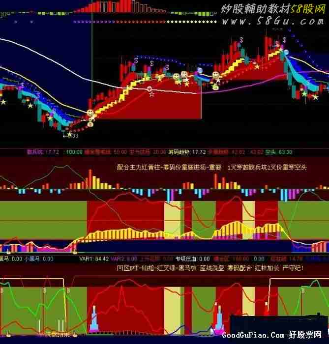 高1:=REF(HHV(H,120),3); 低1:=REF(LLV(L,120),3);H1:=高1-(高1-低1)*0.191; H2:=高1-(高1-低1)*0.382; H3:=高1-(高1-低1)*0.5; H4:=高1-(高1-低1)*0.618; H5:=高1-(高1-低1)*0.809; 突破:=REF(EMA(C,14),1); A1X:=(EMA(C,10)-突破)/突破*100; 基准:=IF(A1X>=0,REF(EMA(C,10),BARSLAST(CROSS(A1X,0))+1),REF(EMA(C,10),BARSLAST(CROSS(0,A1X))+1)); STICKLINE(A1X>=0,基准,突破+0.001*C,10.4,0),COLORYELLOW; STICKLINE(A1X<0,基准,突破-0.001*C,10.4,0),COLORGREEN; STICKLINE(A1X>=0,基准,突破,10,0),COLOR000099; STICKLINE(A1X<0,基准,突破,10,0),COLOR320000;HH0:=CONST(HHV(H,75)); LL0:=CONST(LLV(L,75)); MM0:=CONST((HH0+LL0)/2); HL0:=CONST(IF(CONST(C)>=MM0,LL0-(HH0-LL0)*0.2,HH0+(HH0-LL0)*0.2)); HH1:=IF(CONST(C)<MM0,HH0*1.01,HL0); LL1:=IF(CONST(C)>=MM0,LL0*0.99,HL0); HL1:=(HH1+LL1)/2,COLORFFFFFF; STICKLINE("MACD.MACD">0,"MACD.MACD"+HL1,HL1,2.5,1),COLOR007FFF; STICKLINE("MACD.MACD">0 AND "MACD.MACD">REF("MACD.MACD",1), "MACD.MACD"+HL1,HL1,2.5,0),COLORRED; STICKLINE("MACD.MACD"<0,"MACD.MACD"+HL1,HL1,2.5,0),COLOR00D080; STICKLINE("MACD.MACD"<0 AND "MACD.MACD">REF("MACD.MACD",1), "MACD.MACD"+HL1,HL1,2.5,1),COLOR00D080; IF("MACD.DIF">0,HL1*0.975,DRAWNULL),COLOR0000FF,LINETHICK1,CIRCLEDOT; IF("MACD.DIF">0 AND "MACD.MACD"<0,HL1*0.975,DRAWNULL),COLOR00FFFF,CIRCLEDOT; IF("MACD.DIF"<0 AND "MACD.MACD">0,HL1*0.975,DRAWNULL),COLORFF0080,CIRCLEDOT;JJ:=(CLOSE+HIGH+LOW)/3; A:=EMA(JJ,10); B:=REF(A,1); STICKLINE(A>B,A,B,5,0),COLORYELLOW; STICKLINE(A<B,A,B,5,0),COLORBLUE;TT:=IF(ISLASTBAR,240/FROMOPEN,1); NN:=120; HH:=HHV(V*TT,NN); LL:=LLV(V,NN); 最高:=CONST(HH); 最低:=CONST(LL); 最高2:=CONST(HHV(H,NN)); 最低2:=CONST(LLV(L,NN)); PP:=IF((最高2*0.9-(最高2-最低2)*0.5)>CONST(LLV(L,20)),0.9,IF((最高2*0.9-(最高2-最低2)*0.5)>CONST(LLV(L,50)),0.7,0.6)),NODRAW; RCC1:=最高2*0.9-(最高2-最低2)*PP; 最低3:=MIN(RCC1,最低2); AA:=最低3; MA5:=EMA(C,5),NODRAW; MAR5:=SMA(C,5,1),COLORYELLOW,LINETHICK4; MA20:MA(C,20),COLORRED,LINETHICK2; MA55:MA(C,55),COLORFF00FF,LINETHICK2; DRAWBAND(MAR5,RGB(0,200,200),MA5,RGB(200,0,0));JRH:=HHV(C,2); JRL:=LLV(C,2); MA3:=MA(CLOSE,3); YTSL:=(3*CLOSE+LOW+OPEN+HIGH)/6; VAR1:=(CLOSE>REF(CLOSE,1) AND CLOSE>REF(CLOSE,2)); VAR2:=(REF(VAR1,1) AND CLOSE<=REF(CLOSE,1) AND CLOSE>=REF(CLOSE,2)); VAR3:=(REF(VAR2,1) AND CLOSE>=REF(CLOSE,1) AND CLOSE<=REF(CLOSE,2)); VAR4:=(REF(VAR3,1) AND CLOSE<=REF(CLOSE,1) AND CLOSE>=REF(CLOSE,2)); VAR5:=(REF(VAR4,1) AND CLOSE>=REF(CLOSE,1) AND CLOSE<=REF(CLOSE,2)); VAR6:=(REF(VAR5,1) AND CLOSE<=REF(CLOSE,1) AND CLOSE>=REF(CLOSE,2)); VAR7:=(REF(VAR6,1) AND CLOSE>=REF(CLOSE,1) AND CLOSE<=REF(CLOSE,2)); VAR8:=(REF(VAR7,1) AND CLOSE<=REF(CLOSE,1) AND CLOSE>=REF(CLOSE,2)); VAR9:=(REF(VAR8,1) AND CLOSE>=REF(CLOSE,1) AND CLOSE<=REF(CLOSE,2)); VARA:=(REF(VAR9,1) AND CLOSE<=REF(CLOSE,1) AND CLOSE>=REF(CLOSE,2)); VARB:=(REF(VARA,1) AND CLOSE>=REF(CLOSE,1) AND CLOSE<=REF(CLOSE,2)); VARC:=(REF(VARB,1) AND CLOSE<=REF(CLOSE,1) AND CLOSE>=REF(CLOSE,2)); VARD:=(CLOSE<REF(CLOSE,1) AND CLOSE<REF(CLOSE,2)); VARE:=(REF(VARD,1) AND CLOSE>=REF(CLOSE,1) AND CLOSE<=REF(CLOSE,2)); VARF:=(REF(VARE,1) AND CLOSE<=REF(CLOSE,1) AND CLOSE>=REF(CLOSE,2)); VAR10:=(REF(VARF,1) AND CLOSE>=REF(CLOSE,1) AND CLOSE<=REF(CLOSE,2)); VAR11:=(REF(VAR10,1) AND CLOSE<=REF(CLOSE,1) AND CLOSE>=REF(CLOSE,2)); VAR12:=(REF(VAR11,1) AND CLOSE>=REF(CLOSE,1) AND CLOSE<=REF(CLOSE,2)); VAR13:=(REF(VAR12,1) AND CLOSE<=REF(CLOSE,1) AND CLOSE>=REF(CLOSE,2)); VAR14:=(REF(VAR13,1) AND CLOSE>=REF(CLOSE,1) AND CLOSE<=REF(CLOSE,2)); VAR15:=(REF(VAR14,1) AND CLOSE<=REF(CLOSE,1) AND CLOSE>=REF(CLOSE,2)); VAR16:=(REF(VAR15,1) AND CLOSE>=REF(CLOSE,1) AND CLOSE<=REF(CLOSE,2)); VAR17:=(REF(VAR16,1) AND CLOSE<=REF(CLOSE,1) AND CLOSE>=REF(CLOSE,2)); VAR18:=(REF(VAR17,1) AND CLOSE>=REF(CLOSE,1) AND CLOSE<=REF(CLOSE,2)); VAR19:=((REF(VARD OR VARE OR VARF OR VAR10 OR VAR11 OR VAR12 OR VAR13 OR VAR14 OR VAR15 OR VAR16 OR VAR17 OR VAR18,1)) AND VAR1); VAR1A:=((REF(VAR1 OR VAR2 OR VAR3 OR VAR4 OR VAR5 OR VAR6 OR VAR7 OR VAR8 OR VAR9 OR VARA OR VARB OR VARC,1)) AND VARD); 红色持股:VAR1 OR VAR2 OR VAR3 OR VAR4 OR VAR5 OR VAR6 OR VAR7 OR VAR8 OR VAR9 OR VARA OR VARB OR VARC,COLOR0000FF,NODRAW; 短买:VAR19,COLOR33AACC,NODRAW; 品红离场:VAR1A,COLORFF99FF,NODRAW; STICKLINE(C>=O,L,H,0,0),COLOR0000CC; STICKLINE(C<O,L,H,0,0),COLOR999900; STICKLINE(1,C,O,3.5,0),COLOR858500; STICKLINE(C>=O,C,O,3.5,0),COLOR0000E5; STICKLINE(红色持股,CLOSE,O,2.8,0),COLOR000055; STICKLINE(红色持股,CLOSE,O,2,0),COLOR000088; STICKLINE(红色持股,CLOSE,O,1.5,0),COLOR0000AA; STICKLINE(红色持股,CLOSE,O,1,0),COLOR0000CC; STICKLINE(红色持股,CLOSE,O,0.5,0),COLOR0000EE; CO:=(C-O); STICKLINE(短买,O,O+CO/3,2.8,0),COLOR335555; STICKLINE(短买,O,O+CO/3,2,0),COLOR338888; STICKLINE(短买,O,O+CO/3,1.5,0),COLOR33AAAA; STICKLINE(短买,O,O+CO/3,1,0),COLOR33CCCC; STICKLINE(短买,O,O+CO/3,0,0),COLOR33EEEE; STICKLINE(品红离场,O,O+CO/3,2.8,0),COLOR550055; STICKLINE(品红离场,O,O+CO/3,2,0),COLOR880088; STICKLINE(品红离场,O,O+CO/3,1.5,0),COLORAA00AA; STICKLINE(品红离场,O,O+CO/3,1,0),COLORCC00CC; STICKLINE(品红离场,O,O+CO/3,0.5,0),COLOREE00EE;币:IF(SAR(10,2,20)>=H,SAR(10,2,20),DRAWNULL),CIRCLEDOT,COLORBLUE; 股:IF(SAR(10,2,20)<=L,SAR(10,2,20),DRAWNULL),CIRCLEDOT,COLORRED; WJ:=(H+L+C)/3; DRAWICON(A1X>=0 AND REF(A1X,1)<0,L*0.98,9); DRAWICON(A1X<0 AND REF(A1X,1)>=0,H*1.02,14);IF(MA55<REF(MA55,1),MA55,DRAWNULL),COLORFFFFFF,LINETHICK2; IF(MA20<REF(MA20,1),MA20,DRAWNULL),COLOR00FFFF,LINETHICK2; DRAWICON( CROSS(C,MA20),MA20,5); DRAWTEXT( CROSS(C,MA20),MA20*0.995,'★'); DRAWICON( CROSS(MA20,MA55),MA20,23); DRAWTEXT( CROSS(MA20,MA55),MA20*0.995,'☆');DRAWTEXT(短买,REF(CLOSE,1),'★'),COLOR33FFCC; DRAWTEXT(品红离场,REF(CLOSE,1)+0.1,'$'),COLORFF99FF;