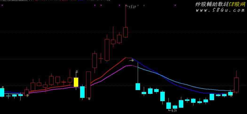 红色持股,绿色卖!ZJ:EMA(C,13),COLOR0000FF; HY:EMA(C,20),COLORFF00FF; ZJ升:IF(ZJ>REF(ZJ,1),ZJ,DRAWNULL),COLORRED,LINETHICK2; ZJ降:IF(ZJ<=REF(ZJ,1),ZJ,DRAWNULL),COLORBLUE,LINETHICK2; HY升:IF(HY>REF(HY,1),HY,DRAWNULL),COLORFF00FF,LINETHICK2; HY降:IF(HY<REF(HY,1),HY,DRAWNULL),COLORFFAA00,LINETHICK2; STICKLINE(C>ZJ,H,L,0,0),COLORRED; STICKLINE(C>ZJ,C,O,-1,1),COLORRED; STICKLINE(C=ZJ,H,L,0,0),COLORFFFFFF; STICKLINE(C<ZJ,H,L,0,0),COLOR00FFFF; STICKLINE(C<ZJ,O,C,-1,1),COLOR00FFFF; STICKLINE(C<HY,O,C,-1,1),COLORFFFF00; STICKLINE(C<HY,H,L,0,0),COLORCYAN; DRAWTEXT(CROSS(C,ZJ),L,'B'),COLOR00FFFF; DRAWTEXT(CROSS(C,HY),L*0.99,'B'),COLORFFFF00; DRAWTEXT(CROSS(ZJ,C),H,'S'),COLOR00FFFF; DRAWTEXT(CROSS(HY,C),H*1.01,'S'),COLORFFFF00;