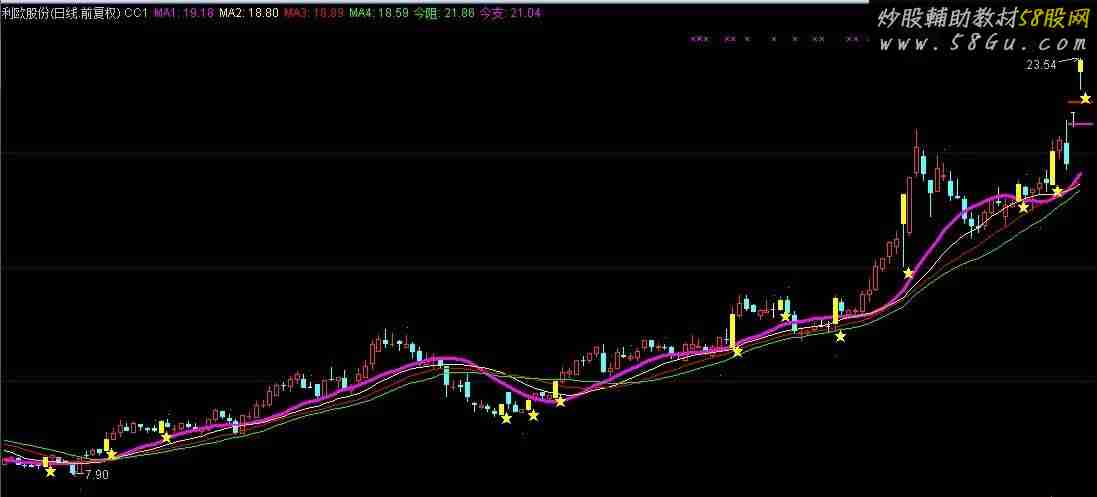 极品主图,还不赚钱不用炒股了,回家种田去吧!MA1:MA(CLOSE,15)LINETHICK3,COLORMAGENTA;MA2:MA(CLOSE,20)COLORYELLOW;MA3:MA(CLOSE,25)COLORRED;MA4:MA(CLOSE,30)COLORGREEN;BDGD:=C=HHV(C,20);GDSJ:=BARSLAST(BDGD);GJ:=(C+H+L+O)/4;明阻:=L+(GJ-L)+(C-L);明支:=L+(C-GJ);今阻:REF(明阻, 1),COLORGREEN,NODRAW;今支:REF(明支, 1),COLORFF00FF,NODRAW;STICKLINE(ISLASTBAR AND C>=今阻,今阻*1.0001,今阻*0.9999,15,0),COLOR0000FF;STICKLINE(ISLASTBAR AND C<今阻,今阻*1.0001,今阻*0.9999,15,0),COLOR00FF00;STICKLINE(ISLASTBAR AND C>=今支,今支*1.0001,今支*0.9999,15,0),COLORFF00FF;STICKLINE(ISLASTBAR AND C<今支,今支*1.0001,今支*0.9999,15,0),COLORFF8800;剑:=(2*CLOSE+LOW+HIGH)/4;刘:=EMA(剑,40)*0.85;DI:=EMA(C,12)-EMA(C,13);DE:=EMA(DI,3);RSV:=(C-LLV(L,9))/(HHV(H,9)-LLV(L,9))*100;DRAWTEXT(CROSS(DE,DI),H*1.03,'.'),COLOR00FF00;TJ:=VOL>=REF(V,1)*1.91 AND C>REF(C,1)*1.01;DRAWTEXT(CROSS(DI,DE),L*0.94,'.'),COLORFF33FF;DRAWTEXT(TJ,LOW*0.986,'★'),COLORYELLOW;STICKLINE(TJ,OPEN,CLOSE,1.5,0),COLORYELLOW; |