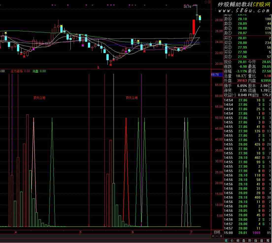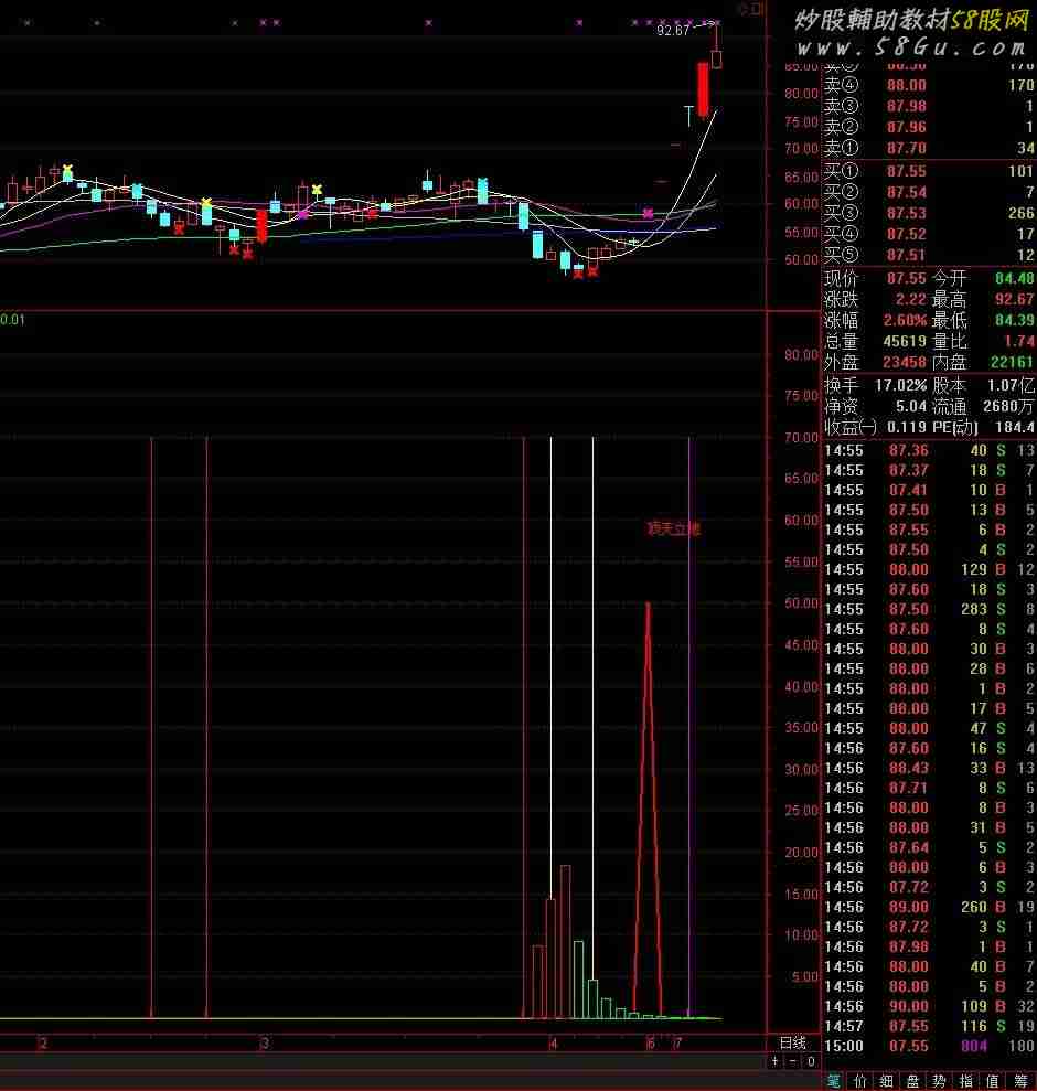 红/紫买入 黄灰卖出↑5:MA(CLOSE,M1);↑10:MA(CLOSE,M2);↑20:MA(CLOSE,M3);↑60:MA(CLOSE,M4);↑125:MA(CLOSE,M5);↑250:MA(CLOSE,M6);VAR3:=LLV(HIGH,240);VAR4:=100*(CLOSE-VAR3)/VAR3;VAR5:=(CLOSE-LLV(LOW,528))/(HHV(HIGH,528)-LLV(LOW,528))*100;VAR6:=(CLOSE-LLV(CLOSE,530))/(HHV(CLOSE,530)-LLV(CLOSE,530))*100;VAR7:=0;VAR8:=SMA(MAX(CLOSE-REF(CLOSE,1),0),34,1)/SMA(ABS(CLOSE-REF(CLOSE,1)),7,1)*100;VAR9:=SMA(MAX(CLOSE-REF(CLOSE,1),0),13,1)/SMA(ABS(CLOSE-REF(CLOSE,1)),13,1)*100;VARA:=BARSCOUNT(CLOSE);VARB:=VAR8<20 AND VAR9<23 AND VARA>35;VARC:=VARB AND COUNT(VARB,1)=1;VARD:=EMA(CLOSE,21)-EMA(CLOSE,8);VARE:=EMA(VARD,5);VARF:=TROUGHBARS(3,6,1)<4 AND CROSS(VARD,VARE);VAR10:=IF(TROUGHBARS(3,16,1)=0 AND HIGH>LOW+0.04,4,0);VAR11:=ZIG(3,6)>REF(ZIG(3,6),1) AND REF(ZIG(3,6),1)<=REF(ZIG(3,6),2) AND REF(ZIG(3,6),2)<=REF(ZIG(3,6),3);VAR12:=ZIG(3,6)<REF(ZIG(3,6),1) AND REF(ZIG(3,6),1)>=REF(ZIG(3,6),2) AND REF(ZIG(3,6),2)>=REF(ZIG(3,6),3);VAR13:=ZIG(3,22)>REF(ZIG(3,22),1) AND REF(ZIG(3,22),1)<=REF(ZIG(3,22),2) AND REF(ZIG(3,22),2)<=REF(ZIG(3,22),3);VAR14:=ZIG(3,22)<REF(ZIG(3,22),1) AND REF(ZIG(3,22),1)>=REF(ZIG(3,22),2) AND REF(ZIG(3,22),2)>=REF(ZIG(3,22),3);VAR15:=ZIG(3,51)>REF(ZIG(3,51),1) AND REF(ZIG(3,51),1)<=REF(ZIG(3,51),2) AND REF(ZIG(3,51),2)<=REF(ZIG(3,51),3);VAR16:=ZIG(3,51)<REF(ZIG(3,51),1) AND REF(ZIG(3,51),1)>=REF(ZIG(3,51),2) AND REF(ZIG(3,51),2)>=REF(ZIG(3,51),3);VAR17:=ZIG(3,72)>REF(ZIG(3,72),1) AND REF(ZIG(3,72),1)<=REF(ZIG(3,72),2) AND REF(ZIG(3,72),2)<=REF(ZIG(3,72),3);VAR18:=ZIG(3,72)<REF(ZIG(3,72),1) AND REF(ZIG(3,72),1)>=REF(ZIG(3,72),2) AND REF(ZIG(3,72),2)>=REF(ZIG(3,72),3);VAR19:=EMA(CLOSE,2)-EMA(CLOSE,150);VAR1A:=EMA(VAR19,100);VAR1B:=2*(VAR19-VAR1A);VAR1C:=POW(VAR1B,3)*0.1+POW(VAR1B,1);VAR1D:=SQRT(SQRT(LOW*HIGH*OPEN*CLOSE));VAR1E:=EMA(VAR1D*0.97,3);VAR1F:=(HIGH+LOW+CLOSE)/3;VAR20:=(VAR1F-MA(VAR1F,14))/(0.015*AVEDEV(VAR1F,14));VAR21:=CROSS(VAR1E,LOW);买1:=VAR10;买2:=(VAR11+VAR13+VAR15+VAR17);卖1:=(VAR12+VAR14+VAR16+VAR18);VAR22:=买1 AND VARF AND VARC AND VAR21 AND VAR4<0 AND VAR5=0 AND VAR6=0 AND VAR20<(-110);VAR1:=MA(CLOSE,5);VAR2:=MA(CLOSE,10);VAR3A:=MA(CLOSE,30);VAR4A:=MA(CLOSE,60);VAR5A:=EMA(COST(85),7);VAR6A:=EMA(COST(15),7);VAR7A:=SUM(CLOSE*VOL*100,4)/SUM(VOL*100,4);VAR8A:=INTPART(VAR7*100)/100;VAR9A:=SUM(CLOSE*VOL*100,7)/SUM(VOL*100,7);VARA1:=INTPART(VAR9*100)/100;VARB1:=SUM(CLOSE*VOL*100,28)/SUM(VOL*100,28);VARC1:=INTPART(VARB*100)/100;VARD1:=EMA(CLOSE,5)-EMA(CLOSE,10);VARE1:=EMA(VARD,9);VARF1:=(-100)*(HHV(CLOSE,5)-CLOSE)/(HHV(CLOSE,5)-LLV(LOW,5))+100;VAR10A:=(-100)*(HHV(CLOSE,10)-CLOSE)/(HHV(CLOSE,10)-LLV(LOW,10))+100;VAR11A:=(-100)*(HHV(CLOSE,20)-CLOSE)/(HHV(CLOSE,20)-LLV(LOW,20))+100;VAR12A:=(-100)*(HHV(CLOSE,30)-CLOSE)/(HHV(CLOSE,30)-LLV(LOW,30))+100;VAR13A:=REF(VARE,1);VAR14A:=VARE;VAR15A:=VAR14-VAR13;VAR16A:=REF(VARD,1);VAR17A:=VARD;VAR18A:=VAR17-VAR16;VAR19A:=OPEN;VAR1AA:=CLOSE;买3:=IF(VAR19<=VAR1 AND VAR19<=VAR2 AND VAR19<=VAR3 AND VAR1A>=VAR1 AND VAR1A>=VARC AND VAR15>0 AND VAR18>0,0.5,0);DRAWICON(买3>0,LOW-0.01,4);买:IF(买1>0 OR 买2>0,LOW-0.02,DRAWNULL),CROSSDOT,LINETHICK3,COLORRED;卖:IF(卖1>0,HIGH+0.02,DRAWNULL),CROSSDOT,LINETHICK3,COLORYELLOW;买线:=EMA(CLOSE,2); 卖线:=EMA(SLOPE(CLOSE,21)*20+CLOSE,42); 买1:IF(CROSS(买线,卖线),L-0.02,DRAWNULL),CROSSDOT,LINETHICK3,COLORMAGENTA; 卖2:IF(CROSS(卖线,买线),H+0.02,DRAWNULL),CROSSDOT,LINETHICK3,COLORFFFF00;C2:=REF(C,1);涨停:=IF((C-C2)*100/C2>=(10-0.01*100/C2),1,0);STICKLINE(涨停,OPEN,CLOSE,2,0),COLORRED;STICKLINE(涨停,H,L,0,0),COLORRED;跌停:=IF((C2-C)*100/C2>=(10-0.01*100/C2),1,0);STICKLINE(跌停,OPEN,CLOSE,2,0),COLORGREEN;STICKLINE(跌停,H,L,0,1),COLORGREEN;  |