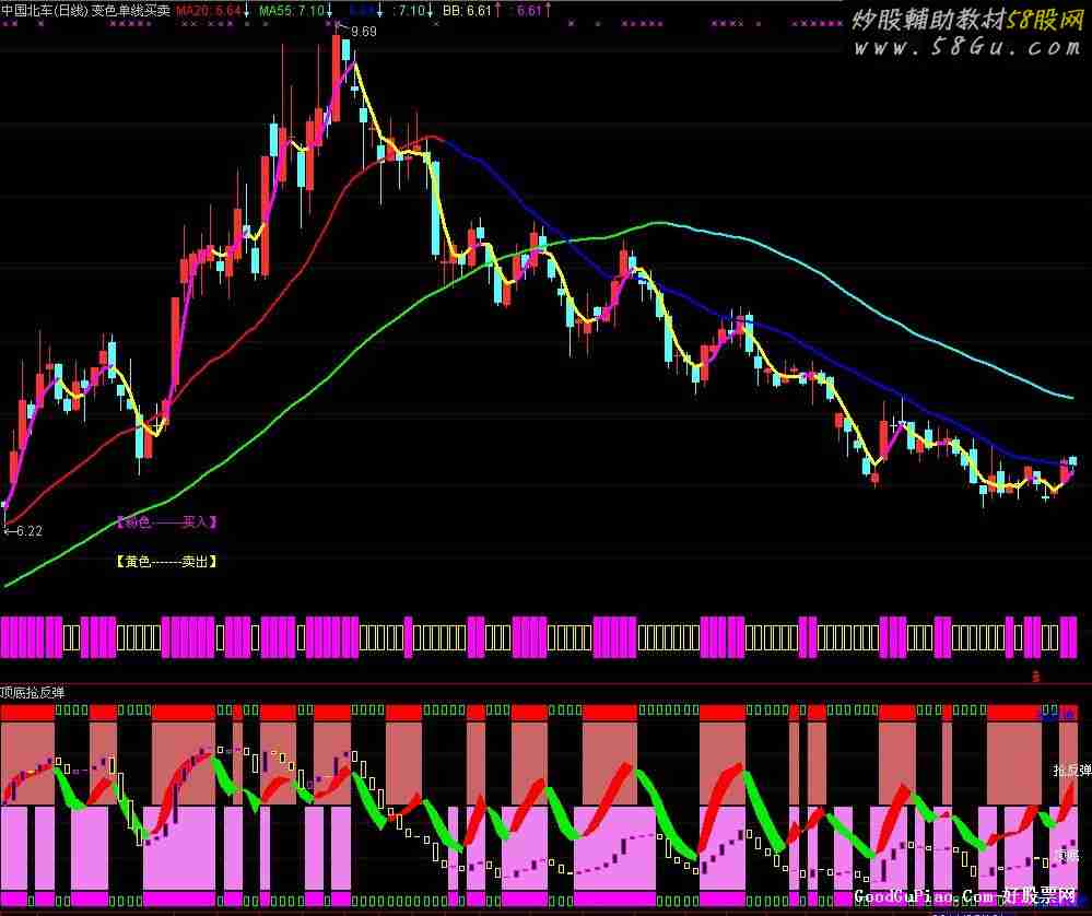 TT:=IF(ISLASTBAR,240/FROMOPEN,1); NN:=120; HH:=HHV(V*TT,NN); LL:=LLV(V,NN); 最高:=CONST(HH); 最低:=CONST(LL); 最高2:=CONST(HHV(H,NN)); 最低2:=CONST(LLV(L,NN)); PP:=IF((最高2*0.9-(最高2-最低2)*0.5)>CONST(LLV(L,20)),0.9,IF((最高2*0.9-(最高2-最低2)*0.5)>CONST(LLV(L,50)),0.7,0.6)),NODRAW; RCC1:=最高2*0.9-(最高2-最低2)*PP; 最低3:=MIN(RCC1,最低2); AA:=最低3; MA20:MA(C,20),COLORRED,LINETHICK2; MA55:MA(C,55),COLOR00FF00,LINETHICK2; IF(MA20<REF(MA20,1),MA20,DRAWNULL),COLORFF0000,LINETHICK2; IF(MA55<REF(MA55,1),MA55,DRAWNULL),COLORFFFF00,LINETHICK2; BB:MA(MA(CLOSE,3),1),LINETHICK3,COLOR00FFFF; IF(BB>=REF(BB,1),BB,DRAWNULL),COLORFF00FF,LINETHICK3; STICKLINE(BB>=REF(BB,1),AA-0.000*AA,AA-0.050*AA,3,0),COLORMAGENTA; STICKLINE(BB<REF(BB,1),AA-0.010*AA,AA-0.040*AA,3,1),COLORYELLOW; DRAWTEXT_FIX(1,0.1,0.76,0,'【粉色-------买入】'),COLORFF00FF; DRAWTEXT_FIX(1,0.1,0.82,0,'【黄色-------卖出】'),COLOR00FFFF;
