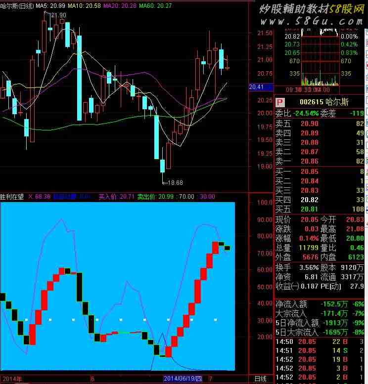 胜利在望指标,喜欢的请下载: 温馨提示: 1、任何指标,都要投入心血去进行研究,才能找到更好、更适合自己的实用方法。因为,没有任何一个指标,可以100%成功,有的话,你想老师会发上来吗,留在手中自己大赚不更好,呵呵!能够稳定赚钱的老师,都是心胸比较开阔的,包容性强的,有自己一套选股和资金管理方法的人,如果你是这样的人,那么恭喜你,你也快成功了,加油! 2、如果希望指标100%成功,使用指标时自己完全不需要用到自己大脑的,也就是希望不劳而获的话,请不要浪费你的宝贵的共享币。免得自己发出不好的评价的同时,也造成你自己的不舒服,影响你自己赚钱的步伐,甚至影响了你自己的身心健康,何必呢?STICKLINE(100,100,0,10,0),COLORFFB900,LINETHICK7;VAR1:=(HHV(HIGH,36)-CLOSE)/(HHV(HIGH,36)-LLV(LOW,36))*100;S:=SMA(VAR1,5,1),COLORRED;VAR2:=(CLOSE-LLV(LOW,8))/(HHV(HIGH,8)-LLV(LOW,8))*100;X:SMA(VAR2,2,1),COLORFF00FF ;VR4:=SMA(ABS(L-REF(L,1)),13,1)/SMA(MAX(L-REF(L,1),0),13,1);底部动量:IF(EMA(IF(L<=LLV(L,30),VR4,0),3)*10<100,EMA(IF(L<=LLV(L,30),VR4,0),3)*10,100),COLORBLUE;AA:=INTPART(底部动量);DD:=IF(AA>REF(HHV(AA,120),1),AA,0);VR2:=LLV(LOW,10);VR3:=HHV(HIGH,25);动力线:=IF(EMA((CLOSE-VR2)/(VR3-VR2)*4,4)*25<100,EMA((CLOSE-VR2)/(VR3-VR2)*4,4)*25,100),COLORYELLOW,LINETHICK1;STICKLINE(动力线>REF(动力线,1) ,动力线 ,REF(动力线,1),4 ,0),COLORRED;STICKLINE(动力线<=REF(动力线,1) ,动力线 ,REF(动力线,1),4 ,1),COLOR00FF00;CDP :=(HIGH + LOW + 2*CLOSE)/4;买入价:(2*CDP-HIGH),COLORRED , LINETHICK0 ;卖出价:(2*CDP-LOW) ,COLORWHITE, LINETHICK0 ;VAR3:=1/WINNER(CLOSE);VAR4:=EMA(CLOSE,13);VAR5:=100-ABS((CLOSE-VAR4)/VAR4)*100,COLORGREEN;黄金坑:=(100-IF(VAR3>10,IF(VAR3<100,VAR3,VAR5-90),0)),COLORGREEN,POINTDOT;70,POINTDOT;30,POINTDOT,COLORFF00FF ;VAR1A:=WINNER(CLOSE); VAR2A:=VOL/CAPITAL; VAR3A:=VAR2A/VAR1A; {两线重叠时间越长越好}JJ:=IF(VAR1A<50/100 ,VAR3A,0)*100; 财神线:=IF(JJ<100,JJ,0),COLORYELLOW;{STICKLINE(1,黄金坑,100,1,0)POINTDOT,COLORGREEN;}STICKLINE(黄金坑<=100,100,黄金坑,0.0005,0),POINTDOT,COLOR00FFFF;STICKLINE(财神线>=0,0,{财神线}底部动量,0.0005,0),POINTDOT,,COLOR00FFFF;JHH:=SUM(IF(CLOSE>REF(CLOSE,1),VOL,IF(CLOSE<REF(CLOSE,1),-VOL,0)),0);STICKLINE(ABS(JHH/WINNER(C))>1000000000,0,0,0,0),COLORFF00FF,LINETHICK5;DRAWTEXT((S-X)>=70 AND X<7,10,'★'),COLORRED;VARC:=CLOSE*50/100;VARD:=MA(VARC,30)*0.83;VARE:=MA(VARC/VARD,3);DRAWTEXT(FILTER(VARE<1.04,3),10,'★'),COLORYELLOW ;DRAWTEXT(CROSS(X,底部动量) AND 动力线>REF(动力线,1) AND C>L*1.03,100,'★'),COLORGREEN;DRAWTEXT(X>动力线*2 AND X>=80,90,'●'); |