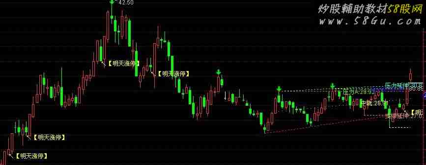 {压力支撑} HIGHN:=10;LOWN:=10;HIGHDISPLAY:=0;LOWDISPLAY:=0;ZGDISPLAY:=0;MADISPLAY:=0; AAB:=REF(H,HIGHN)=HHV(H,2*HIGHN+1); {HIGHN日前的最高价=2*HIGHN+1日内最高价的最高值} QY:=BACKSET(AAB,HIGHN+1);{若AA则将最近HIGHN+1周期置为1} CC:=FILTER(QY,HIGHN) AND H=HHV(H,HIGHN+1); {QY的HIGHN日过滤 AND 最高价=HIGHN+1日内最高价的最高值} DRAWICON(CC,H*1.005,2); DDD:=BARSLAST(CC);{上次CC距今天数} GDTS:=IF(CC,CURRBARSCOUNT,0);{如果CC,返回到最后交易日的周,否则返回0} DINGBU:=IF(DDD,REF(H,DDD),H);{顶部} DINGBUTS:=IF(DDD,REF(GDTS,DDD),GDTS); DINGBU1:=REF(DINGBU,DDD+1); GDCS1:=CONST(DINGBUTS); DINGBUTS1:=REF(DINGBUTS,DDD+1); GDCS2:=CONST(DINGBUTS1); DINGBU2:=REF(DINGBU1,DDD+1); MMM:=IF(CURRBARSCOUNT>GDCS2,0,1); 高点压力:DRAWLINE(CURRBARSCOUNT=GDCS2,H,CURRBARSCOUNT=GDCS1,H,1) COLORGREEN,DOTLINE; 压力A:DRAWLINE(CURRBARSCOUNT=GDCS2,H,ISLASTBAR,REF(H,GDCS2-1),1),COLOR0055FF,DOTLINE; 压力B:DRAWLINE(CURRBARSCOUNT=GDCS1,H,ISLASTBAR,REF(H,GDCS1-1),1),COLORYELLOW,DOTLINE; AA1:=REF(L,LOWN)=LLV(L,2*LOWN+1); QY1:=BACKSET(AA1,LOWN+1); CC1:=FILTER(QY1,LOWN) AND L=LLV(L,LOWN+1); {DRAWICON(CC1,L*0.98,1);} DD1:=BARSLAST(CC1); DDTS:=IF(CC1,CURRBARSCOUNT,0); YDB:=IF(DD1,REF(L,DD1),L); DDTS1:=IF(DD1,REF(DDTS,DD1),DDTS); DDCS1:=CONST(DDTS1); ZDB:=REF(YDB,DD1+1); DDTS2:=REF(DDTS1,DD1+1); DDCS2:=CONST(DDTS2); 低点支撑:DRAWLINE(CURRBARSCOUNT=DDCS2,L,CURRBARSCOUNT=DDCS1,L,1) COLORRED,DOTLINE; ZGSTAR:=(高点压力+低点支撑)/2; ZGEND:=CONST((高点压力+低点支撑)/2); STARDAY:=IF(DDCS2<GDCS2,DDCS2,GDCS2); 中轨:DRAWLINE(CURRBARSCOUNT=STARDAY,ZGSTAR,ISLASTBAR,ZGEND,1),POINTDOT,COLORFFBBFF,LINETHICK1; TTT:=6; A1:=REF(HIGH,6)=HHV(HIGH,2*TTT+1); B1:=FILTER(A1,TTT); C1:=BACKSET(B1,TTT+1); D1:=FILTER(C1,TTT); A2:=REF(LOW,TTT)=LLV(LOW,2*TTT+1); B2:=FILTER(A2,TTT); C2:=BACKSET(B2,TTT+1); D2:=FILTER(C2,TTT); E1:=(REF(LLV(LOW,2*TTT),1)+REF(HHV(HIGH,2*TTT),1))/2; E2:=(HIGH+LOW)/2; H1:=(D1 AND NOT(D2 AND E1>=E2)) OR BARSTATUS OR BARSCOUNT(CLOSE)=1; L1:=(D2 AND NOT(D1 AND E1<E2)); H2:=D1 AND NOT(D2 AND E1>=E2); X1:=REF(BARSLAST(H1),1)+1; F1:=BACKSET(H1 AND COUNT(L1,X1)>0,LLVBARS(IF(L1,LOW,10000),X1)); G1:=F1>REF(F1,1); I1:=BACKSET(G1,2); LD:=I1>REF(I1,1); L2:=LD OR BARSTATUS OR BARSCOUNT(CLOSE)=1; X2:=REF(BARSLAST(L2),1)+1; F2:=BACKSET(L2 AND COUNT(H2,X2)>0,HHVBARS(IF(H2,HIGH,0),X2)); G2:=F2>REF(F2,1); I2:=BACKSET(G2,2); HD:=I2>REF(I2,1); UU:=BACKSET(BARSTATUS,BARSLAST(LD)+1); VV:=UU>REF(UU,1); WW:=BACKSET(VV,REF(BARSLAST(LD),1)+2); XX:=WW>REF(WW,1); UU2:=BACKSET(BARSTATUS,BARSLAST(HD)+1); VV2:=UU2>REF(UU2,1); WW2:=BACKSET(VV2,REF(BARSLAST(HD),1)+2); XX2:=WW2>REF(WW2,1); 近低A:REF(L,BARSLAST(VV)),COLORWHITE,LINETHICK1,DOTLINE; 近低B:REF(L,BARSLAST(XX)),COLORLIRED,DOTLINE; DRAWTEXT(CURRBARSCOUNT=8,高点压力,STRCAT('压力延伸:',CON2STR(高点压力,2))),COLORCYAN; DRAWTEXT(CURRBARSCOUNT=8,低点支撑,STRCAT('支撑延伸:',CON2STR(低点支撑,2))),COLORLIRED; DRAWTEXT(CURRBARSCOUNT=15,中轨,STRCAT('中轨:',CON2STR(中轨,2))),COLORYELLOW; DRAWTEXT(CURRBARSCOUNT=20,压力A*0.995,STRCAT('压力A:',CON2STR(压力A,2))),COLORGREEN; DRAWTEXT(CURRBARSCOUNT=12,压力B*0.995,STRCAT('压力B:',CON2STR(压力B,2))),COLORBLUE; DRAWTEXT(CURRBARSCOUNT=12,近低A*1.005,STRCAT('←近低A:',CON2STR(近低A,2))),COLORRED; DRAWTEXT(CURRBARSCOUNT=20,近低B*1.005,STRCAT('←近低B:',CON2STR(近低B,2))),COLOR0018D8;AA:=C/REF(C,1)>1.095;DRAWTEXT(REFX(AA,1),LOW*0.99,'↖【明天涨停】'),COLORYELLOW;