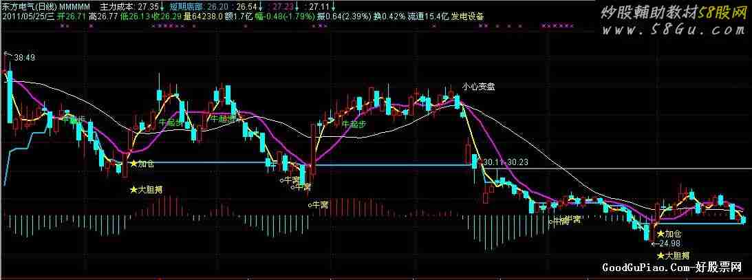 A:=(3*C+L+O+H)/6; X:=(20*A+19*REF(A,1)+18*REF(A,2)+17*REF(A,3)+16*REF(A,4)+15*REF(A,5)+ 14*REF(A,6)+13*REF(A,7)+12*REF(A,8)+11*REF(A,9)+10*REF(A,10)+9*REF(A,11)+8*REF(A,12) +7*REF(A,13)+6*REF(A,14)+5*REF(A,15)+4*REF(A,16)+3*REF(A,17)+2*REF(A,18)+ REF(A,20))/210; RCC:=DYNAINFO(3); S2:=SMA(C,3,1); S6:=SMA(C,5,1); DK:=2*(S2-S6); STICKLINE(DK>0,RCC,RCC+DK,0,1),COLORRED; STICKLINE(DK<0,RCC,RCC+DK,0,1),COLORCYAN; 主力成本:EMA(X,13),COLORFF00FF,LINETHICK0; 短期底部:LLV(HIGH,30),LINETHICK2,COLORFFCC00; IF(MA(C,3),MA(C,3),DRAWNULL),COLORYELLOW,LINETHICK2; IF(MA(C,9),MA(C,9),DRAWNULL),COLORMAGENTA,LINETHICK2; IF(MA(C,23.5),MA(C,23.5),DRAWNULL),COLORWHITE; DRAWKLINE(HIGH,OPEN,LOW,CLOSE); MA5:=MA(C,5); MA10:=MA(C,10); MA30:=MA(C,30); FA:=BARSLAST(CROSS(MA10,MA5)) AND CROSS(MA5,MA10); FB:=FA AND MA5>MA30 AND MA10>MA30 AND MA10>REF(MA10,1); DRAWTEXT(FB,L-0.58,'★红牛'),COLORRED; V1:=EMA(CLOSE,5); V2:=EMA(EMA(CLOSE,90)*1.01,10); DRAWTEXT(CROSS(V1,V2),V1+0.05,'牛起步'),COLOR00FF00; VAR1:=LLV(LOW,21); VAR2:=HHV(HIGH,21); AK1:=EMA((((CLOSE - VAR1) / (VAR2 - VAR1)) * 100),5); AK:=EMA((((CLOSE - VAR1) / (VAR2 - VAR1)) * 50),13); AB:=CROSS(AK1,AK); DRAWTEXT((AB = 1),(LOW * 0.99),'○牛窝'),COLORYELLOW; AA1:=AMOUNT/V; BB1:=L<AA1*0.9; CC1:=(C-REF(C,1))/REF(C,1)*100>1.2; DD1:=L<MA(C,5)*0.921; EE1:=V<MA(V,5)*1.5; 老鼠仓:=BB1 AND CC1 AND DD1 AND EE1,LINETHICK0,COLOR0099FF; DRAWTEXT(老鼠仓,L*0.99,'老鼠仓'),COLOR0099FF; VAR3AA:=IF((CLOSE>REF(CLOSE,1)),88,0); VAR4AA:=IF(((CLOSE)/(REF(CLOSE,1))>1.05) AND ((HIGH)/(CLOSE)<1.01) AND (VAR3AA>0),91,0); DRAWTEXT(FILTER((VAR4AA>90),45),(LOW)*(0.93),'★大胆搏 '),COLOR00FFFF; DRAWTEXT(FILTER((VAR4AA>90),35),(LOW)*(0.99000001),'★加仓'),COLOR00FFFF; A1AA:=9; A2AA:=(REF(CLOSE,A1AA+1)<CLOSE); DRAWTEXT(FILTER((A2AA>-0.5),84),(HIGH)*(1.05),'小心变盘'),COLORFFFFFF; VAR6:=REF(C,1); VAR7:=SMA(MAX(C-VAR6,0),6,1)/SMA(ABS(C-VAR6),6,1)*100; DRAWTEXT(CROSS(82,VAR7),H*1.01,'▼逃顶'),COLORYELLOW;