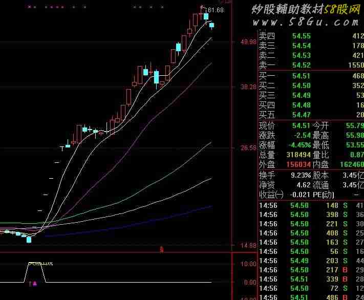 牛出现,翻翻概率非常大HLM1:=MA(HHV(H,485),17);HLM2:=MA(HHV(H,222),17);HLM3:=MA(HHV(H,96),17);HLM4:=MA(LLV(L,485),17);HLM5:=MA(LLV(L,222),17);HLM6:=MA(LLV(L,96),17);HLM7:=MA((HLM1*0.558+HLM2*0.558+HLM3*0.558+HLM4*0.96+HLM5*0.96+HLM6*0.96)/6,17);HLM8:=MA((HLM1*0.55+HLM2*0.55+HLM3*0.65+HLM4*1.25+HLM5*1.23+HLM6*1.2)/6,17);HLM9:=MA((HLM1*0.68+HLM2*0.68+HLM3*0.68+HLM4*1.3+HLM5*1.3+HLM6*1.3)/6,17);HLM10:=MA((HLM7*3+HLM8*2+HLM9)/6*1.738,17);HLM11:=SMA(ABS(L-REF(L,1)),3,1)/SMA(MAX(L-REF(L,1),0),3,1)*100;HLM12:=MA(IF(C*1.35<=HLM10,HLM11*10,HLM11/10),3);HLMH:=HHV(HLM12,30);关注:MA(IF(L<=LLV(L,13),(HLMH+HLM11*2)/2,0),3)/200,ColorFFFfff;DRAWTEXT(CROSS(关注,1.2),关注*0.5-6,'↑▲'),ColorFF00ff;DRAWTEXT(CROSS(关注,4.5),关注,'买点出现'),Color00Ffff;DRAWICON(CROSS(关注,7.0),关注*0.5-20,14);   |