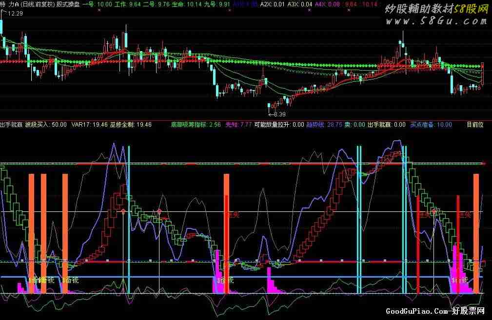 VAR1:=(CLOSE+HIGH+LOW+OPEN)/4; VAR2:=SUMBARS(VOL,CAPITAL); VAR3:=HHV(VAR1,VAR2); VAR4:=LLV(VAR1,VAR2); VAR5:=(2*VAR1-VAR4-REF(VAR4,1))/(VAR3-VAR4); VAR6:=(VAR1-VAR4)/(VAR3-VAR4); VAR7:=IF(VAR1<=VAR4,VAR5*60,VAR6*60); VAR8:=600*(EMA(CLOSE,3)-EMA(LOW,30))/EMA(LOW,30); VAR9:=EMA(VAR8,7); VARA:=(WINNER(120*CLOSE/100)-WINNER(100*CLOSE/100))*100; VARB:=(-100)*(WINNER(120*CLOSE/100)-WINNER(100*CLOSE/100))+5; 波段买入: IF(VARA+VARB<7 AND CROSS(VAR8,VAR9) AND VAR9<-18 AND VAR9<VARB,60,50),COLORYELLOW , ; DRAWICON(波段买入=60,70,1),COLORRED; VARC:=HHV(HIGH,9)-LLV(LOW,9); VARD:=HHV(HIGH,9)-CLOSE; VARE:=CLOSE-LLV(LOW,9); VARF:=VARD/VARC*100-70; VAR10:=(CLOSE-LLV(LOW,60))/(HHV(HIGH,60)-LLV(LOW,60))*100; VAR11:=(2*CLOSE+HIGH+LOW)/4; VAR12:=SMA(VARE/VARC*100,3,1); VAR13:=LLV(LOW,34); VAR14:=SMA(VAR12,3,1)-SMA(VARF,9,1); VAR15:=IF(VAR14>100,VAR14-100,0); VAR16:=HHV(HIGH,34); VAR17:EMA((VAR11-VAR13)/(VAR16-VAR13)*100,8); 巫修全制: VAR17, ,COLORYELLOW ; VAR18:=EMA(VAR17,5); STICKLINE(VAR17>0 AND VAR17-VAR18>=0,79,80,6,0), ,COLORRED ; STICKLINE(VAR17>0 AND VAR17-VAR18<0,79,80,6,1), ,COLOR00FF00 ; STICKLINE(VAR17>0 AND VAR17-VAR18>=0,19,20,6,0),COLORRED, ; STICKLINE(VAR17>0 AND VAR17-VAR18<0,19,20,6,1), ,COLOR00FF00 ; STICKLINE(VAR17-VAR18>0,VAR17,VAR18,8,1), ,COLORRED ; STICKLINE(VAR17-VAR18<0,VAR17,VAR18,8,1), ,COLOR00FF00 ; VAR22:=REF(LOW,1); VAR23:=SMA(ABS(LOW-VAR22),3,1)/SMA(MAX(LOW-VAR22,0),3,1)*100; VAR24:=EMA(IF(CLOSE*1.3,VAR23*10,VAR23/10),3); VAR25:=LLV(LOW,30); VAR26:=HHV(VAR24,30); VAR27:=IF(MA(CLOSE,58),1,0); VAR28:=EMA(IF(LOW<=VAR25,(VAR24+VAR26*2)/2,0),3)/618*VAR27; VAR29:=IF(VAR28>100,100,VAR28); STICKLINE(VAR29>-150,0,VAR29,3,0), , COLORFF00FF; 底部吸筹指标: (CLOSE-MA(CLOSE,40))/MA(CLOSE,40)*100, , COLOR00FF00; STICKLINE(CROSS(底部吸筹指标,-24),100,0,6,0), , COLORFFFFFF; 先知: (CLOSE-MA(CLOSE,5))/MA(CLOSE,5)*100, , COLORFF00FF; 可能放量拉升: IF(CROSS(底部吸筹指标,-24),1,0), , COLORFFFFFF; VARK1:=(CLOSE-LLV(LOW,27))/(HHV(HIGH,27)-LLV(LOW,27))*100; VARK2:=REVERSE(VARK1); VARK3:=SMA(VARK1,3,1); 波段王:=SMA(VARK3,3,1), , COLORRED,LINETHICK2; 波段鬼:=SMA(波段王,2.5,1),COLORYELLOW,LINETHICK2; 趋势线: 3*SMA((CLOSE-LLV(LOW,27))/(HHV(HIGH,27)-LLV(LOW,27))*100,5,1)-2*SMA(SMA((CLOSE-LLV(LOW,27))/(HHV(HIGH,27)-LLV(LOW,27))*100,5,1),3,1), ,COLORFF6666,LINETHICK2; 卖:IF((CROSS(波段鬼,波段王) OR CROSS(波段鬼,趋势线) OR CROSS(波段王,趋势线) ) AND 波段鬼>65,90,0),STICK,,COLORFFFF00 ,LINETHICK3; RSV9:=(CLOSE-LLV(LOW,9))/(HHV(HIGH,9)-LLV(LOW,9))*100; K1:=SMA(RSV9,3,1); DK1:=K1-REF(K1,1),COLORSTICK; 出手就赢:IF(DK1>7 AND REF(DK1,1)<0 AND (DK1-REF(DK1,1))>9,50,0), STICK,COLORYELLOW; DRAWICON(出手就赢>0,50 ,1); 买点准备:IF(趋势线<=10,0,10), COLORFF9933,LINETHICK3; STICKLINE( CROSS(趋势线,10),0,73,6,0), COLOR3366FF,; DRAWTEXT(IF(CROSS(趋势线,10),100,0),68,'抄底'),COLORWHITE ; DRAWTEXT(IF(CROSS(10,趋势线),1,0), 10,'$备钱'),COLOR33FFCC,; {目前位置: 对当前股票所处的技术位置进行评价,可对是否介入作出辅助判断} RSV:=(CLOSE-LLV(LOW,9))/(HHV(HIGH,9)-LLV(LOW,9))*100; K:=SMA(RSV,3,1); D:=SMA(K,3,1); J:=3*K-2*D; DRAWTEXT(REF(J,1)<0 AND J>0,50,'短买'),COLORRED ; 短线获利:STICKLINE(REF(J,1)<0 AND J>0,60,0,2,0),COLOR0000FF; 目前位置:K; 技术低位:20; 技术中位:50,POINTDOT; 技术高位:80;