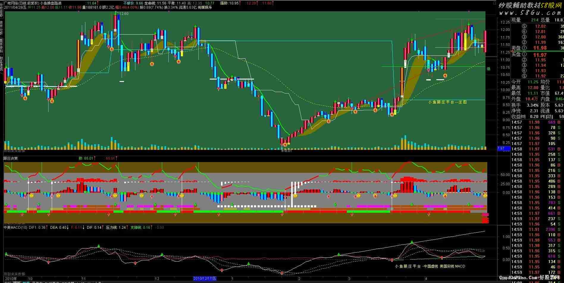 {小鱼中美MACD-有画线未来涵数 } DIF1:EMA(CLOSE,12)-EMA(CLOSE,26)COLORLIGRAY,DOTLINE; DEA:EMA(DIF1,9)COLORYELLOW,DOTLINE; VAR1:=(HHV(EMA(EMA(C,5)-EMA(C,13),1),3)+ABS(LLV(EMA(EMA(C,5)-EMA(C,13),1),3)))/2; F:VAR1/4*4,COLORRED; DIF:EMA(EMA(C,5)-EMA(C,13),1),COLORWHITE; AA1:=REF(DIF,P)=HHV(DIF,2*P+1); BB1:=FILTER(AA1,P); CC1:=BACKSET(BB1,P+1); DD1:=FILTER(CC1,P);{高点} AA2:=REF(DIF,P)=LLV(DIF,2*P+1); BB2:=FILTER(AA2,P); CC2:=BACKSET(BB2,P+1); DD2:=FILTER(CC2,P);{低点} 上:=REF(DIF,BARSLAST(DD1)),COLORFF00FF,NODRAW; 下:=REF(DIF,BARSLAST(DD2)),COLOR00FF00,NODRAW; 相对能量:=(DIF-下)/(上-下)*100,COLORYELLOW,NODRAW; R11:=BACKSET(ISLASTBAR,BARSLAST(DD1)+1); S11:=R11>REF(R11,1); 压力线:DRAWLINE(DD1,DIF,S11,DIF,1),COLORYELLOW; T11:=BACKSET(ISLASTBAR,BARSLAST(DD2)+1); U11:=T11>REF(T11,1); 支撑线:DRAWLINE(DD2,DIF,U11,DIF,1),COLOR00FF00; 0,DOTLINE,COLOR555555; DRAWICON(DD1,DIF,2); DRAWICON(DD2,DIF,1); DRAWTEXT(CURRBARSCOUNT=28,-0.2,'小 鱼 跟 庄 平 台 -中国虚线 美国实线 MACD '),COLORYELLOW;