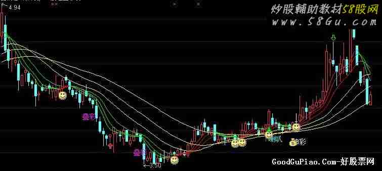 A:=(3*CLOSE+LOW+OPEN+HIGH)/6; HJX21:=(21*A+20*REF(A,1)+19*REF(A,2)+18*REF(A,3)+17*REF(A,4)+16*REF(A,5)+ 15*REF(A,6)+14*REF(A,7)+13*REF(A,8)+12*REF(A,9)+11*REF(A,10)+ 10*REF(A,11)+9*REF(A,12)+8*REF(A,13)+7*REF(A,14)+6*REF(A,15)+ 5*REF(A,16)+4*REF(A,17)+3*REF(A,18)+2*REF(A,19)+ REF(A,21))/231; HJX3:=(3*A+2*REF(A,1)+REF(A,2))/6; DC1:EMA(HJX3,4),COLORLIMAGENTA; DC2:EMA(DC1,3),COLORRED; DC3:EMA(DC1,7),COLORRED; K1:=BACKSET(DC1<REF(DC1,1),2); IF(K1,DC1,DRAWNULL),COLORGREEN,LINETHICK1; K2:=BACKSET(DC2<REF(DC2,1),2); IF(K2,DC2,DRAWNULL),COLORGREEN,LINETHICK1; K3:=BACKSET(DC3<REF(DC3,1),2); IF(K3,DC3,DRAWNULL),COLORGREEN,LINETHICK1; DC4:EMA(HJX21,6),COLORYELLOW; DC5:EMA(HJX21,16),COLORYELLOW; DC6:EMA(HJX21,34),COLORYELLOW; RSV:=(CLOSE-LLV(LOW,6))/(HHV(HIGH,6)-LLV(LOW,6))*100; K:=SMA(RSV,3,1); D:=SMA(K,3,1); J:=3*K-2*D; YX2:=D>REF(D,1); YX3:=DC4>DC6 AND DC5>DC6; YX4:=CLOSE>DC4 AND CLOSE/DC4<1.1; YX5:=DC1>DC2 AND DC2>DC3; XG:=YX2 AND YX3 AND YX4; 神彩飞扬培训:=XG AND COUNT(XG,10)=1 AND COUNT(YX5,10)<5; DRAWTEXT(神彩飞扬培训,LOW*0.98,'神彩'),COLORFFFFFF; DIFF:=EMA(CLOSE,12) - EMA(CLOSE,26); DEA:=EMA(DIFF,9); MACD:=2*(DIFF-DEA); XG0:=CROSS(MACD,0); XG1:=CROSS(CLOSE,DC1) AND CROSS(CLOSE,DC2) AND CROSS(CLOSE,DC3) AND BARSLAST(XG0)<=5 AND CLOSE<DC4 ; DRAWTEXT(XG1,LOW*0.98,'叠彩'),COLORFF00FF; HJX:=EMA(HJX21,12); Z,:=100*(CLOSE-REF(CLOSE,1))/REF(CLOSE,1); TTUP:=HJX+2*STD(CLOSE,20); TTDOWN:=HJX-2*STD(CLOSE,20); HUP:=EMA(TTUP,3); HDOWN:=EMA(TTDOWN,3); LBRISE:=HUP/REF(HUP,1)>1.0035; MIDRISE:=HJX>REF(HJX,1); LBDOWN:=HDOWN<REF(HDOWN,1); CLB1:=LOW/HUP<1.01 AND CLOSE/HUP>0.99 AND (OPEN+LOW)/2.1<HUP ; KXT:=CLOSE>OPEN AND ((HIGH-CLOSE)+(OPEN-LOW))/(CLOSE-OPEN)<1.2 AND HIGH/CLOSE<1.035; TDKD:=100*(HUP-HDOWN)/HJX; TDXT:=TDKD<15 AND LLV(TDKD,8)<10; XGG:=LBRISE AND MIDRISE AND CLB1 AND KXT AND TDXT; CXG:=COUNT(XGG,20); 喇叭开口:=XGG AND CXG=1 AND COUNT(LBRISE,10)<10 AND HIGH/HHV(HIGH,5)>0.98; DRAWTEXT(喇叭开口,LOW*0.99,'喇叭'),COLORFFFF00; DRAWICON(CROSS(DC1,DC2),LOW*0.99,5); DRAWICON(神彩飞扬培训,LOW*0.970,9); DRAWICON(喇叭开口,LOW,2),COLORFFFF00;