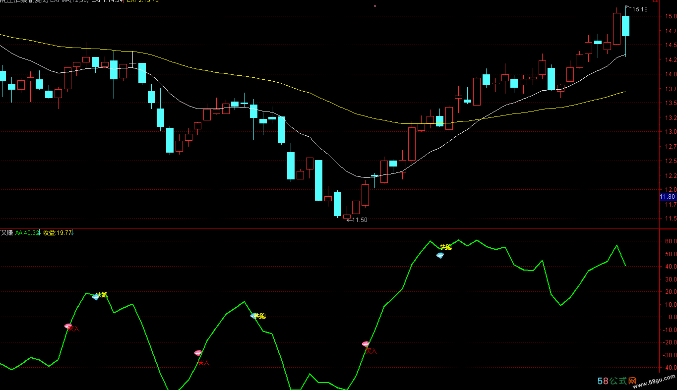 Z,:=(C-REF(C,1))/REF(C,1)*100; AA:EMA(EMA((C-REF(C,1)),6),6)*100/EMA(EMA(ABS((C-REF(C,1))),6),6)COLORGREEN,LINETHICK2; DD:=LLV(AA,BARSLAST(AA<REF(AA,1))+1); ZT:=BARSLAST(CROSS(AA,DD*0.66) AND AA<0 AND DD<-20); 收益:SUM(Z,,IF(ZT=0,1,ZT)),COLORRED,LINETHICK0; MR:=CROSS(AA,DD*0.66) AND AA<0 AND DD<-20; DRAWICON(MR,AA*0.8,25); MC:=CROSS(DD,0) AND DD=AA; DRAWICON(MC,AA*0.9,24); DRAWTEXT(MC,AA*1.02,'快跑')COLORYELLOW; DRAWTEXT(MR,AA,'买入')COLORRED;