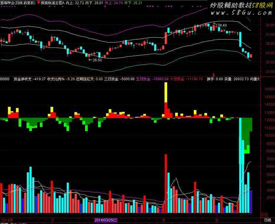 {资金流量}{成交量+主力动向副图} PJJ:=DMA((((HIGH + LOW) + (CLOSE * 2)) / 4),0.9); JJ:=REF(EMA(PJJ,3),1);QJJ:=(VOL / (((HIGH - LOW) * 2) - ABS((CLOSE - OPEN)))); XVL:=(IF((CLOSE > OPEN),(QJJ * (HIGH - LOW)),IF((CLOSE < OPEN), (QJJ * ((HIGH - OPEN) + (CLOSE - LOW))),(VOL / 2))) + IF((CLOSE > OPEN), (0 - (QJJ * ((HIGH - CLOSE) + (OPEN - LOW)))),IF((CLOSE < OPEN), (0 - (QJJ * (HIGH - LOW))),(0 - (VOL / 2))))); ZLL:=(VOL / CAPITAL); HSL1:=IF((ZLL > 10),10,ZLL);HSL:=((XVL / 20) / 1.15); 进攻流量:=(((HSL * 0.55) + (REF(HSL,1) * 0.33)) + (REF(HSL,2) * 0.22)); GJJ:=EMA(进攻流量,8); LLJX:=EMA(进攻流量,3); 动态天量:=CONST(IF(V=HHV(V,20),V,REF(V,BARSLAST(V=HHV(V,20))))),COLOR00FF00,POINTDOT; STICKLINE(((HSL * 0.4) >= 0),动态天量+((HSL * 0.4) +LLJX)*20,动态天量,3,0),COLORYELLOW; STICKLINE(((HSL * 0.4) < 0),动态天量+((HSL * 0.4) +LLJX)*20,动态天量,3,0),COLOR00FF00; 资金流入:=IF((HSL*0.4+LLJX)>0,(HSL*0.4+LLJX),DRAWNULL),COLORRED; 资金流出:=IF((HSL*0.4+LLJX)<0,(HSL*0.4+LLJX),DRAWNULL),COLOR00FF00; 资金收支:=(HSL*0.4+LLJX),LINETHICK0;万元:=AMOUNT/10000{0000},VOLSTICK,COLORFF00FF; 资金净收支:IF((HSL*0.4+LLJX)>0,资金流入,资金流出),COLORWHITE,POINTDOT; 收支比例%:IF((HSL*0.4+LLJX)>0,资金流入/万元*100,资金流出/万元*100),COLORYELLOW; 连红天1:=BARSLASTCOUNT(资金净收支>0),,COLORA20FFD,NODRAW; 连红天2:=IF(连红天1=0,REF(连红天1,1),连红天1),,COLORA20FFD,NODRAW; 连红天3:=IF(连红天2=0,REF(连红天1,2),连红天2),,COLORA20FFD,NODRAW; 连红天4:=IF(连红天3=0,REF(连红天1,3),连红天3),,COLORA20FFD,NODRAW; 近期连红天:IF(连红天4=0,REF(连红天1,4),连红天4),,COLORYELLOW,NODRAW; 三日资金:SUM(资金收支,3),COLORWHITE,NODRAW; 五日资金:SUM(资金收支,5),COLORFF00FF,NODRAW; 十日资金:SUM(资金收支,10),COLOR0000FF,NODRAW; 资金流量:=LLJX,LINETHICK0,COLOR0000FF; STICKLINE((资金流量 > 0),动态天量+资金流量*20,动态天量,3,0),COLOR0000FF; STICKLINE((资金流量 < 0),动态天量+资金流量*20,动态天量,3,0),COLOR008000; 换手: VOL*10000/FINANCE(7),COLORWHITE; {DYNAINFO(37)*100} 换10T:=SUM(换手,10),COLORWHITE;实量:VOL,VOLSTICK; 均量5:MA(VOL,5); 均量10:MA(VOL,13); 均量34:MA(VOL,34); V1:=V/CAPITAL*100; MAV5:=EMA(V/CAPITAL*100,5); MAV10:=EMA(V/CAPITAL*100,10); 量能:((V1-MAV5)/MAV5*2+(V1-MAV10)/MAV10)*10; 量坑:(量能<=-10)*-10,COLORBLUE; STICKLINE(量坑<0,0,VOL,1,0),COLORBLUE; SZ:=C>0 AND C>REF(C,1); 放量上涨:((CROSS(量能,10) OR (量能-REF(量能,1))>=10) AND SZ)*10,COLORRED; STICKLINE(放量上涨,0,VOL,2,0),COLORRED; |