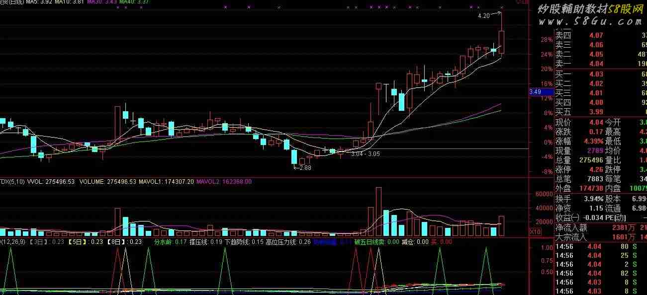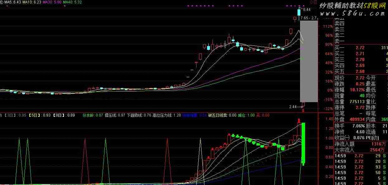 AMV:=SMA(V,10,1)/300000; K3:=AMV*H/10,LINETHICK0; K4:=AMV*L/10,LINETHICK0; K2:=AMV*C/10,LINETHICK0; K1:=REF(K2,1),LINETHICK0; K5:MA(K2,3),COLORGRAY; K6:MA(K2,5),COLORYELLOW; K7:MA(K2,8),COLORWHITE; STICKLINE(K2>K1,K2,K1,3,1),COLORRED; STICKLINE(K2<K1,K3,K4,3,0),COLORGREEN; 破五日线卖: CROSS((MA(K2,5)/MA(K2,10))*K2*0.98,K2), COLORGREEN; 减仓: CROSS(MA(K2,5),K2),COLORYELLOW; 买:CROSS(K2*1.045,MA(K2,25)*0.62) OR CROSS(K2*1.045,MA(K2,24)),COLORRED;