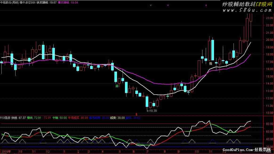 快支撑线:(MA(CLOSE,3)+MA(CLOSE,6)+MA(CLOSE,12)+MA(CLOSE,24))/4,COLORWHITE,LINETHICK2; 慢支撑线:(EMA(C,6)+EMA(C,18)+EMA(C,54)+EMA(C,162))/4,COLORFF00FF,LINETHICK2; DRAWTEXT(CROSS(快支撑线,慢支撑线),L-0.13,'强'),COLORYELLOW; DRAWTEXT(CROSS(慢支撑线,快支撑线),L-0.13,'弱'),COLORGREEN;