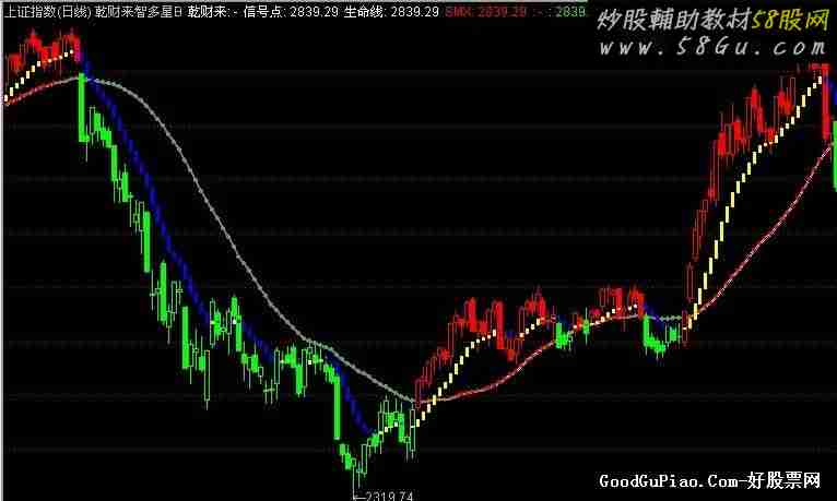 VAR1:=1090630; 乾财来:DRAWNULL,NODRAW; 信号点:IF(DATE<=VAR1,SAR(4,2,20),MA(CLOSE,30)),NODRAW,COLORWHITE; 生命线:MA(CLOSE,30),COLORWHITE,LINETHICK2; SMX:MA(CLOSE,30),COLORRED; A:=信号点,NODRAW; B:=(MA(CLOSE,30)-REF(MA(CLOSE,30),1))*100/REF(MA(CLOSE,30),1); {以下是在K线图上画SAR指标线} IF(CLOSE>=A,A,DRAWNULL),POINTDOT,COLORRED,LINETHICK4; IF(CLOSE<A,A,DRAWNULL),POINTDOT,COLORGREEN,LINETHICK4; IF(MA(B,3)<0.1,MA(CLOSE,30),DRAWNULL),COLORGRAY,LINETHICK2; {划彩色K线} STICKLINE(C>=A AND C>=O,C,O,2.8,1),COLORRED; STICKLINE(C>=A AND C<O,C-0.003*C,O,2.8,0),COLORRED; STICKLINE(C>=A ,H,C,0,0),COLORRED; STICKLINE(C>=A ,O,L-0.003*C,0,0),COLORRED; STICKLINE((C<A AND C>=O),C,O,2.8,1),COLORGREEN; STICKLINE((C<A AND C<O),C-0.003*C,O,2.8,0),COLORGREEN; STICKLINE(C<A ,H,C,0,0),COLORGREEN; STICKLINE(C<A ,O,L-0.003*C,0,0),COLORGREEN; JJ:=(CLOSE+HIGH+LOW)/3; A8:=EMA(JJ,10); B8:=REF(A8,1); 持股区域:STICKLINE(A8>B8,A8,B8,2,0),COLORYELLOW; 持币区域:STICKLINE(A8<B8,A8,B8,2,0),COLORBLUE;