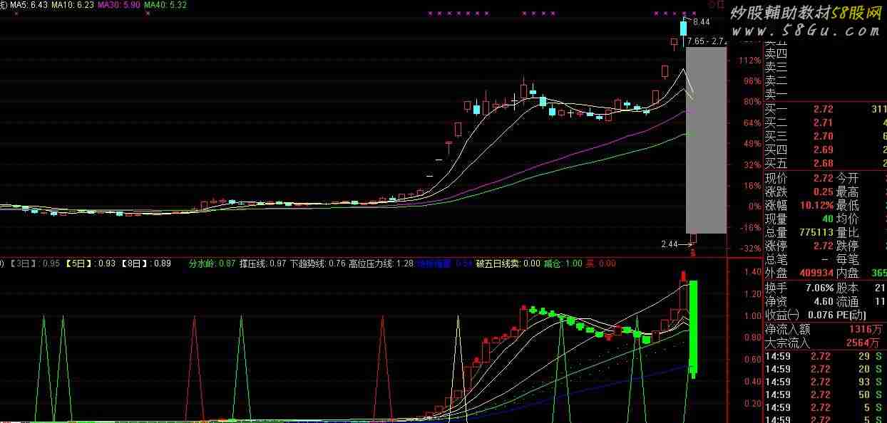 红买,黄减仓,绿清仓AMV:=SMA(V,10,1)/300000; 【最高】:=AMV*H/10,LINETHICK0; 【最低】:=AMV*L/10,LINETHICK0; 【收盘】:=AMV*C/10,LINETHICK0; 【开盘】:=REF(【收盘】,1),LINETHICK0; 【3日】:MA(【收盘】,3),COLORGRAY; 【5日】:MA(【收盘】,5),COLORYELLOW; 【8日】:MA(【收盘】,8),COLORWHITE; STICKLINE(【收盘】>【开盘】,【最高】,【最低】,1,0),COLORRED; STICKLINE(【收盘】>【开盘】,【收盘】,【开盘】,3,1),COLORRED; STICKLINE(【收盘】<【开盘】,【收盘】,【开盘】,3,0),COLORGREEN; STICKLINE(【收盘】<【开盘】,【最高】,【最低】,1,0),COLORGREEN; 分水岭:MA(【收盘】,20); 撑压线:分水岭*1.12,POINTDOT; 下趋势线:分水岭*0.88,POINTDOT; 高位压力线:分水岭*1.28; 地位缩量:分水岭*0.72;
