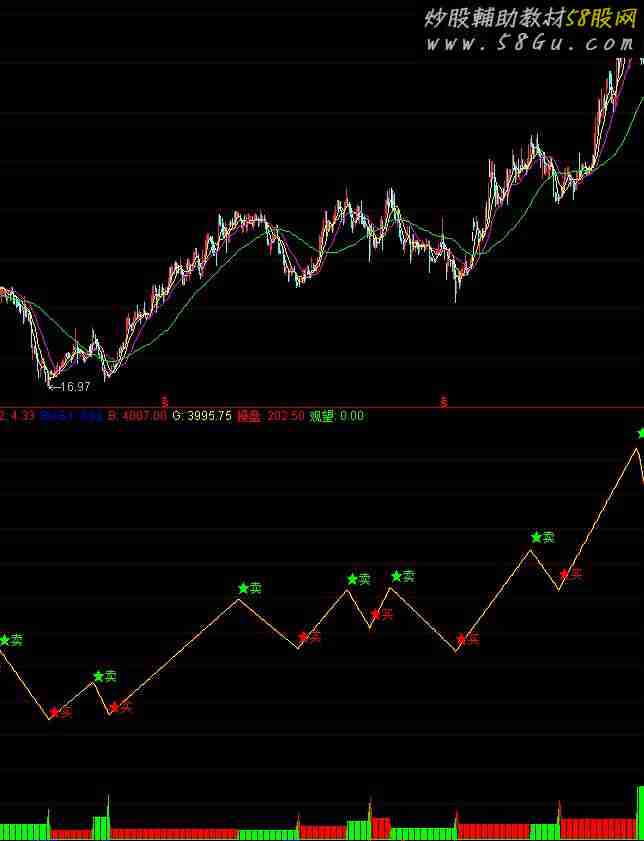 {BIAS18} N1:=6; N2:=18; N3:=36; BIAS1 :(CLOSE-MA(CLOSE,N1))/MA(CLOSE,N1)*100; BIAS2 :(CLOSE-MA(CLOSE,N2))/MA(CLOSE,N2)*100,COLORRED,LINETHICK2; BIAS3 :(CLOSE-MA(CLOSE,N3))/MA(CLOSE,N3)*100,COLORBLUE; VAR1:=SUM(MAX(MAX(HIGH-LOW,ABS(HIGH-REF(CLOSE,1))),ABS(LOW-REF(CLOSE,1))),25); VAR2:=HIGH-REF(HIGH,1); VAR3:=REF(LOW,1)-LOW; VAR4:=SUM(IF(VAR2>0 AND VAR2>VAR3,VAR2,0),25); VAR5:=SUM(IF(VAR3>0 AND VAR3>VAR2,VAR3,0),25); VAR6:=VAR4*100/VAR1; VAR7:=VAR5*100/VAR1; VAR8:=MA(ABS(VAR7-VAR6)/(VAR7+VAR6)*100,15); VAR9:=(VAR8+REF(VAR8,15))/2; A:=(VAR7>VAR6 AND VAR7>25 AND VAR6<25); B:ZIG(3,50/5)*100,COLORRED; G:MA(B,2),COLORYELLOW; D:=CROSS(B,G)*1000,COLORRED; W:=CROSS(G,B)*1000,COLORBLUE; 操盘:IF(B>G,(B-G)*18,0),LINESTICK,COLORRED; 观望:IF(B<G,(G-B)*18,0),LINESTICK,COLORGREEN; E:=REF(INDEXC,1); F:=SMA(MAX(INDEXC-E,0),3,1)/SMA(ABS(INDEXC-E),3,1); VAR10:=F AND F<8; VAR11:=(CLOSE-LLV(LOW,9))/(HHV(HIGH,9)-LLV(LOW,9))*100; VAR12:=SMA(VAR11,3,1); VAR13:=SMA(VAR12,3,1); VAR14:=VAR13 AND VAR13<20; MM:=A AND D AND VAR10 AND VAR14 ; DRAWTEXT(W=1000,B*1.05,'★卖' ),COLOR00FF00; DRAWTEXT(D=1000,B*1.05,'★买'),COLORRED; |