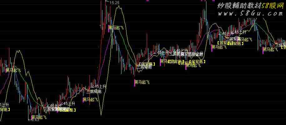 MA34:MA(C,34),NODRAW; MA4:MA(CLOSE,M4),COLORBLUE,LINETHICK4,COLORGREEN,NODRAW;M34:MA(CLOSE,34),COLORRED,LINETHICK2,NODRAW; X:=BARSLAST(REF(CROSS(C,MA(C,120)),1)) AND CROSS(MA(C,20),MA(C,120)); DRAWTEXT(X,MA(C,120)-0.10,'【【牛股】】'),LINETHICK3,COLORWHITE;A:=BARSCOUNT(C); 抽:=HHV(H,200); 插:=LLV(L,200); 高潮:=(抽-插)/43; B1:=L-高潮; STICKLINE((A+0)/23=FLOOR((A+0)/22),B1,B1-2.5*高潮,3,0),COLORF00FF0; DRAWTEXT((A+0)/23=FLOOR((A+0)/22),B1-1*高潮,'黑马起飞'),COLORWHITE,COLORYELLOW;{顶底背离}LC:=REF(CLOSE,1); RSI:=((SMA(MAX((CLOSE - LC),0),3,1) / SMA(ABS((CLOSE - LC)),3,1)) * 100); FF:=EMA(CLOSE,3); MA15:=EMA(CLOSE,21); DRAWTEXT(CROSS(FF,MA15),(L* 0.98),'【底背离】'),COLORYELLOW; {DRAWICON(CROSS(FF,MA15),(LOW * 0.99),7); }; SAT:=IF((AMOUNT/C)/(HHV(AMOUNT,20)/HHV(C,20))*100>100,100,(AMOUNT/C)/(HHV(AMOUNT,20)/HHV(C,20))*100); X1:=(C+L+H)/3;BB13:=ATAN(EMA(X1,13)-REF(EMA(X1,13),1))*3.1416*10; EMA8:=EMA(C,8);DRAWTEXT(FILTER(BB13>1 AND EMA(X1,13)>REF(EMA(X1,8),1),10), EMA8,'∠45上升'),COLORWHITE; V5:=MA(VOL,5),NODRAW; V10:=MA(VOL,10),NODRAW; V20:=MA(VOL,20),NODRAW; B:=MA(CLOSE,17)+MA(CLOSE,17)-REF(MA(CLOSE,17),1); 分水岭:IF(MA(CLOSE,17)<B,B,MA(CLOSE,17)),COLORFF00FF,LINETHICK1; PMA:=分水岭,NODRAW; DD:=分水岭<REF(分水岭,1); IF(DD,分水岭,DRAWNULL),COLOR00FF00,LINETHICK1; 操作线:分水岭-(EMA(C,3)-分水岭),COLOR00FFFF,LINETHICK1; S:=(PMA>操作线); IF(S,分水岭,DRAWNULL),COLOR00FF00,POINTDOT,LINETHICK1; PM:MA(C,5),COLORFFFFCC,LINETHICK1,NODRAW,NODRAW; IF(PM>REF(PM,1),PM,DRAWNULL),COLORRED,LINETHICK1; IF(PM=REF(PM,1),PM,DRAWNULL),COLORRED; IF(PM<REF(PM,1),PM,DRAWNULL),COLORFF9900,LINETHICK1; DRAWTEXT(CROSS(分水岭,操作线),分水岭-0.1,'三底背离'); A1:=BARSLAST(REF(CROSS("MACD.DIF","MACD.DEA"),1));