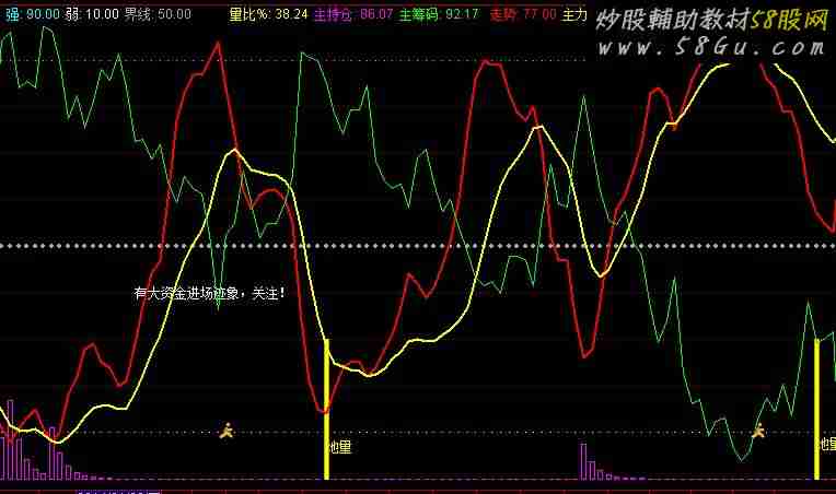 强: 90,COLORCYAN,LINETHICK3,POINTDOT; 弱:10,LINETHICK3,POINTDOT; 界线:50,COLORA8A8A8,POINTDOT,LINETHICK4; VAR2:=REF(LOW,1); VAR3:=SMA(ABS(LOW-VAR2),3,1)/SMA(MAX(LOW-VAR2,0),3,1)*100; VAR4:=EMA(IF(CLOSE*1.3,VAR3*10,VAR3/10),3); VAR5:=LLV(LOW,30); VAR6:=HHV(VAR4,30); VAR7:=IF(MA(CLOSE,58),1,0); VAR8:=EMA(IF(LOW<=VAR5,(VAR4+VAR6*2)/2,0),3)/618*VAR7; VAR9:=IF(VAR8>100,100,VAR8); 吸筹:STICKLINE(VAR9>-120,0,VAR9,2,5),COLORMAGENTA; 地量:DRAWTEXT(CROSS(0.9,1/VOL*1000>0.01 AND "KDJ.J"<0),L*1,'地量'),COLOR00FFFF; STICKLINE(地量>0,0,30,2,0),COLOR008888; STICKLINE(地量>0,0,30,1.5,0),COLOR00AAAA; STICKLINE(地量>0,0,30,0.8,0),COLOR00DDDD; STICKLINE(地量>0,0,30,0.3,0),COLOR00FFFF; AA:=VOL/((HIGH-LOW)*2-ABS(CLOSE-OPEN)); 主买:=IF(CLOSE>OPEN,AA*(HIGH-LOW),IF(CLOSE<OPEN,AA*((HIGH-OPEN)+(CLOSE-LOW)),VOL /2)); 量比%:主买/VOL*100,LINETHICK4,LINETHICK0; 主持仓:EMA(100*(CLOSE-LLV(LOW,34))/(HHV(HIGH,34)-LLV(LOW,34)),3),LINETHICK0; 主筹码:WINNER(C)*100,LINETHICK0; VAR10:=100-3*SMA((CLOSE-LLV(LOW,75))/(HHV(HIGH,75)-LLV(LOW,75))*100,20,1)+2*SMA(SMA((CLOSE-LLV(LOW,75))/(HHV(HIGH,75)-LLV(LOW,75))*100,20,1),15,1); VAR11:=100-3*SMA((OPEN-LLV(LOW,75))/(HHV(HIGH,75)-LLV(LOW,75))*100,20,1)+2*SMA(SMA((OPEN-LLV(LOW,75))/(HHV(HIGH,75)-LLV(LOW,75))*100,20,1),15,1); VAR12:=VAR10<REF(VAR11,1) AND VOL>REF(VOL,1) AND CLOSE>REF(CLOSE,1); DRAWTEXT(VAR12 AND COUNT(VAR12,30)=1,40,'有大资金进场迹象,关注!'); AA4:=(CLOSE-LLV(LOW,21))/(HHV(HIGH,21)-LLV(LOW,21))*100; AA5:=SMA(AA4,13,8); 走势:CEILING(SMA(AA5,13,8)),COLORRED,LINETHICK2; RSV:=(CLOSE-LLV(LOW,30))/(HHV(HIGH,30)-LLV(LOW,30))*100; K:=SMA(RSV,5,1); D:=SMA(K,3,1); J:=3*K-2*D; 主力线:EMA(J,6),COLORYELLOW,LINETHICK2; 散户线: 100*(HHV(HIGH,60)-CLOSE)/(HHV(HIGH,60)-LLV(LOW,60)),COLORGREEN; VARR1:=SMA(MAX(CLOSE-REF(C,1),0),6,1)/SMA(ABS(CLOSE-REF(C,1)),6,1)*100; DRAWICON(CROSS(82,VARR1),10,15); |