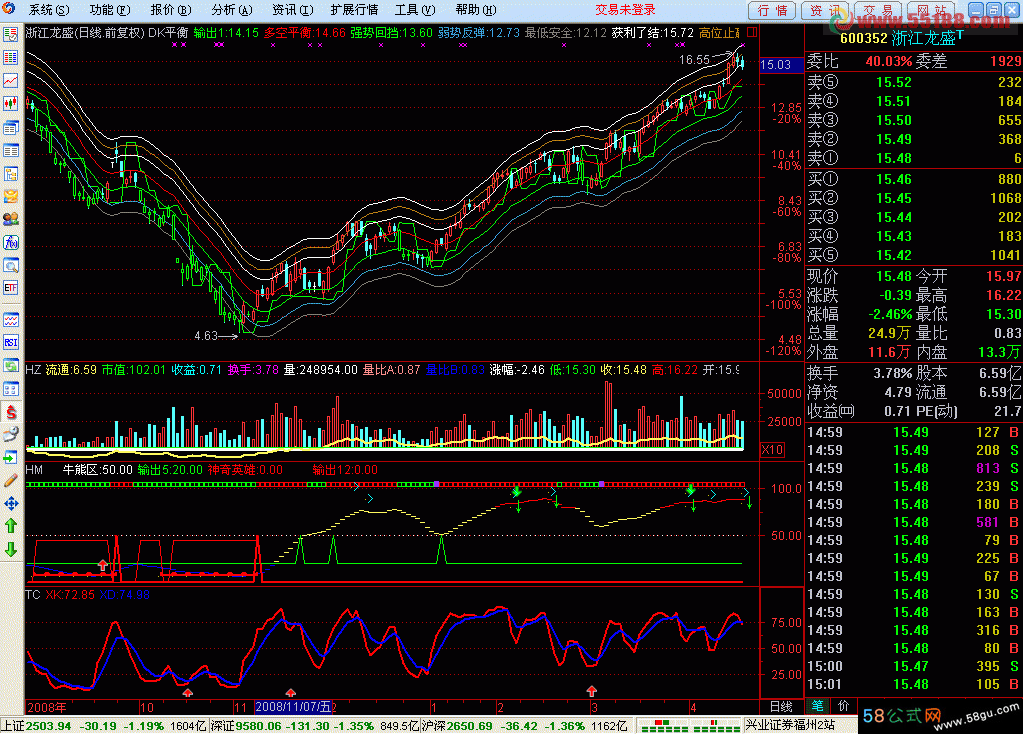 波段买卖用参考指标,不吹牛,普通但有参考价值 N1:=5;N2:=13;RSV:=(CLOSE-LLV(LOW,N1))/(HHV(HIGH,N1)-LLV(LOW,N1))*100;xK:SMA(RSV,3,1),COLORRED,LINETHICK2;xD:SMA(xK,3,1),COLORFF0000,LINETHICK2;RSV1:=(CLOSE-LLV(LOW,N2))/(HHV(HIGH,N2)-LLV(LOW,N2))*100;yK:=SMA(RSV1,5,1);yD:=SMA(yK,10,1);y3:= 3*SMA((CLOSE-LLV(LOW,10))/(HHV(HIGH,10)-LLV(LOW,10))*100,5,1)-2*SMA(SMA((CLOSE-LLV(LOW,10))/(HHV(HIGH,10)-LLV(LOW,10))*100,5,1),3,1);xx:= IF(CROSS(y3,10),45,0);Drawicon(xx,l,1);AA1:=AMOUNT/VOL;BB1:=L<AA1*0.9;CC1:=(C-REF(C,1))/REF(C,1)*100>1.2;DD1:=L<MA(C,6)*0.921;EE1:=VOL<MA(V,5)*1.5;FF1:=BB1 AND CC1 AND DD1 AND EE1;Drawicon(FF1,l,1); |