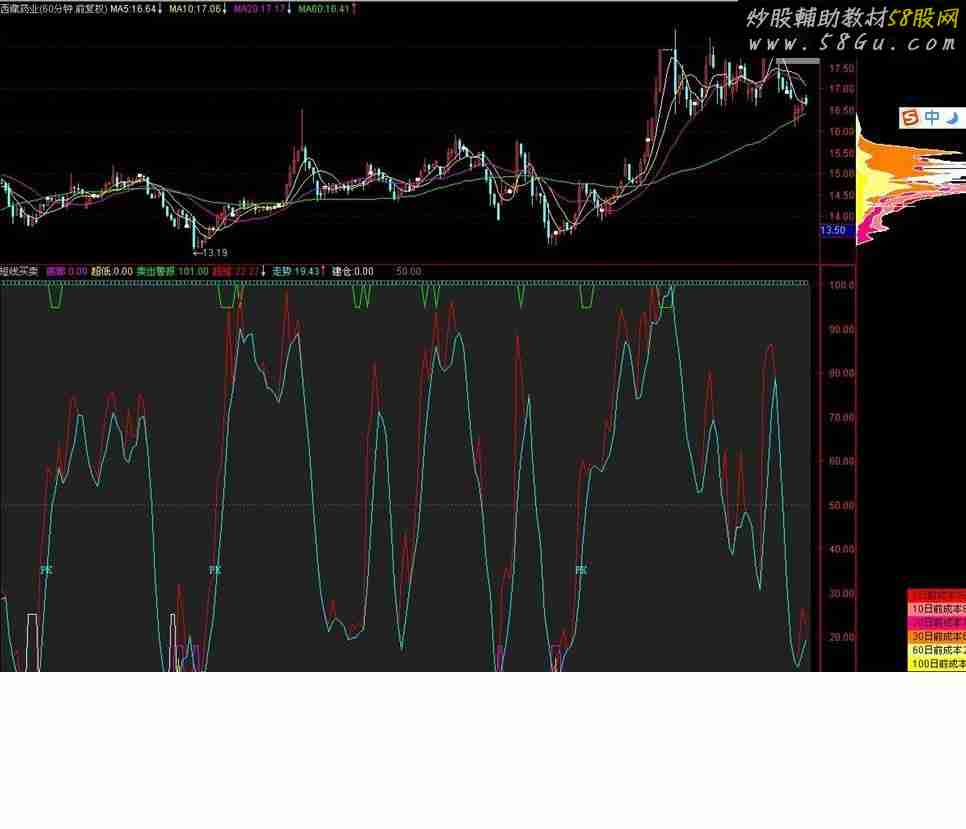 STICKLINE(1,100,0,10,0),COLOR222222; N:=3; VAR01:=MA(HHV(HIGH,485),17); VAR02:=MA(HHV(HIGH,222),17); VAR03:=MA(HHV(HIGH,96),17); VAR04:=MA(LLV(LOW,485),17); VAR05:=MA(LLV(LOW,222),17); VAR06:=MA(LLV(LOW,96),17); VAR07:=MA((VAR04*0.96+VAR05*0.96+VAR06*0.96+VAR01*0.558+VAR02*0.558+VAR03*0.558)/6,17); VAR08:=MA((VAR04*1.25+VAR05*1.23+VAR06*1.2+VAR01*0.55+VAR02*0.55+VAR03*0.65)/6,17); VAR09:=MA((VAR04*1.3+VAR05*1.3+VAR06*1.3+VAR01*0.68+VAR02*0.68+VAR03*0.68)/6,17); VAR10:=MA((VAR07*3+VAR08*2+VAR09)/6*1.738,17); VAR11:=IF(DATE<=1050531,VAR10,VAR10*DAY); VAR12:=LOW; VAR13:=REF(LOW,1); VAR14:=SMA(ABS(VAR12-VAR13),3,1)/SMA(MAX(VAR12-VAR13,0),N,1)*100; VAR15:=MA(IF(CLOSE*1.35<=VAR11,VAR14*10,VAR14/10),N); VAR16:=LLV(LOW,30); VAR17:=HHV(VAR15,30); VAR18:=1990831; VAR19:=IF(DATE<=VAR18,MA(IF(LOW<=VAR16,(VAR15+VAR17*2)/2,0),N),100000000); VAR20:=(HHV(H,9.8)-C)/(HHV(H,9.8)-LLV(L,9.8))*100; VAR21:=SMA(VAR20,3,1); VAR22:=SMA(VAR21,3,1); VAR23:=3*VAR21-2*VAR22; VAR24:=IF(VAR23>=100,100,IF(VAR23<=0,0,VAR23)); VAR25:=(CLOSE-MA(CLOSE,60))/MA(CLOSE,60)*100; VAR26:=100+(-ABS(VAR25)); VAR27:=(CLOSE-LLV(LOW,21))/(HHV(HIGH,21)-LLV(LOW,21))*100; VAR28:=SMA(SMA(VAR27,9,4),9,4)/7.77777; VAR29:=EMA(VAR28,5); VAR30:=3*VAR28-2*VAR29; VAR31:=CROSS(VAR30,VAR28) AND VAR28<2.7 AND C>O; VAR32:=(CLOSE-LLV(LOW,17))/(HHV(HIGH,17)-LLV(LOW,17))*100; VAR33:=(CLOSE-LLV(LOW,50))/(HHV(HIGH,50)-LLV(LOW,50))*100; VAR34:=SMA(SMA(VAR32,3,1),3,1)+3*STD(CLOSE,10); VAR35:=SMA(VAR33,3,1); VAR36:=100-((100*((HHV(HIGH,17))-CLOSE))/((HHV(HIGH,17))-(LLV(LOW,17)))); VAR37:=100-(MA(((100*((HHV(HIGH,17))-CLOSE))/((HHV(HIGH,17))-(LLV(LOW,17)))),4)); VAR38:=MA(VAR37,1); VAR39:=3*SMA((CLOSE-LLV(LOW,27))/(HHV(HIGH,27)-LLV(LOW,27))*100,5,1)-2*SMA(SMA ((CLOSE-LLV(LOW,27))/(HHV(HIGH,27)-LLV(LOW,27))*100,5,1),3,1); 底部:IF(VAR19>10000 AND VAR19>20000,2,0)*9,COLORMAGENTA; 超低:IF(VAR19>30000 AND VAR19>30000,3,0)*5,COLORYELLOW; 卖出警报:IF((VAR24=0),95,101),COLORGREEN; 超短:IF((VAR36<VAR38),VAR38,VAR36),COLORRED; 走势:(VAR38),COLORCYAN; 建仓:IF(VAR39<5,25,0),COLORWHITE; DRAWTEXT(CROSS(VAR34,VAR35) AND VAR35<18 AND VAR35>REF(VAR35,1)OR CROSS(VAR35,5),40,'千载难逢'),COLORMAGENTA; DRAWTEXT(VAR31,35,'PK'),COLORCYAN;STICKLINE(1,100,101,4,1),COLOR788721; STICKLINE(1,0,-1,4,1),COLOR788721; 50,COLORGRAY,POINTDOT; |