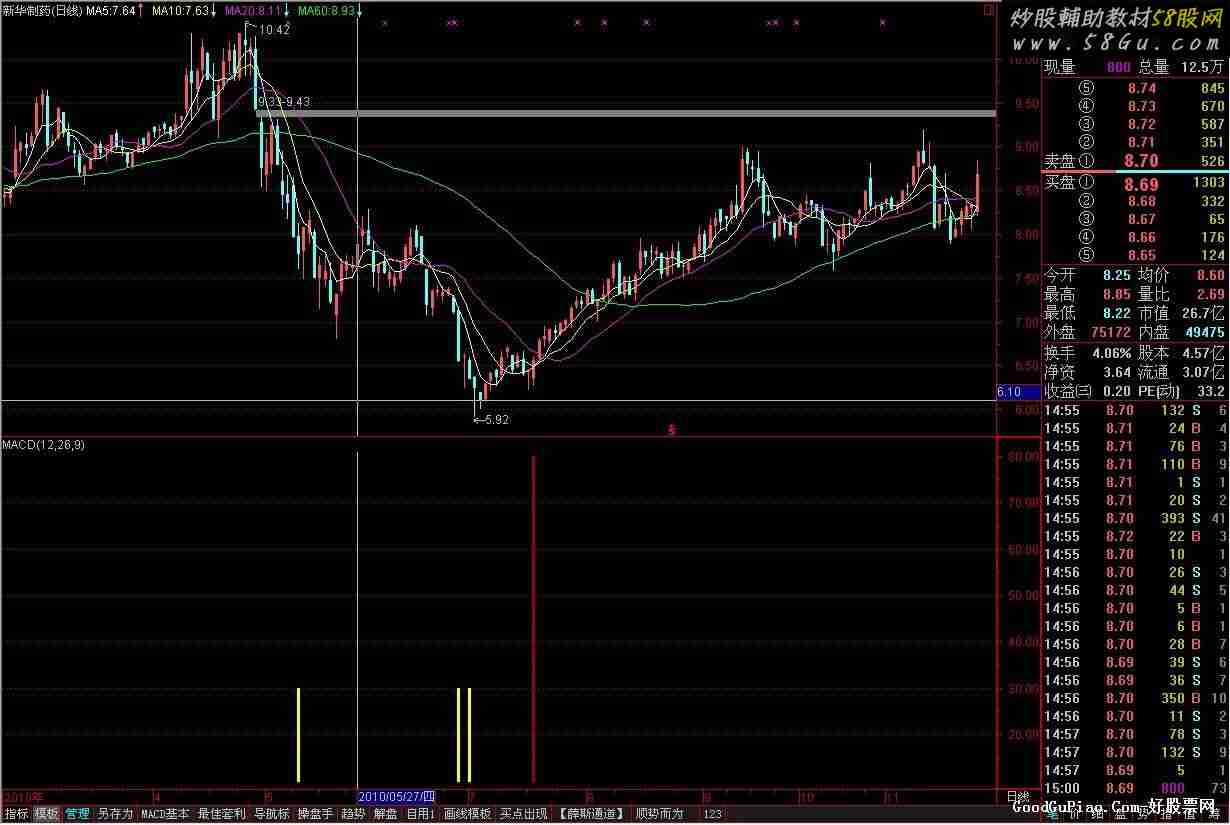 Q_1:=C-REF(C,1); Q_2:=100*EMA(EMA(Q_1,6),6)/EMA(EMA(ABS(Q_1),6),6); Q_3:=CROSS(EMA(C,19),EMA(C,7)); Q_4:=CROSS(EMA(C,7),EMA(C,19)); Z1:=L=LLV(L,BARSLAST(Q_3)+1); Z2:=LLV(L,BARSLAST(Q_3)+1); Z3:=H=HHV(H,BARSLAST(Q_4)+1); Z4:=HHV(H,BARSLAST(Q_4)+1); Q_A:=DRAWLINE(Z1,Z2,Z3,Z4,0); Y1:=H=HHV(H,BARSLAST(Q_4)+1); Y2:=HHV(H,BARSLAST(Q_4)+1); Y3:=L=LLV(L,BARSLAST(Q_3)+1); Y4:=LLV(L,BARSLAST(Q_3)+1); Q_B:=DRAWLINE(Y1,Y2,Y3,Y4,0); X1:=LLV(Q_2,2)=LLV(Q_2,7) ; X2:=COUNT(Q_2<0,2); X3:=CROSS(Q_2,MA(Q_2,2)); X4:=REF(Q_B,1)<REF(Q_B,2); X5:=Q_A>REF(Q_B,1); 买进:=(X1 AND X2 AND X3) AND X4 AND X5; TJ:=IF(Q_B<REF(Q_B,1) AND Q_B=Q_A,1,0); XXG:REF(TJ,1)=0 AND TJ>=1; XG:=Q_B<REF(Q_B,1) AND Q_B=Q_A;