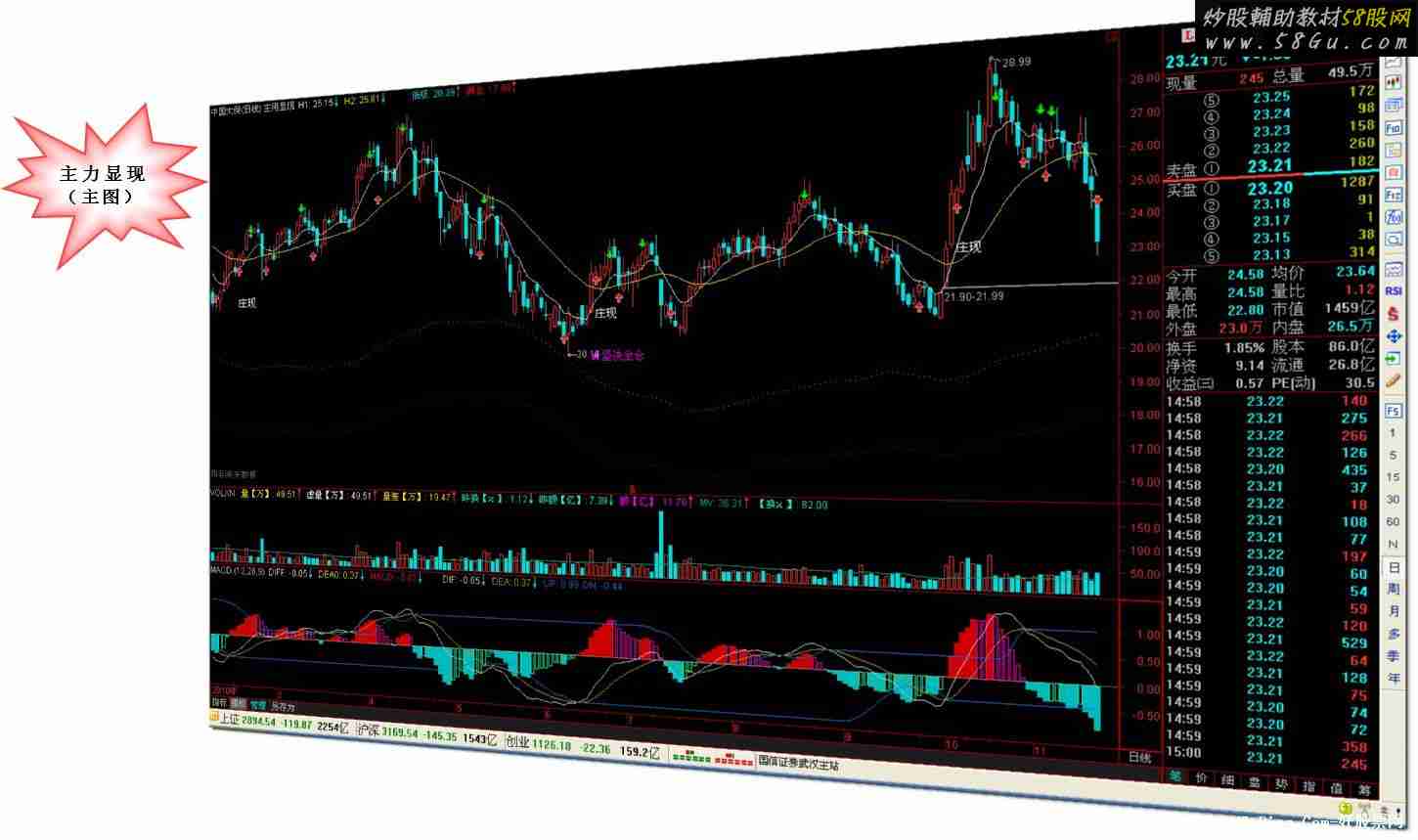 H1:EMA(C,8); H2:EMA(H1,20); VR1:=(HHV(H,36)-C)/(HHV(H,36)-LLV(L,36))*100; VR2:=SMA(VR1,5,1); VR3:=SMA(VR2,8,1); VAR4:=CROSS(VR2,VR3) AND VR3< 20; VAR5:=C>LLV(C,60)*1.13 AND VAR4; VAR6:=IF(C>200,VAR4,VAR5); HH2:=XMA(CLOSE,14); HH3:=MEMA(CLOSE,4); VAR1:=(CLOSE-LLV(LOW,60.135))/(HHV(HIGH,60.135)-LLV(LOW,60))*80; VAR2:=SMA(VAR1,7,1); VAR3:=SMA(VAR2,5,1); AA1:=AMOUNT/VOL; BB1:=L<AA1*0.9; CC1:=(C-REF(C,1))/REF(C,1)*100>1.2; DD1:=L<MA(C,5)*0.921; EE1:=VOL<MA(V,5)*1.5; FF1:=BB1 AND CC1 AND DD1 AND EE1; DRAWTEXT(FF1,L*0.99,'庄影'),COLORYELLOW; AA:=CROSS(MA(C,5),MA(C,20)) AND CROSS(MA(C,5),MA(C,30)) AND CROSS(MA(C,5),MA(C,60)); BB:=MA(C,60)>MA(C,10) AND CROSS(MA(C,10),MA(C,30)) AND MA(C,30)>MA(C,20) AND ABS(MA(C,60)-MA(C,20))/MA(C,20)<0.05; CC:=MA(C,30)>MA(C,5) AND CROSS(MA(C,5),MA(C,20)) AND MA(C,20)>MA(C,10), COLORYELLOW; DD:=ABS((MA(C,5)-MA(C,10))+(MA(C,10)-MA(C,20))+(MA(C,20)-MA(C,30)))<0.02 AND MA(C,5)>REF(MA(C,5),1) AND MA(C,10)>REF(MA(C,10),1); EE:=MA(C,20)>MA(C,5) AND CROSS(MA(C,5),MA(C,10)) AND MA(C,10)>MA(C,60) AND ABS(MA(C,20)-MA(C,60))/MA(C,60)<0.05; FF:=AA OR BB OR CC OR DD OR EE ; HH1:=FF AND FILTER( FF,8); DRAWICON(HH1,L,1); DRAWTEXT(HH1,L*0.958,'庄现'),COLORWHITE; DRAWICON(LONGCROSS(HH2,HH3,1),HH2*0.958,1),COLORRED; DRAWICON(LONGCROSS(HH3,HH2,1),HH3*1.03,2),COLORGREEN; DRAWTEXT(CROSS(VAR2,VAR3) AND VAR2<20 AND HH2>HH3,HH2*0.9165,'★坚决全仓'),COLORMAGENTA;低吸:0.82*MA(FORCAST(CLOSE,2),40),COLORF7E300,POINTDOT; 满仓:0.72*MA(FORCAST(CLOSE,2),40),POINTDOT,COLOR0000FF;
