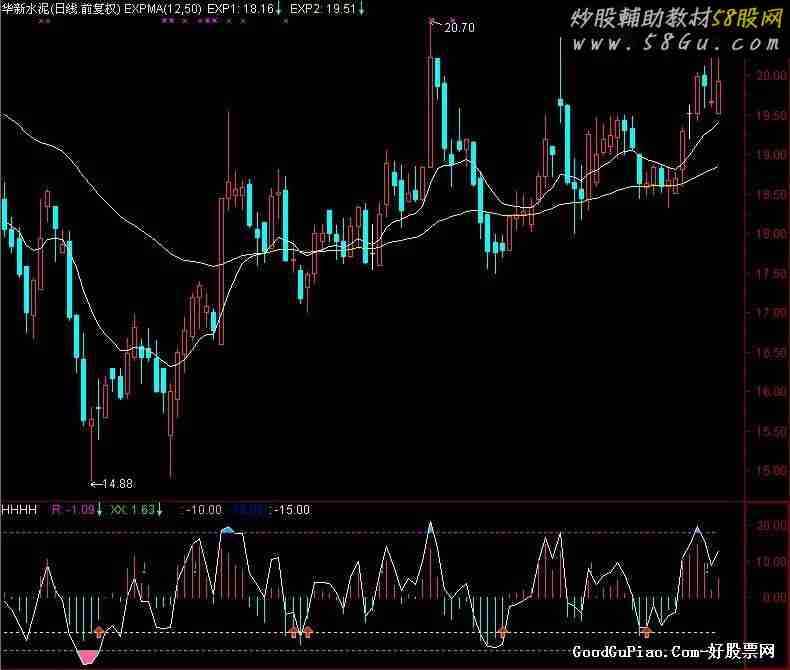 R1:=(RSI-50)/1.5;{将RSI指标转换到零轴附近并按比例缩小} DRAWBAND(R1,RGB(0,180,255),18,RGB(00,00,00)); R2:=IF(R1>=0,0,R1); DRAWBAND(-15,RGB(255,100,155),R2,RGB(00,00,00)); R:R1; F:=100*(C/REF(C,1)-1);{单日涨幅} MAR:=EMA(R,13);{均} XX:R-MAR,COLORSTICK; GD:=(C=HHV(C,5) OR H=HHV(H,5)); 排除1:=NOT(GD OR REF(GD,1)); 排除2:=NOT(EXIST(F<-9,3)); 排除3:=C/EXPMA(C,50)-1<0.1; 入:DRAWICON(CROSS(XX,-10) AND 排除1 AND 排除2 AND 排除3,-10,1); CHUTJ:=XX<REF(XX,1) AND REF(XX,1)>REF(XX,2); 出:DRAWTEXT(FILTER(COUNT(CHUTJ,BARSLAST(入))=2 AND XX>0,6) ,10,'!'),COLORGREEN;-10,POINTDOT; 18,POINTDOT; -15,POINTDOT; |