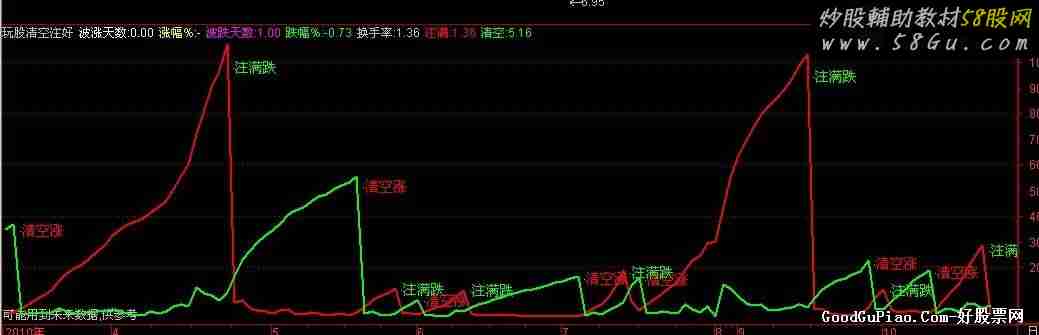 波段线:=ZIG(3,7),COLORWHITE; 波涨天数:BARSLASTCOUNT(波段线>REF(波段线,1)),NODRAW; VAR1:=(C-REF(C,波涨天数))/REF(C,波涨天数)*100; 涨幅%:IF(波涨天数>0,VAR1, DRAWNULL),NODRAW; 波跌天数:BARSLASTCOUNT(波段线<REF(波段线,1)),NODRAW; VAR2:=(C-REF(C,波跌天数))/REF(C,波跌天数)*100; 跌幅%:IF(波跌天数>0,VAR2, DRAWNULL),NODRAW; 换手率:VOL/CAPITAL*100,NODRAW; 注满:IF(波涨天数>=0,SUM(换手率,波涨天数+1),DRAWNULL),LINETHICK2,COLORRED; 清空:IF(波跌天数>=0,SUM(换手率,波跌天数+1),DRAWNULL),LINETHICK2,COLORGREEN; DRAWTEXT(CROSS(注满,清空),REF(清空,1)/1.1,'清空涨'),COLORRED; DRAWTEXT(CROSS(清空,注满),REF(注满,1)/1.1,'注满跌'),COLORGREEN;