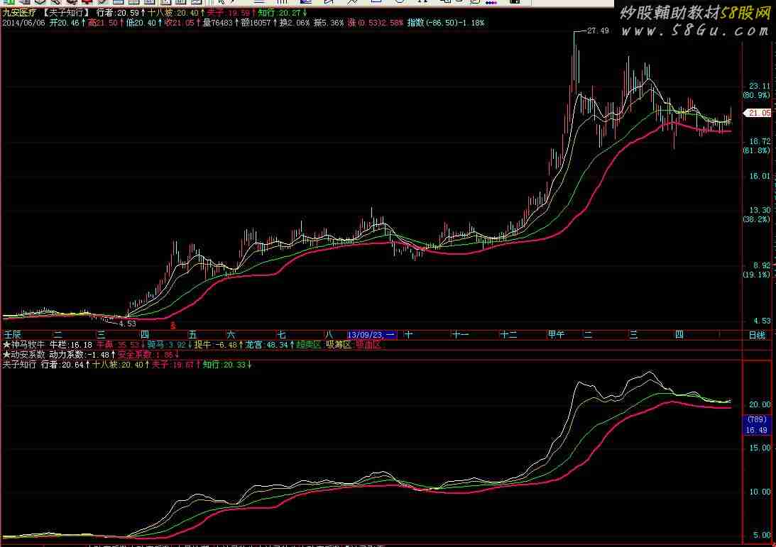 行者:(EMA(H,9)*8.09+EMA(L,18)*1.91)/10,COLORWHITE; 十八坡:(EMA(C,18)+(EMA(H,18)+EMA(L,18))/2)/2,COLOR00CCCC; 夫子:DMA(ema(LLV(H,18),18),(SUM(VOL,36)/REF(SUM(VOL,90),1))),COLOR6600FF,LINETHICK2; 知行:eMA((夫子+(行者-夫子)*0.618),18),COLORGREEN;