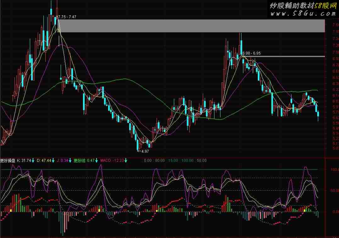 WRX:=(HHV(H,9)-C)/(HHV(H,9)-LLV(LOW,9))*100-70; MWR:=SMA(WRX,9,1)+100; RSV:=(C-LLV(L,9))/(HHV(H,9)-LLV(L,9))*100; K:SMA(RSV,3,1); D:SMA(K,3,1),; J:3*K-2*D; D1:=D+100; 多空差:=D1-MWR; 更好线:多空差/2-30,COLORGREEN,DOTLINE; GL:=(C-MA(C,6))/MA(C,6)*100+40; DIF:=EMA(C,6) - EMA(C,13); DEA:=EMA(DIF,5); MACD:300*(DIF-DEA),COLORSTICK,COLORLIMAGENTA; STICKLINE(MACD>=0,MACD,0,1,1),COLORRED; STICKLINE(MACD<=0,MACD,0,1,1),COLORLICYAN; STICKLINE(MACD<REF(MACD,1)AND MACD>0,0,MACD,1,1),COLORGREEN; STICKLINE(MACD>REF(MACD,1)AND MACD<0,0,MACD,1,1),COLORLIRED; STICKLINE(REF(更好线,1)<更好线 AND 更好线<0,更好线,更好线+1.5{REF(GH,1)},2,0),COLORLIMAGENTA; 持有:STICKLINE(更好线>REF(更好线,1)AND 更好线>0,更好线,更好线+1.5,2,0),COLORRED; STICKLINE(CROSS(更好线,0),0,更好线+1.5,2,0),COLORYELLOW; STICKLINE(MACD<0 AND REF(MACD<REF(MACD,1),1)AND MACD>REF(MACD,1),0,MACD,1,0),COLORLIRED; 0,COLORGRAY,DOTLINE;80,COLORBROWN,DOTLINE;15,COLORLICYAN,DOTLINE;100,COLORLICYAN;50,COLORGRAY,DOTLINE;