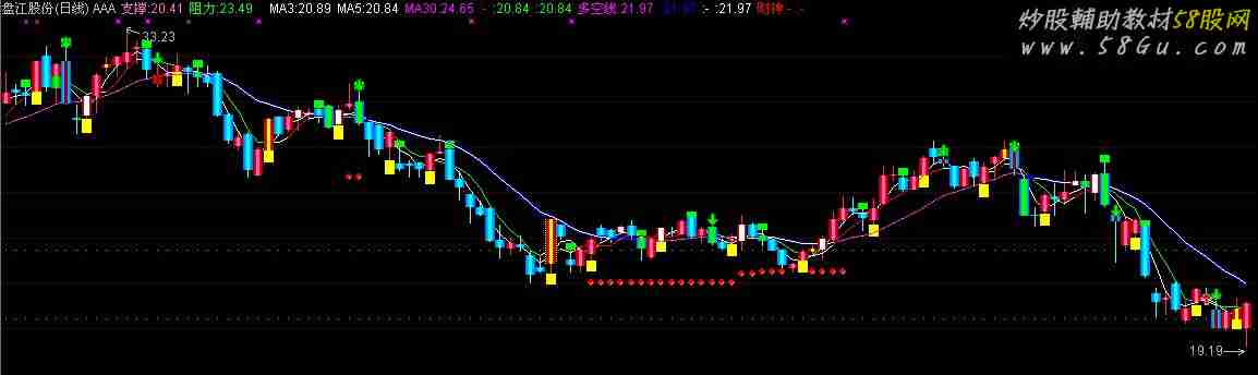 V1:=ABS((2*CLOSE+HIGH+LOW)/4-MA(CLOSE,20))/MA(CLOSE,20); V2:=(1-7/100)*(DMA(CLOSE,V1)); V3:=(1+7/100)*(DMA(CLOSE,V1)); V5:=MA((LOW+HIGH+CLOSE)/3,5); 支撑:REFDATE(V2,DATE),POINTDOT,LINETHICK3,COLORCC66FF; 阻力:REFDATE(V3,DATE),POINTDOT,LINETHICK3,COLORGREEN; VAR1:=CLOSE>REF(CLOSE,1) AND CLOSE>REF(CLOSE,2); VAR2:=REF(VAR1,1) AND CLOSE<=REF(CLOSE,1) AND CLOSE>=REF(CLOSE,2); VAR3:=REF(VAR2,1) AND CLOSE>=REF(CLOSE,1) AND CLOSE<=REF(CLOSE,2); VAR4:=REF(VAR3,1) AND CLOSE<=REF(CLOSE,1) AND CLOSE>=REF(CLOSE,2); VAR5:=REF(VAR4,1) AND CLOSE>=REF(CLOSE,1) AND CLOSE<=REF(CLOSE,2); VAR6:=REF(VAR5,1) AND CLOSE<=REF(CLOSE,1) AND CLOSE>=REF(CLOSE,2); VAR7:=REF(VAR6,1) AND CLOSE>=REF(CLOSE,1) AND CLOSE<=REF(CLOSE,2); VAR8:=REF(VAR7,1) AND CLOSE<=REF(CLOSE,1) AND CLOSE>=REF(CLOSE,2); VAR9:=REF(VAR8,1) AND CLOSE>=REF(CLOSE,1) AND CLOSE<=REF(CLOSE,2); VARA:=REF(VAR9,1) AND CLOSE<=REF(CLOSE,1) AND CLOSE>=REF(CLOSE,2); VARB:=REF(VARA,1) AND CLOSE>=REF(CLOSE,1) AND CLOSE<=REF(CLOSE,2); VARC:=REF(VARB,1) AND CLOSE<=REF(CLOSE,1) AND CLOSE>=REF(CLOSE,2); VARD:=CLOSE<REF(CLOSE,1) AND CLOSE<REF(CLOSE,2); VARE:=REF(VARD,1) AND CLOSE>=REF(CLOSE,1) AND CLOSE<=REF(CLOSE,2); VARF:=REF(VARE,1) AND CLOSE<=REF(CLOSE,1) AND CLOSE>=REF(CLOSE,2); VAR10:=REF(VARF,1) AND CLOSE>=REF(CLOSE,1) AND CLOSE<=REF(CLOSE,2); VAR11:=REF(VAR10,1) AND CLOSE<=REF(CLOSE,1) AND CLOSE>=REF(CLOSE,2); VAR12:=REF(VAR11,1) AND CLOSE>=REF(CLOSE,1) AND CLOSE<=REF(CLOSE,2); VAR13:=REF(VAR12,1) AND CLOSE<=REF(CLOSE,1) AND CLOSE>=REF(CLOSE,2); VAR14:=REF(VAR13,1) AND CLOSE>=REF(CLOSE,1) AND CLOSE<=REF(CLOSE,2); VAR15:=REF(VAR14,1) AND CLOSE<=REF(CLOSE,1) AND CLOSE>=REF(CLOSE,2); VAR16:=REF(VAR15,1) AND CLOSE>=REF(CLOSE,1) AND CLOSE<=REF(CLOSE,2); VAR17:=REF(VAR16,1) AND CLOSE<=REF(CLOSE,1) AND CLOSE>=REF(CLOSE,2); VAR18:=REF(VAR17,1) AND CLOSE>=REF(CLOSE,1) AND CLOSE<=REF(CLOSE,2); VAR19:=REF(VARD OR VARE OR VARF OR VAR10 OR VAR11 OR VAR12 OR VAR13 OR VAR14 OR VAR15 OR VAR16 OR VAR17 OR VAR18,1) AND VAR1; STICKLINE(VAR19,L,L*0.98,3,0),COLORYELLOW; VAR1A:=REF(VAR1 OR VAR2 OR VAR3 OR VAR4 OR VAR5 OR VAR6 OR VAR7 OR VAR8 OR VAR9 OR VARA OR VARB OR VARC,1) AND VARD; STICKLINE(VAR1A,H*1.01,H,3,0),COLOR00FF00{98FD}; MA3:MA(C,3); MA5:MA(C,5),COLORWHITE; MA10:=MA(C,10),NODRAW; MA30:MA(C,34),NODRAW; 五日乖离率:=(C-MA5)/MA5*100; BB5:=ATAN((MA5/REF(MA5,1)-1)*100)*180/3.1416; IF(BB5>30 AND MA5>REF(MA5,1), MA5,DRAWNULL),LINETHICK1,COLORRED; BB10:=ATAN((MA10/REF(MA10,1)-1)*100)*180/3.1416; IF(BB5<0 AND MA5<REF(MA5,1), MA5,DRAWNULL),LINETHICK1,COLORGREEN; DD5:=MA5<REF(MA5,1); IF(DD5,MA5,DRAWNULL),COLOR00FF00; X:=(3*C+L+O+H)/6; 多空线:(20*X+19*REF(X,1)+18*REF(X,2)+17*REF(X,3)+16*REF(X,4)+15*REF(X,5)+14*REF(X,6) +13*REF(X,7)+12*REF(X,8)+11*REF(X,9)+10*REF(X,10)+9*REF(X,11)+8*REF(X,12) +7*REF(X,13)+6*REF(X,14)+5*REF(X,15)+4*REF(X,16)+3*REF(X,17)+2*REF(X,18)+ REF(X,20))/210,COLORFF00FF,LINETHICK1; {用法:黄托底买进,绿压顶买出。} DD:=多空线<REF(多空线,1); IF(DD,多空线,DRAWNULL),COLORBLUE,LINETHICK2; A:=(MA5>多空线); IF(A,多空线,DRAWNULL),COLORYELLOW,POINTDOT; A1:=(MA5<多空线); IF(A1,多空线,DRAWNULL),COLORWHITE; A2:=3*EMA((C-LLV(L,30))/(HHV(H,30)-LLV(L,30))*100,5)-2*EMA((C-LLV(L,30))/(HHV(H,30)-LLV(L,30))*100,5); A4:=(HHV(H,34)-C)/(HHV(H,34)-LLV(L,34))*100; A5:=EMA(CLOSE,12)-EMA(CLOSE,26); A6:=EMA(A5,9); A7:=(A5<-0.1 AND A5>A6); 财神:IF(A7,LLV(L,21),DRAWNULL)COLORRED,CIRCLEDOT; CYS:=(EMA((CLOSE-V2)/V2,1)*100); AA:=CYS; MIDD:=MA(CYS,20); CC:=MIDD+0.85*STD(CYS,10); TM6:=AA>CC; IF(TM6,MA5,DRAWNULL),COLORRED,LINETHICK1; A0:=(L+H+C*2)/4; 工作:=EMA(A0,14)COLORYELLOW,LINETHICK1; 度假:=EMA(A0,25)COLORYELLOW,LINETHICK1; A1X:=(工作-REF(工作,1))/REF(工作,1)*100; A2X:=(度假-REF(度假,1))/REF(度假,1)*100; G:=BARSLAST(CROSS(A1X,0)); {KDJ} RSV:=(CLOSE-LLV(LOW,9))/(HHV(HIGH,9)-LLV(LOW,9))*100; K:=SMA(RSV,3,1); D:=SMA(K,3,1); J:=3*K-2*D; 金叉:=CROSS(J,D); 死叉:=CROSS(D,J); 买1:=(VAR14 OR VAR15) AND VAR11; 买2:=(VAR14 OR VAR15) AND VAR4; 买3:=(VAR14 OR VAR15) AND VAR2; 买4:=(VAR2 AND VAR11) OR (VAR4 AND VAR11); 买5:=(金叉 AND VAR4) OR (金叉 AND VAR2) OR (金叉 AND VAR11); {涨停} STICKLINE(CLOSE>REF(CLOSE,1)*1.0985 AND CLOSE=HIGH,CLOSE,OPEN,4,-1),COLOR00FFFF; {跌停} STICKLINE(CLOSE<REF(CLOSE,1)*0.9015 AND CLOSE=LOW,CLOSE,OPEN,4,-1),COLORGREEN; {蓝} STICKLINE(OPEN>=CLOSE,CLOSE,OPEN,3,0),COLORFF7700; STICKLINE(OPEN>=CLOSE,CLOSE,OPEN,2.2,0),COLORFF9900; STICKLINE(OPEN>=CLOSE,CLOSE,OPEN,1.5,0),COLORFFBB00; STICKLINE(OPEN>=CLOSE,CLOSE,OPEN,0.5,0),COLORCYAN; {红} STICKLINE(CLOSE>OPEN,CLOSE,OPEN,3,0),COLOR000099; STICKLINE(CLOSE>OPEN,CLOSE,OPEN,2.2,0),COLOR0000CC; STICKLINE(CLOSE>OPEN,CLOSE,OPEN,1.5,0),COLOR0000FF; STICKLINE(CLOSE>OPEN,CLOSE,OPEN,0.5,0),COLORCC66FF; {绿} STICKLINE(VAR3,OPEN,(OPEN+CLOSE)/2,3,0),COLOR009900; STICKLINE(VAR3,OPEN,(OPEN+CLOSE)/2,2.2,0),COLOR00BB00; STICKLINE(VAR3,OPEN,(OPEN+CLOSE)/2,1.5,0),COLOR00DD00; STICKLINE(VAR3,OPEN,(OPEN+CLOSE)/2,0.5,0),COLOR00FF00; {灰} STICKLINE(VAR4,OPEN,(OPEN+CLOSE)/2,3,0),COLOR999999; STICKLINE(VAR4,OPEN,(OPEN+CLOSE)/2,2.2,0),COLORBBBBBB; STICKLINE(VAR4,OPEN,(OPEN+CLOSE)/2,1.5,0),COLORDDDDDD; STICKLINE(VAR4,OPEN,(OPEN+CLOSE)/2,0.5,0),COLORFFFFFF; STICKLINE(金叉,OPEN,CLOSE,0.5,0),COLORYELLOW; STICKLINE(死叉,OPEN,CLOSE,0.5,0),COLOR000099; DRAWICON(VAR16,LOW-0.02,7); DRAWICON(买1 OR 买2 OR 买3 OR 买4 OR 买5,LOW-0.01,1); DRAWICON(死叉 OR VAR12 OR CROSS(40,VAR9),HIGH+0.01,2); STICKLINE(CROSS(A1X,0),C,O,1,0)COLORFFFFFF; STICKLINE(CROSS(0,A1X),C,O,1,0)COLORGREEN;