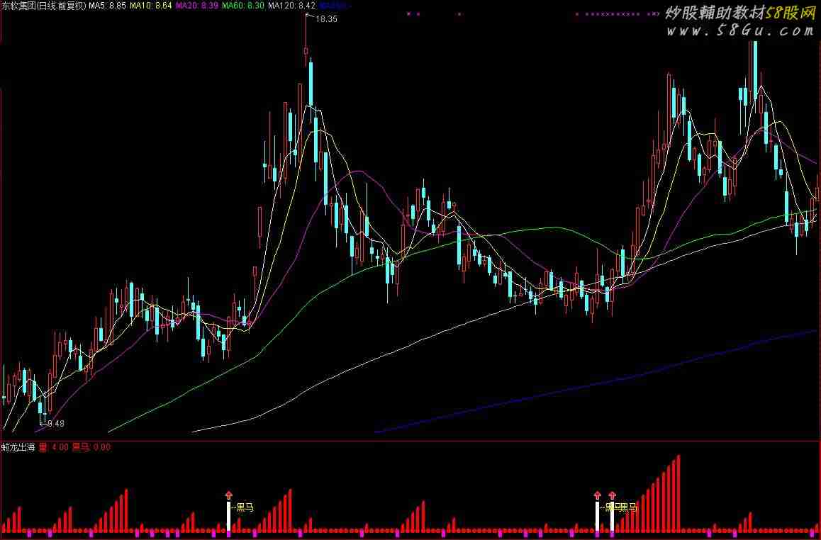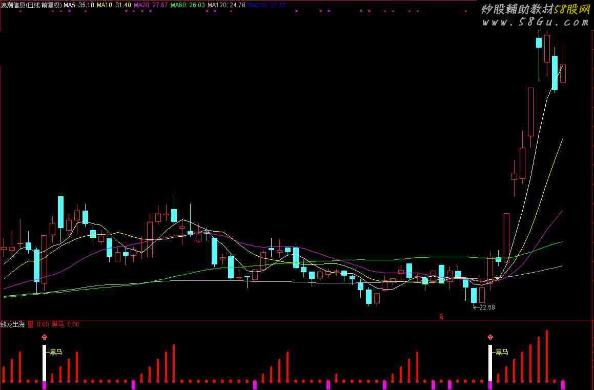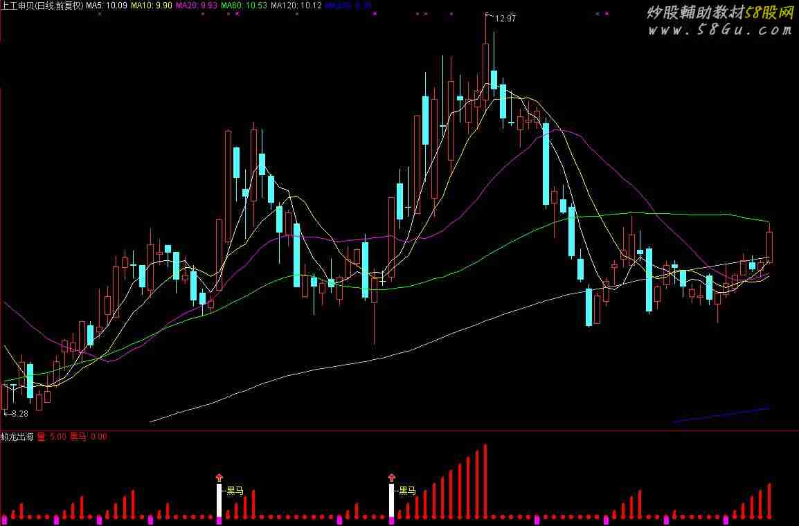 MA5:=MA(C,5); MA10:=MA(C,10); MA20:=MA(C,20); ZF:=(C-O)/O*100>4; BIAS20:=(CLOSE-MA(CLOSE,5))/MA(CLOSE,5)*100*VOL; BIAS21:=(CLOSE-MA(CLOSE,5))/MA(CLOSE,5)*100*C; 量:BARSLAST(BARSLAST(BIAS20>0 AND REF(BIAS20,1)>0)>0),STICK,COLORRED,LINETHICK4; 价:=BARSLAST(BARSLAST(BIAS21>0 AND REF(BIAS21,1)<0)>0),STICK,COLORMAGENTA,LINETHICK4; 黑马:量=0 AND ZF AND CROSS(C,MA5) AND CROSS(C,MA10) AND CROSS(C,MA20),COLORRED,CIRCLEDOT,LINETHICK2; STICKLINE(黑马,0,5,1.5,0),COLORWHITE; DRAWICON(黑马,6,1); DRAWTEXT(黑马,4,'---黑马'),COLORYELLOW; STICKLINE(价,-1,0,1.5,0),COLORMAGENTA;