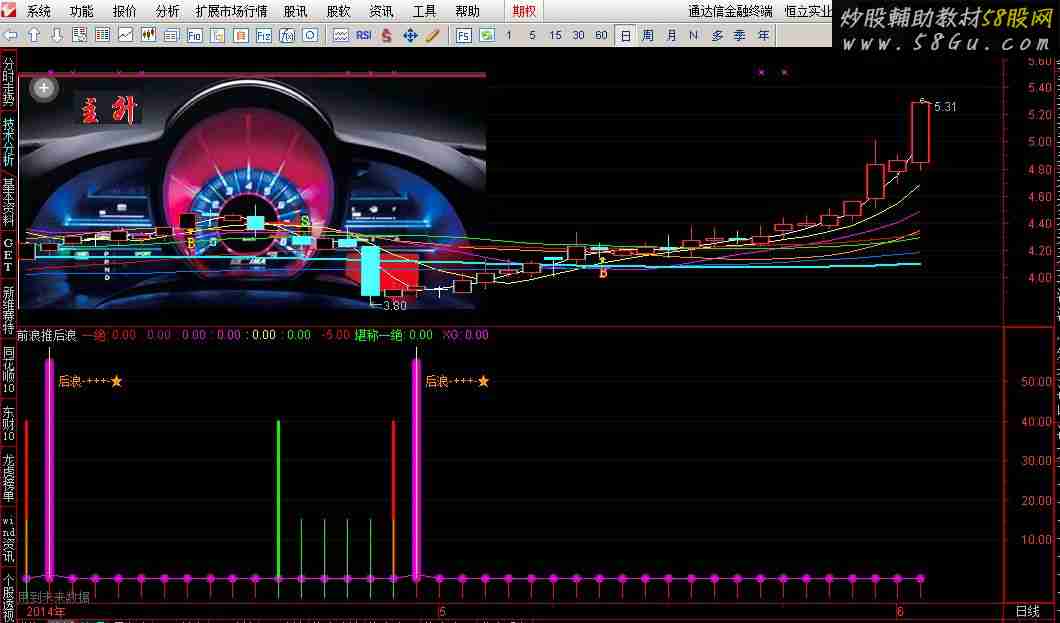 “【长江前浪推后浪】 【轻舟已过山万重】”Q_1:=C-REF(C,1); Q_2:=100*EMA(EMA(Q_1,5),3)/EMA(EMA(ABS(Q_1),5),3); Q_3:=CROSS(EMA(C,15),EMA(C,5)); Q_4:=CROSS(EMA(C,5),EMA(C,15)); Z1:=L=LLV(L,BARSLAST(Q_3)+1); Z2:=LLV(L,BARSLAST(Q_3)+1); Z3:=H=HHV(H,BARSLAST(Q_4)+1); Z4:=HHV(H,BARSLAST(Q_4)+1); Q_A:=DRAWLINE(Z1,Z2,Z3,Z4,0),COLORMAGENTA,LINETHICK1; Y1:=H=HHV(H,BARSLAST(Q_4)+1); Y2:=HHV(H,BARSLAST(Q_4)+1); Y3:=L=LLV(L,BARSLAST(Q_3)+1); Y4:=LLV(L,BARSLAST(Q_3)+1); Q_B:=DRAWLINE(Y1,Y2,Y3,Y4,0),COLORCYAN,LINETHICK1; X1:=LLV(Q_2,2)=LLV(Q_2,7); X2:=COUNT(Q_2<0,2); X3:=CROSS(Q_2,MA(Q_2,2)); X4:=REF(Q_B,1)<REF(Q_B,2); X5:=Q_A>REF(Q_B,1); 买进:=(X1 AND X2 AND X3) AND X4 AND X5; TJ:=IF(Q_A<REF(Q_A,1) AND Q_B=Q_A,1,0); TJ1:=IF(Q_B<REF(Q_B,1) AND Q_B=Q_A,1,0); 一绝:IF(REF(TJ1,1)=0 AND TJ1>=1 ,40,0),STICK,COLORRED,LINETHICK3; IF(REF(一绝,1)=40 ,55,0),STICK,COLORBB00BB,LINETHICK9; IF(REF(一绝,1)=40 ,55,0),STICK,COLORDD00DD,LINETHICK6; IF(REF(一绝,1)=40 ,55,0),STICK,COLORFF00FF,LINETHICK3; IF(REF(一绝,1)=40 ,59,0),STICK,COLOR00FFFF,LINETHICK1; IF(REF(TJ,1)=0 AND TJ>=1,40,0),STICK,COLORGREEN,LINETHICK3; IF(REF(TJ1,1)=0 AND TJ1>=1,40,-5),STICK,COLORRED,LINETHICK1; 堪称一绝:IF(REF(TJ,1)=0 AND TJ>=1,40,0),STICK,COLORGREEN,LINETHICK1; {持币:IF(Q_B<REF(Q_B,1) AND Q_B<Q_A,10,0),STICK,COLORRED;}; STICKLINE(Q_B<REF(Q_B,1),15,-5,0,0)COLORGREEN; XG:REF(一绝,1)=40; DRAWTEXT(XG,50,' 后浪-+++-★'),COLORFFFF00,COLOR0099FF;   |
